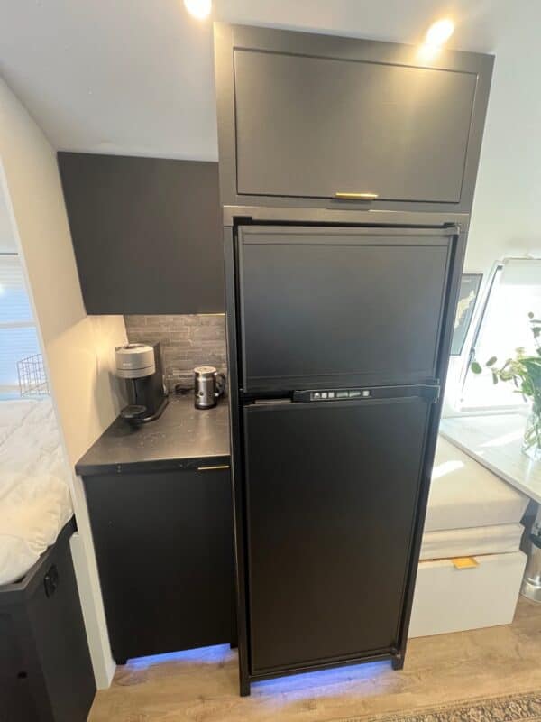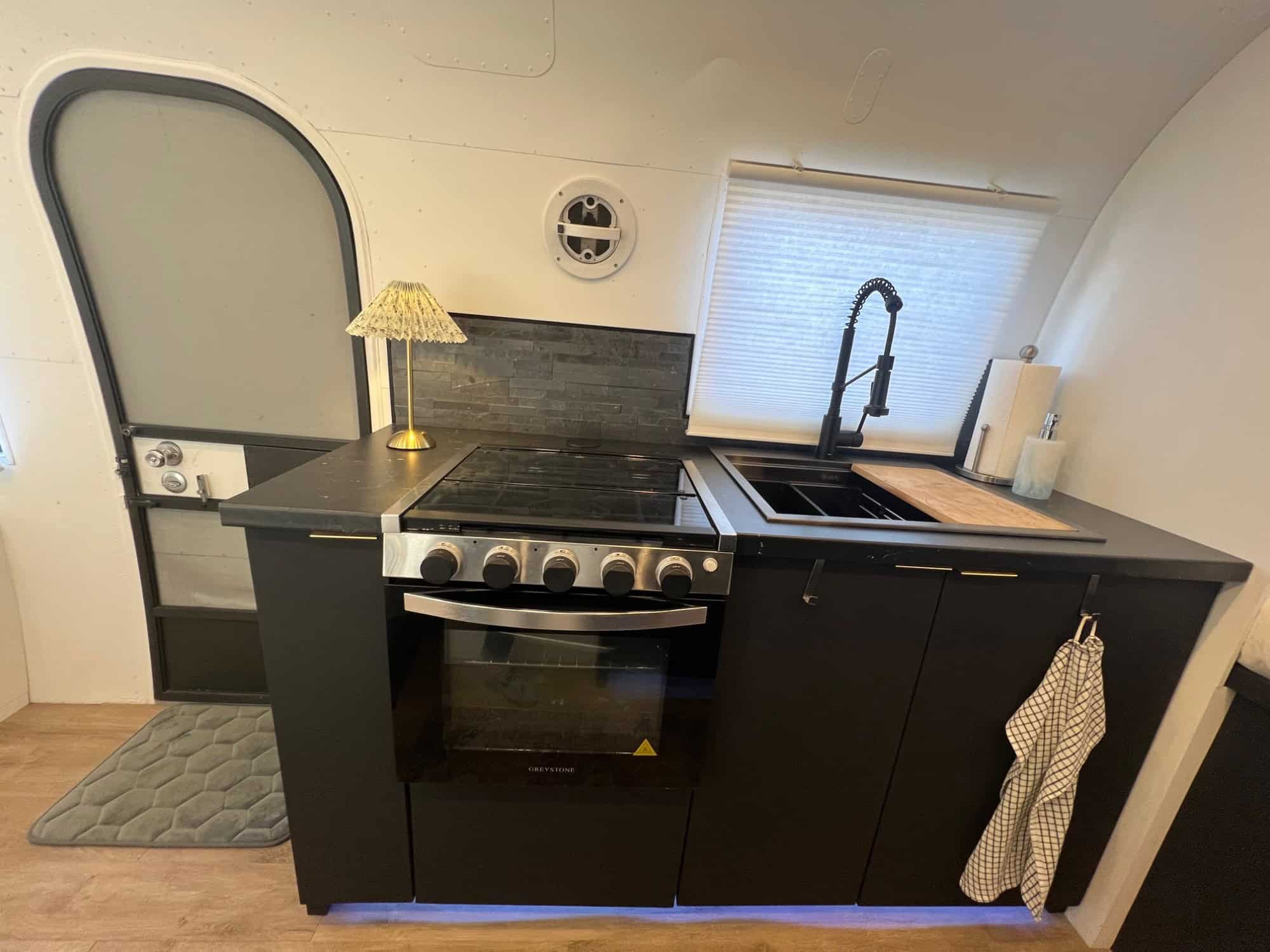 • Fully Equipped Kitchen: Brand-new appliances, including a propane/electric/12V fridge, 3 burner propane stove with oven, and new deep sink. Perfect for preparing meals on the go or hosting friends in style. Seating in the dining area expands to seat 4 people.