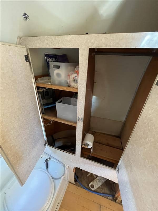 Front dinette hardware still present under the full sized bed platform – could easily be removed