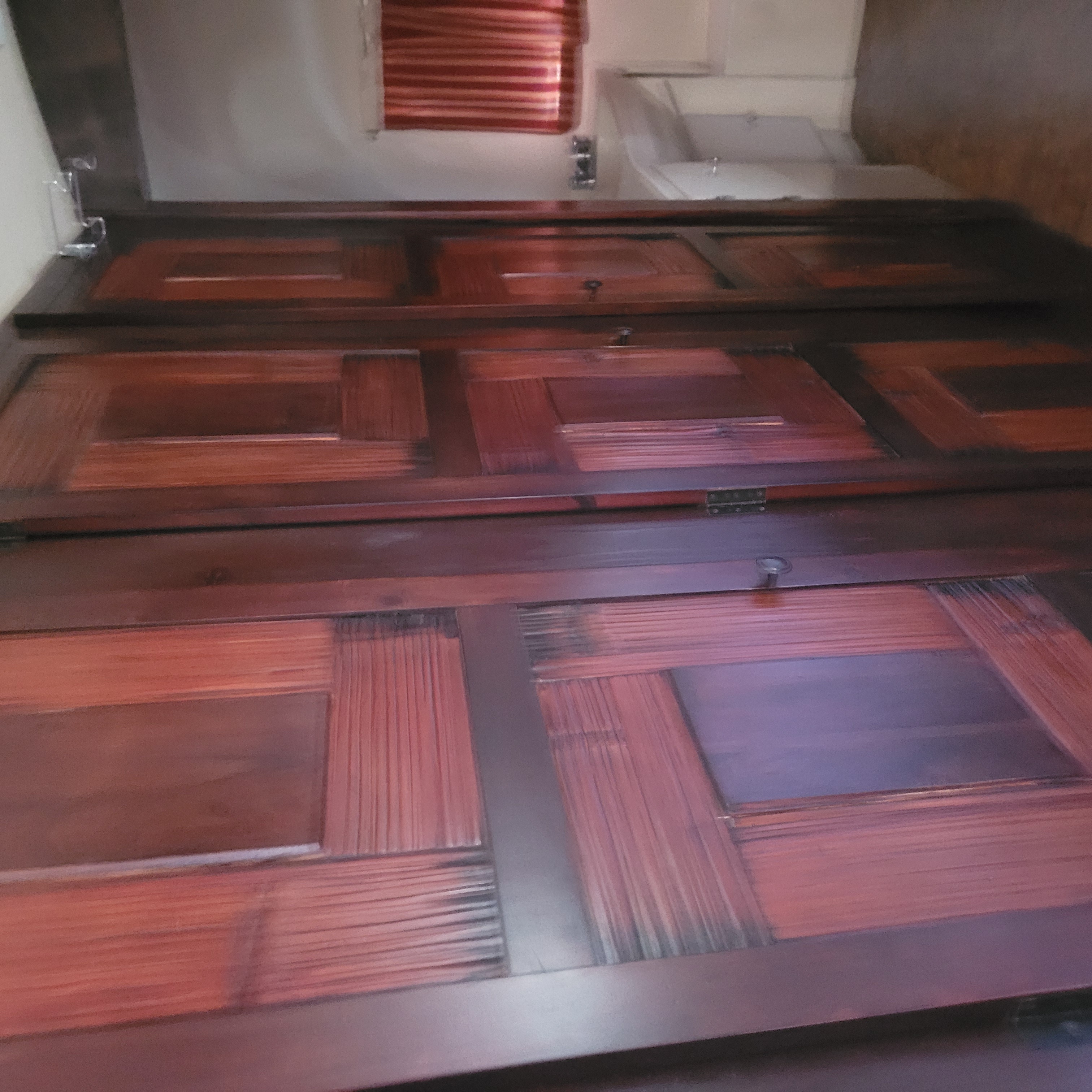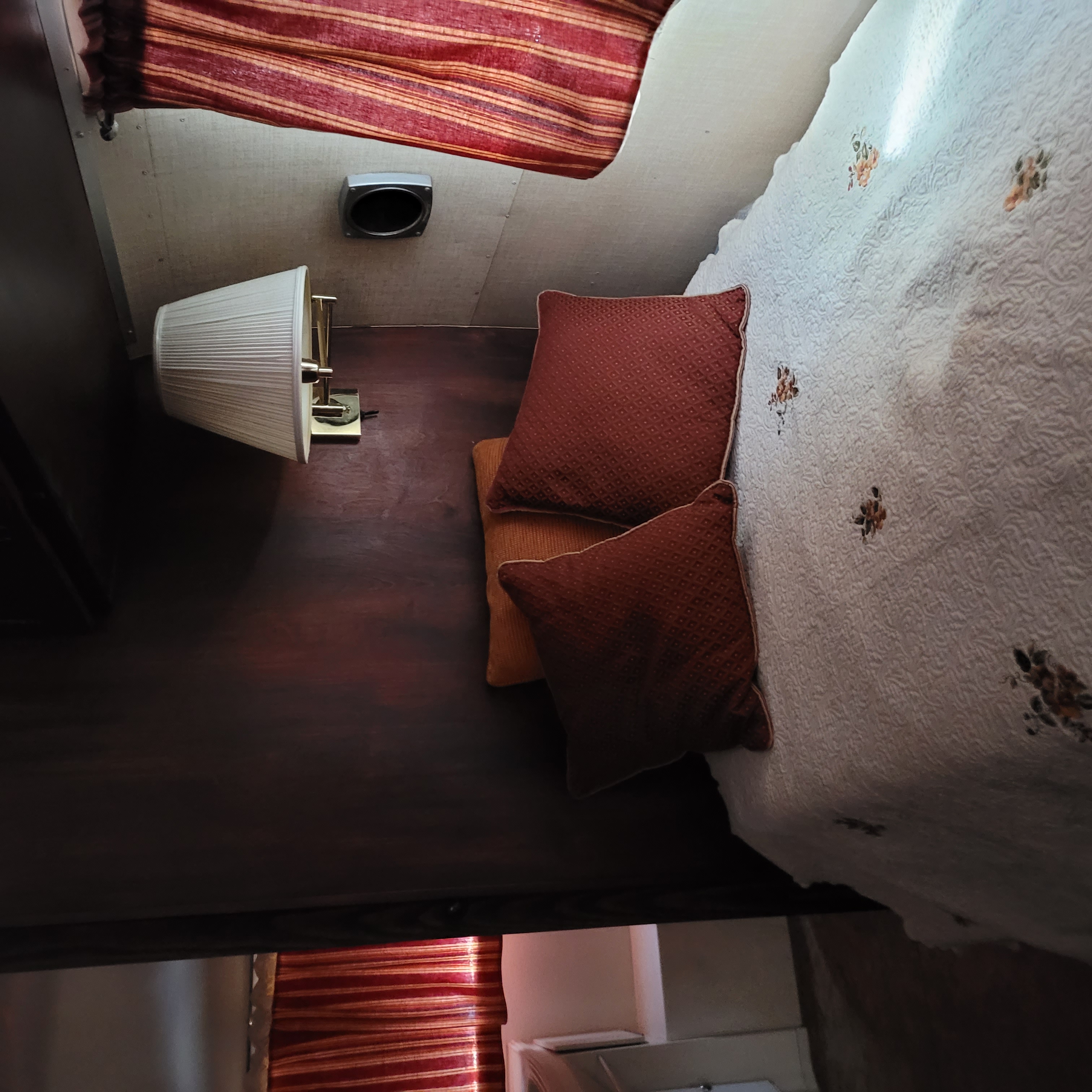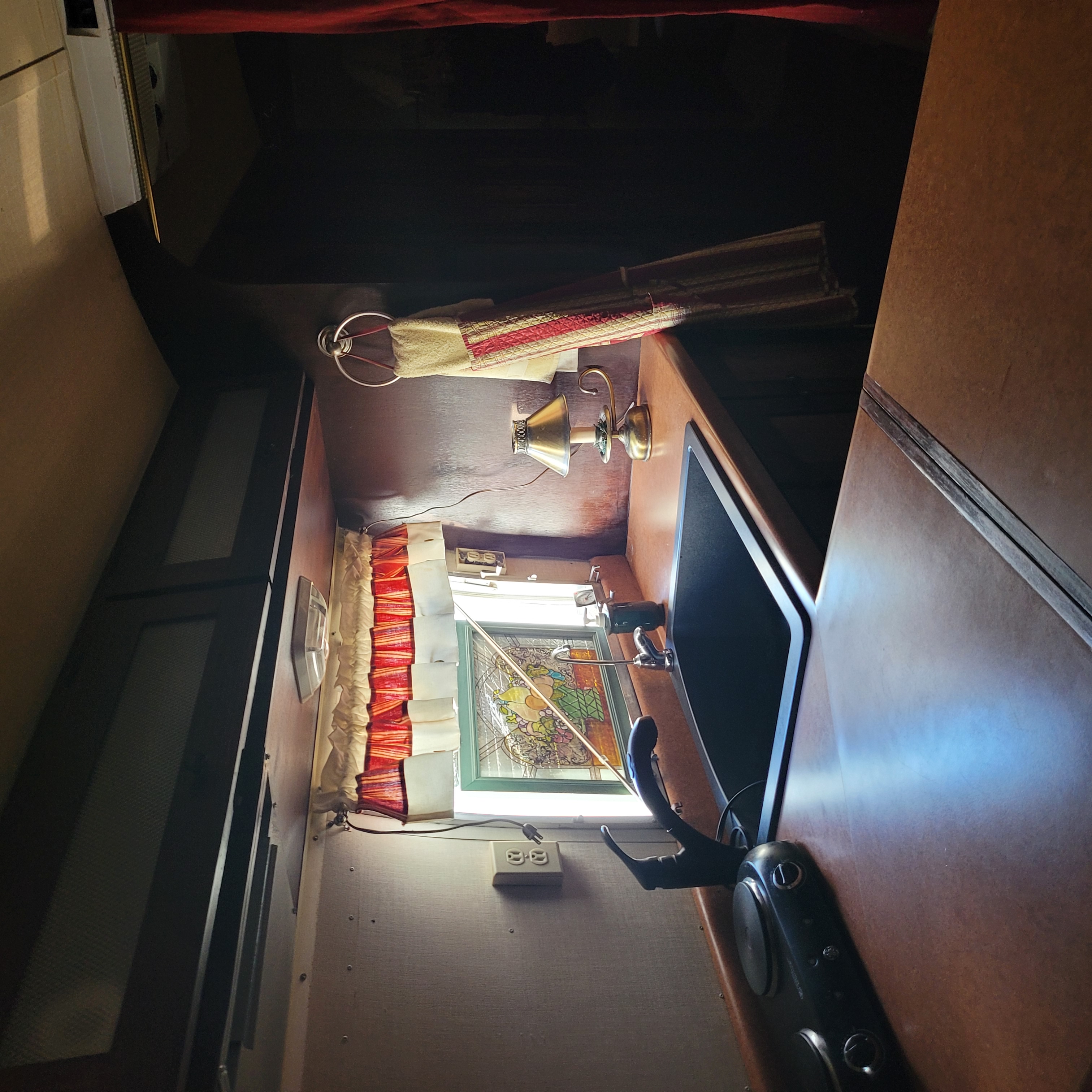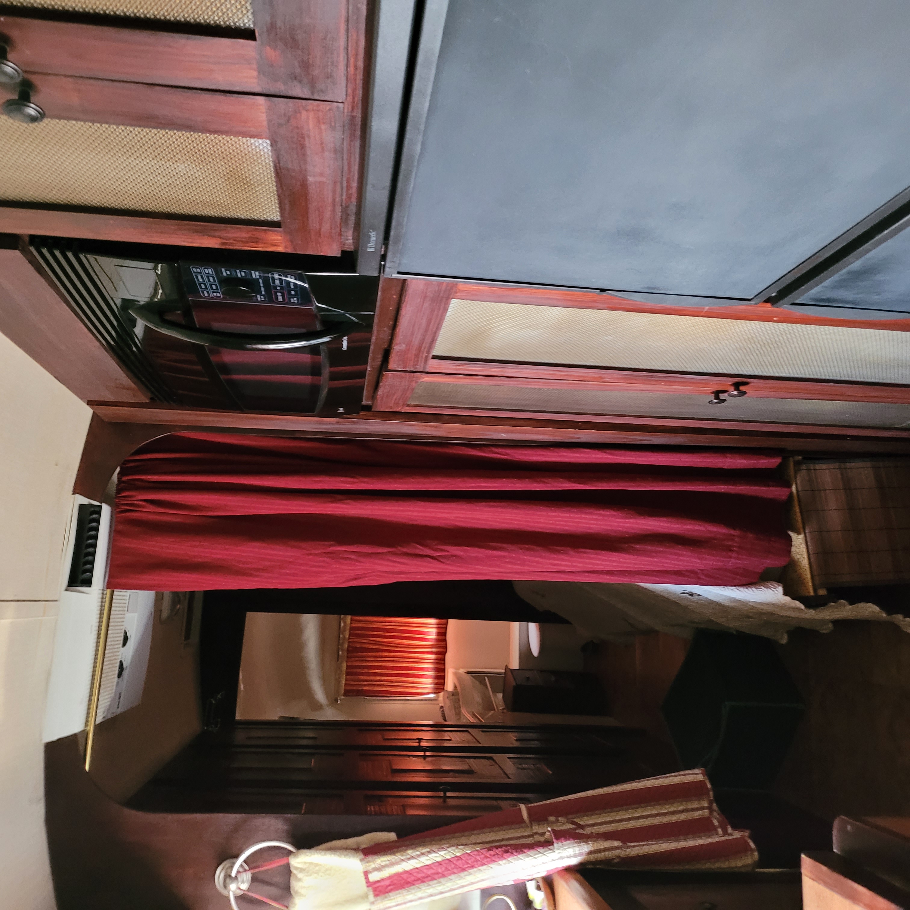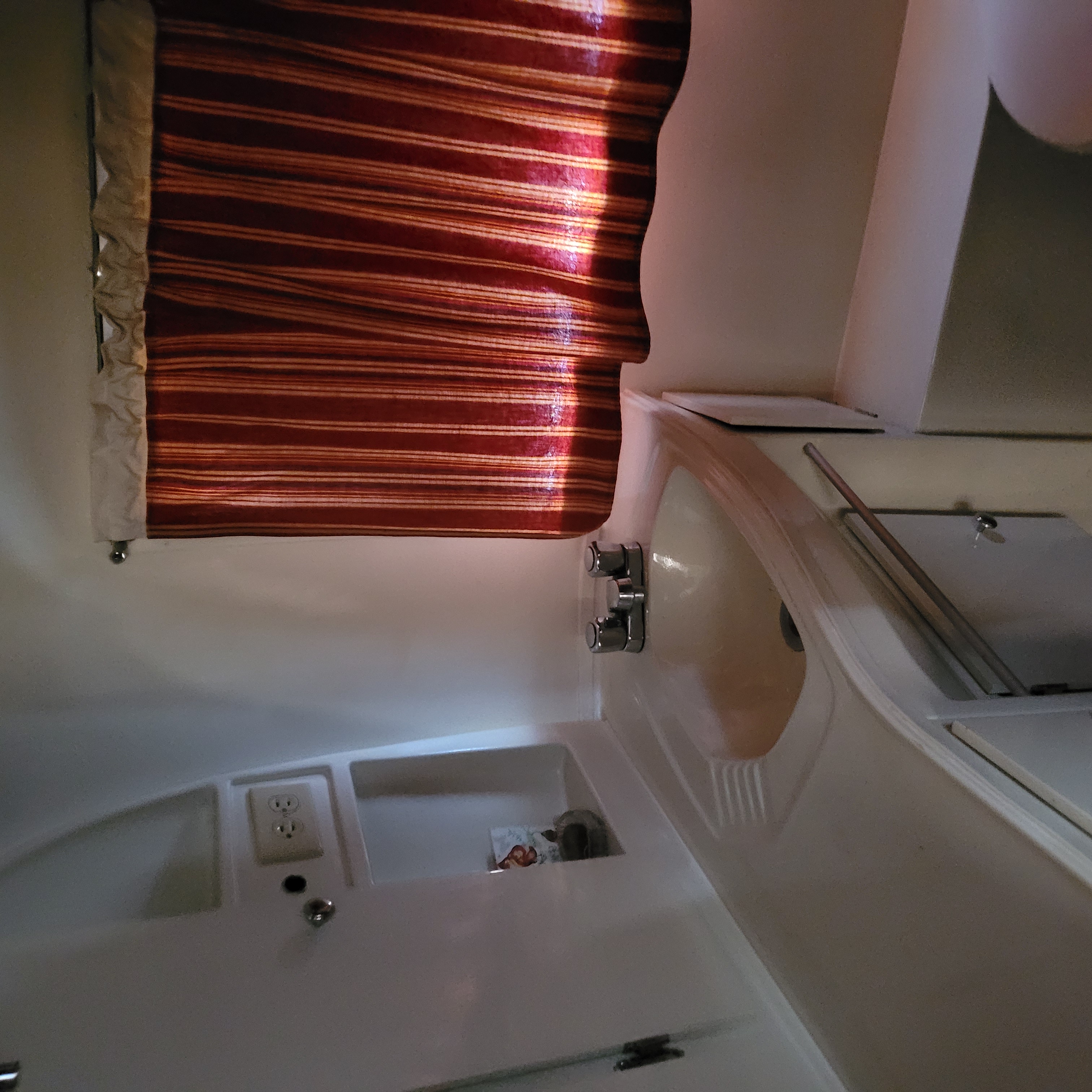 New faucets, curved shower curtain rod, Thetford RV toilet. Solid stained wood pocket door for privacy.