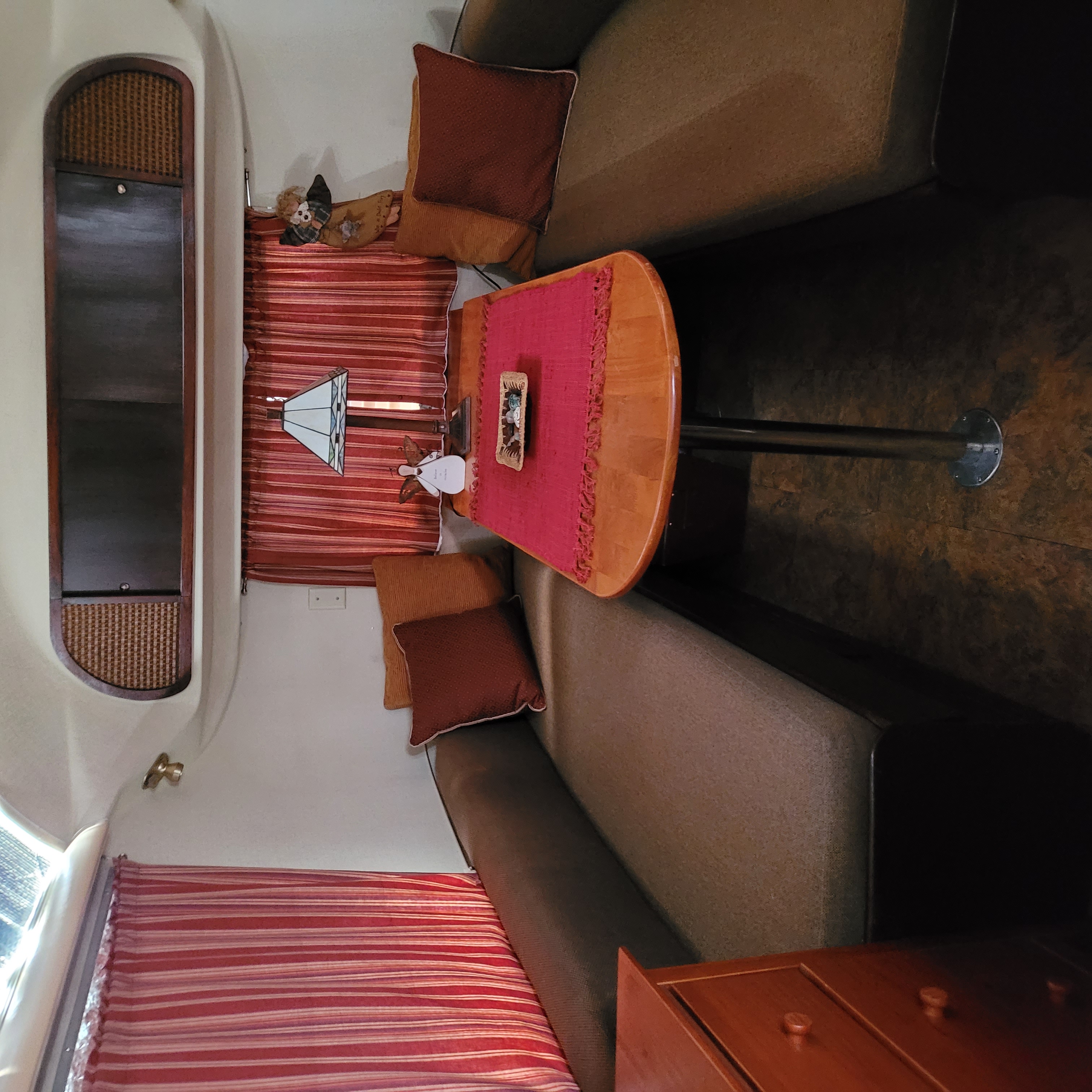 Dining area has original benches with vast space for storage. Cushions have removable zippered covers. Very large and provide two more sleeping locations.