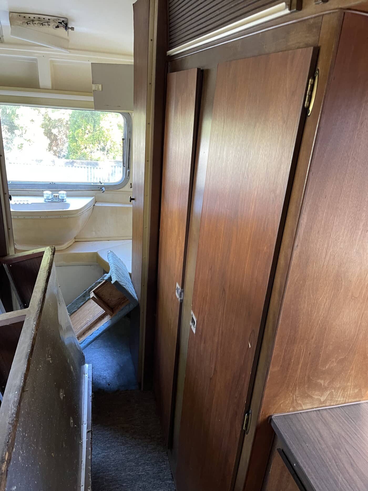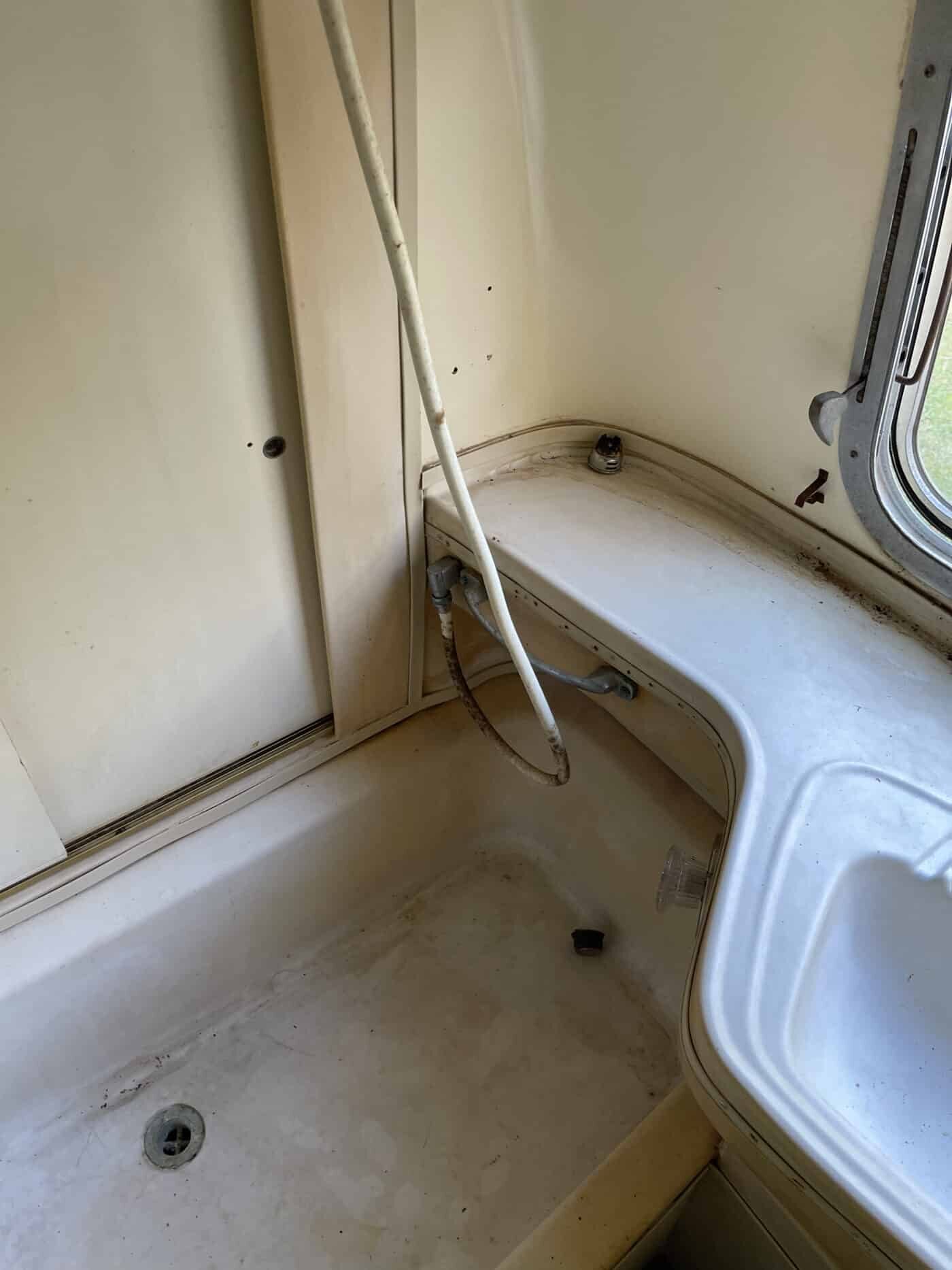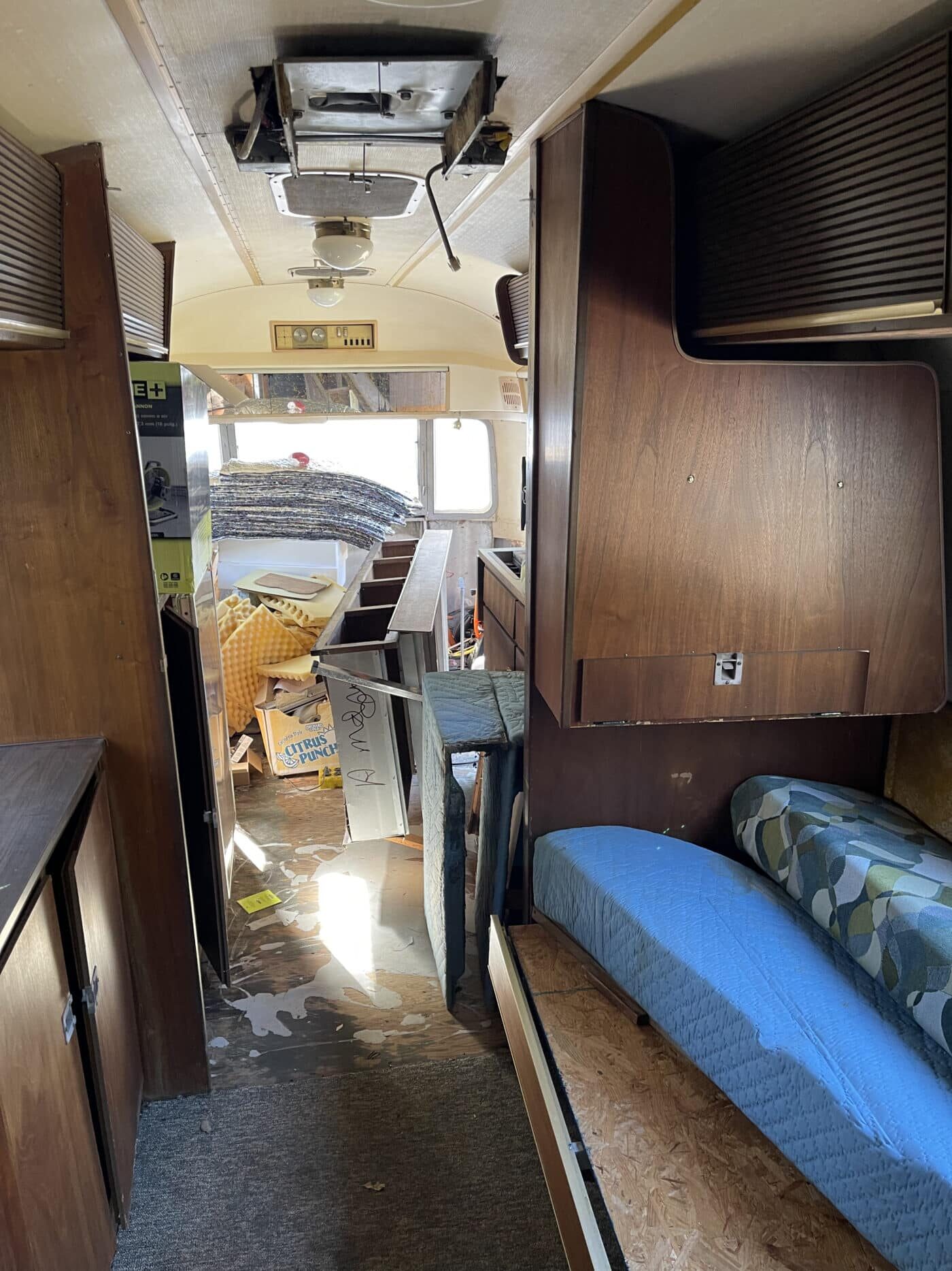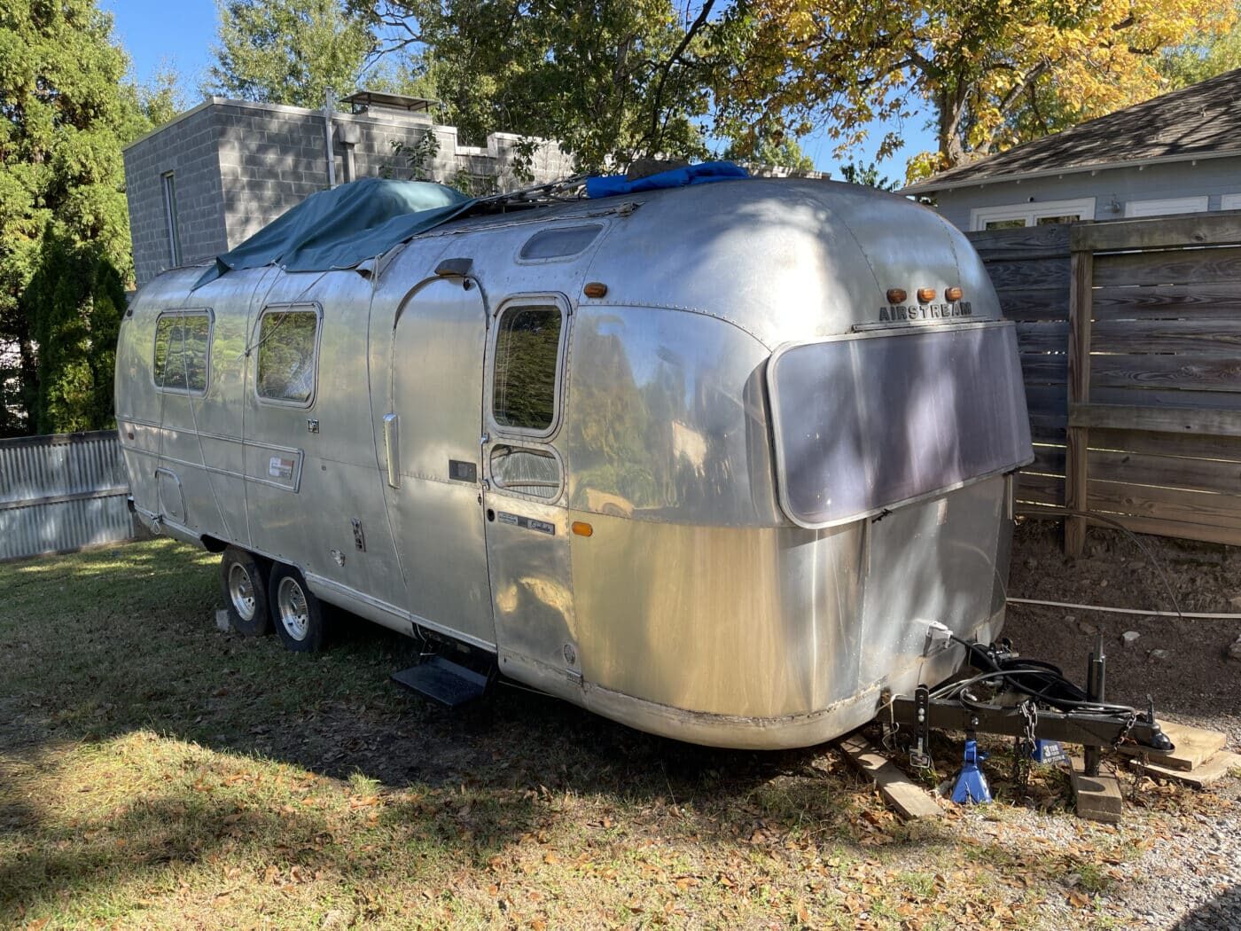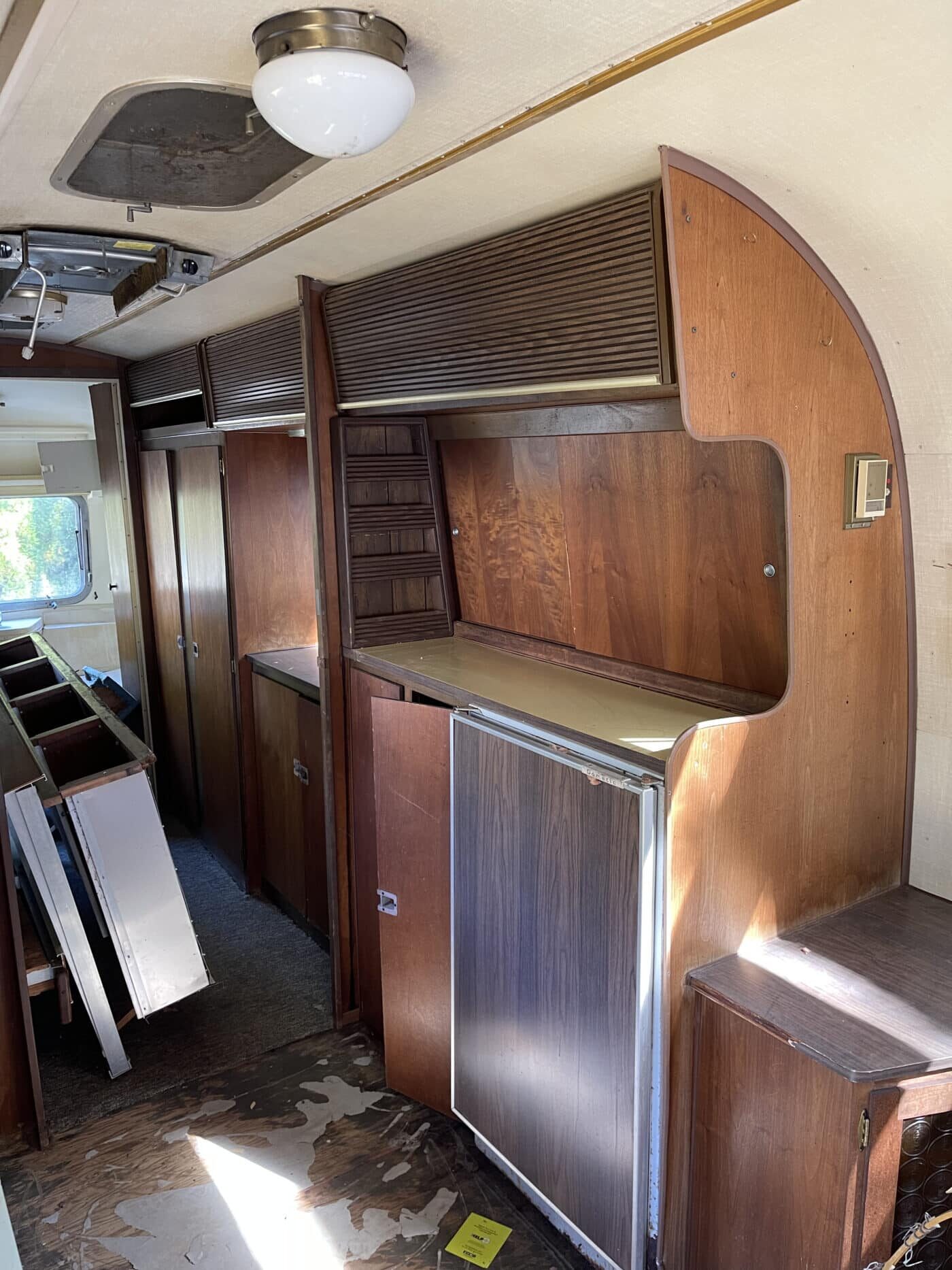 1970 rear bathroom and shower Overlander. I bought it about a year and a half ago with the idea of doing a restoration myself, but given that I do not have a garage, and the farm I was storing it at is no longer available, I need to pass it on to someone better equipped and motivated. I started by doing a 2.5″ new suspension lift kit and two new Torsion axles with brakes; wired and working. They’re upgraded in load bearing from the original, though same original brand and type. I have started inside by removing the skins in the front of the trailer and the old flooring, and sat the convertible couch/ bed to the side while working. She has the original gas range, oven, sink and refrigerator. The Fridge needs replacing however. the cover on the roof mounted AC has at some point been broken and was not water-tight, therefore the tarp. I’m not certain if it is functional beyond that. One of the roof vent covers was also broken, therefore covered as well. Windows are all intact, but will need new hardware on some and seals on most. Front rock guard intact, though hazy and no longer transparent. She pulls straight and true with my load levelling hitch and brake controller. I’m uncertain of the plumbing, but the toilet was set loosely in place, and I would presume that will need work, though toilet itself and sink/ shower are intact. I can deliver within 100 miles. I’m hoping someone can pick up where I left off and restore this beauty.
