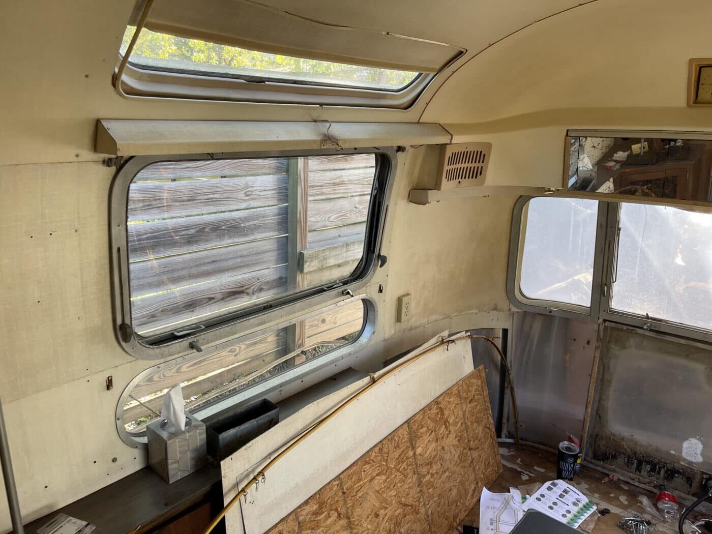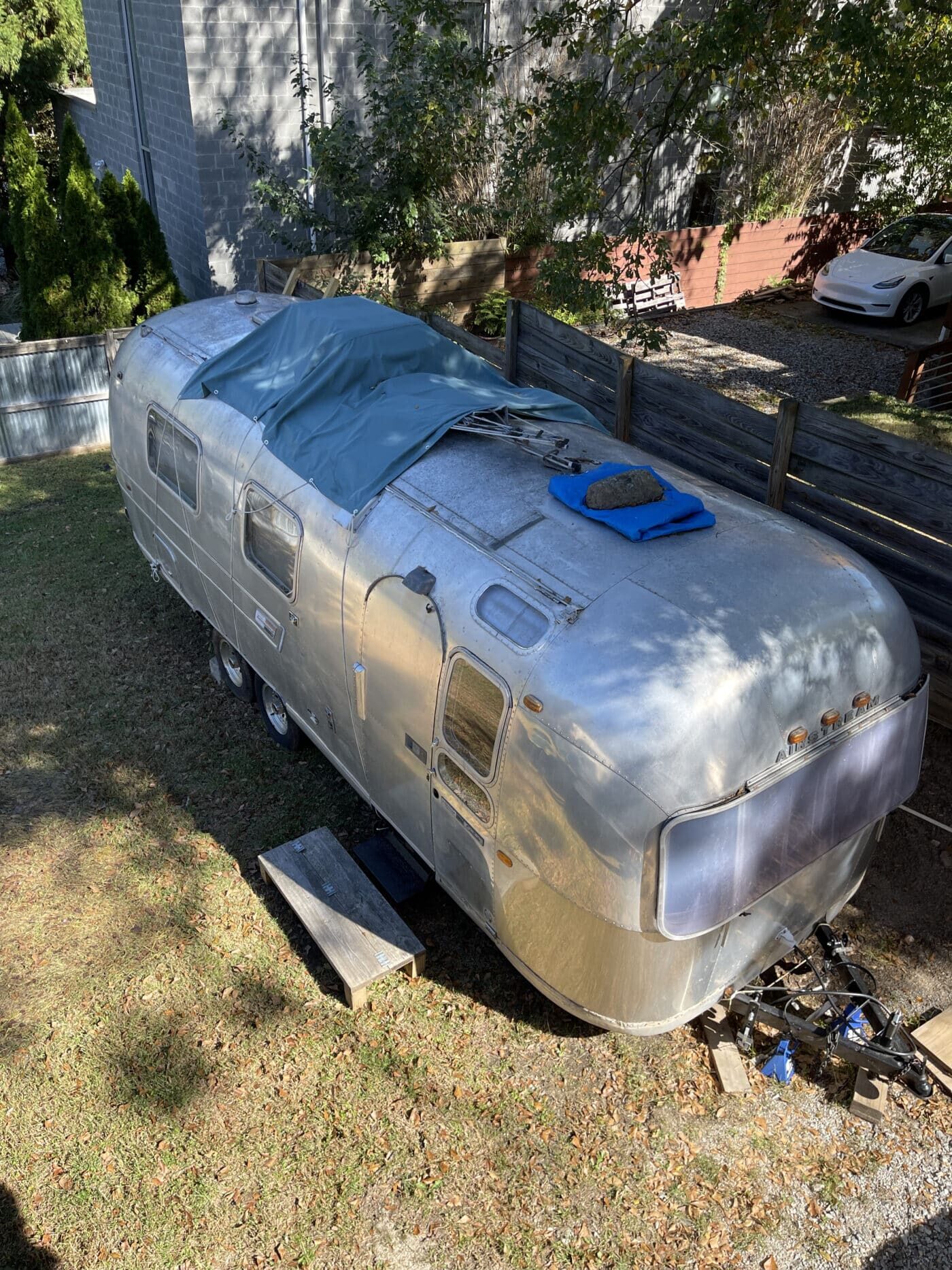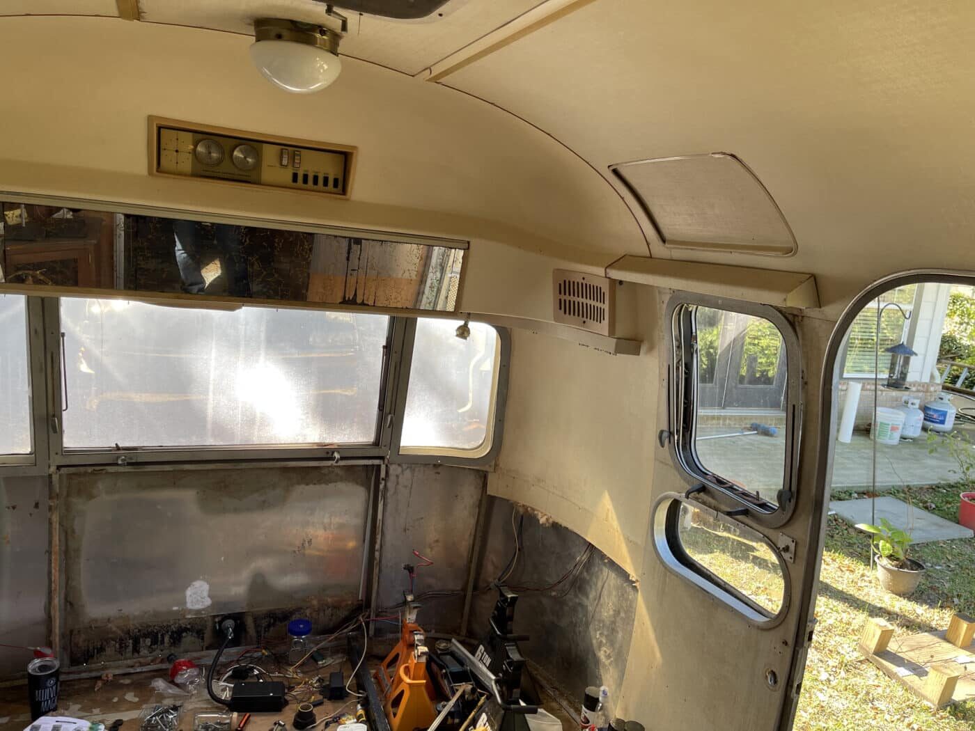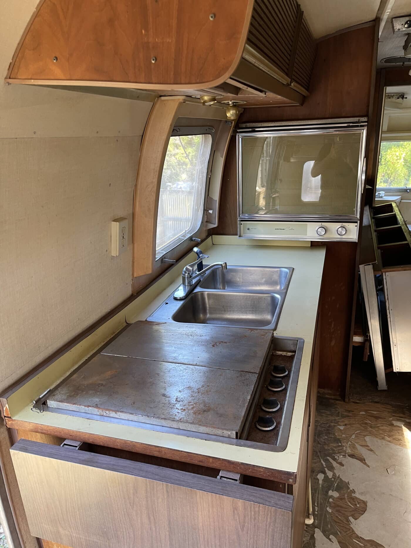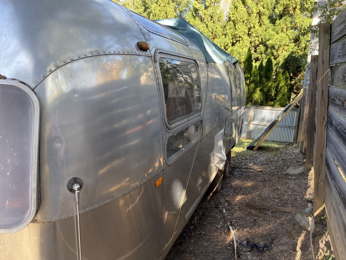 1970 rear bathroom and shower Overlander. I bought it about a year and a half ago with the idea of doing a restoration myself, but given that I do not have a garage, and the farm I was storing it at is no longer available, I need to pass it on to someone better equipped and motivated. I started by doing a 2.5″ new suspension lift kit and two new Torsion axles with brakes; wired and working. They’re upgraded in load bearing from the original, though same original brand and type. I have started inside by removing the skins in the front of the trailer and the old flooring, and sat the convertible couch/ bed to the side while working. She has the original gas range, oven, sink and refrigerator. The Fridge needs replacing however. the cover on the roof mounted AC has at some point been broken and was not water-tight, therefore the tarp. I’m not certain if it is functional beyond that. One of the roof vent covers was also broken, therefore covered as well. Windows are all intact, but will need new hardware on some and seals on most. Front rock guard intact, though hazy and no longer transparent. She pulls straight and true with my load levelling hitch and brake controller. I’m uncertain of the plumbing, but the toilet was set loosely in place, and I would presume that will need work, though toilet itself and sink/ shower are intact. I can deliver within 100 miles. I’m hoping someone can pick up where I left off and restore this beauty.