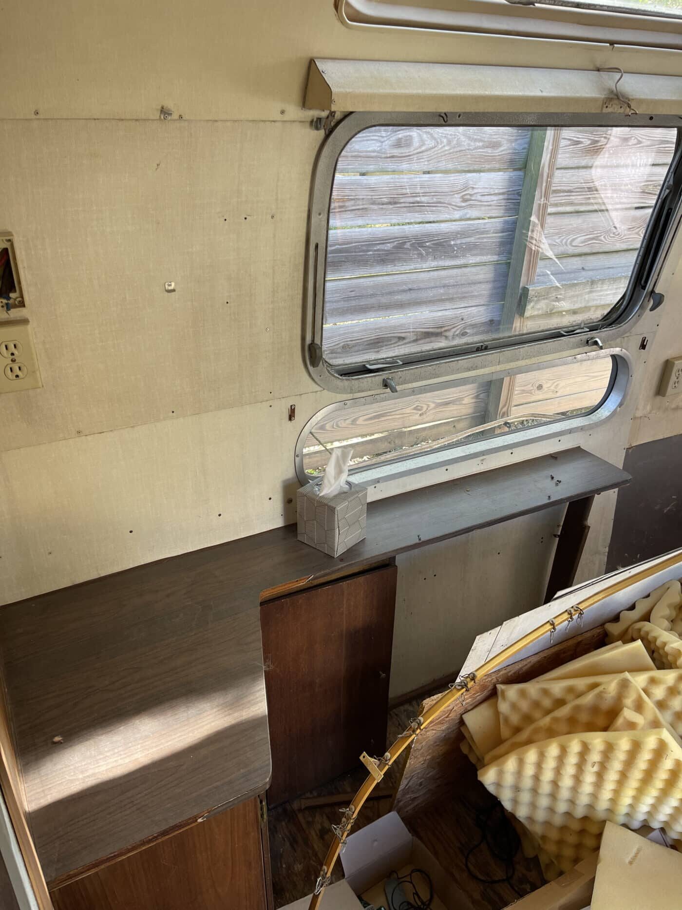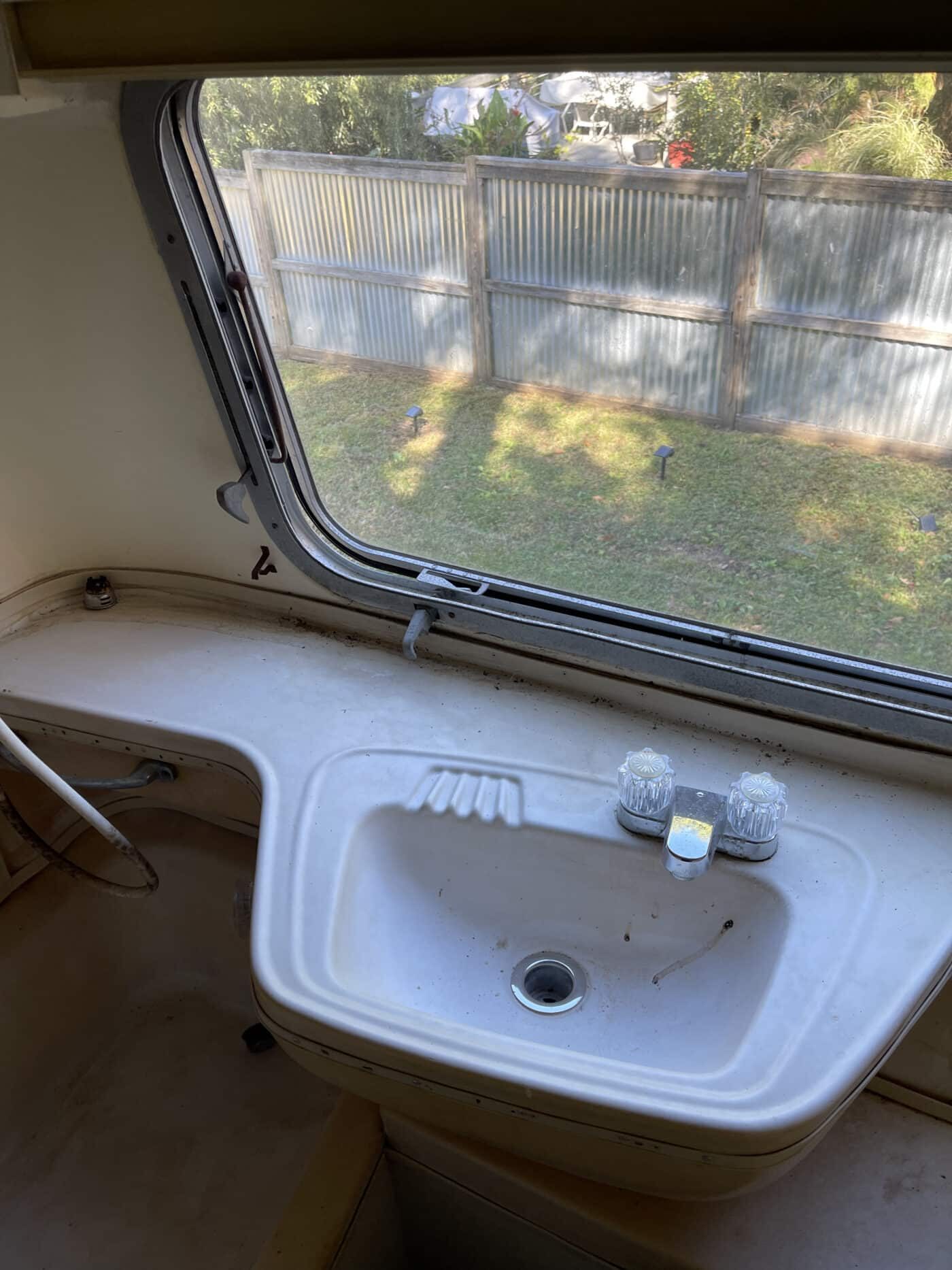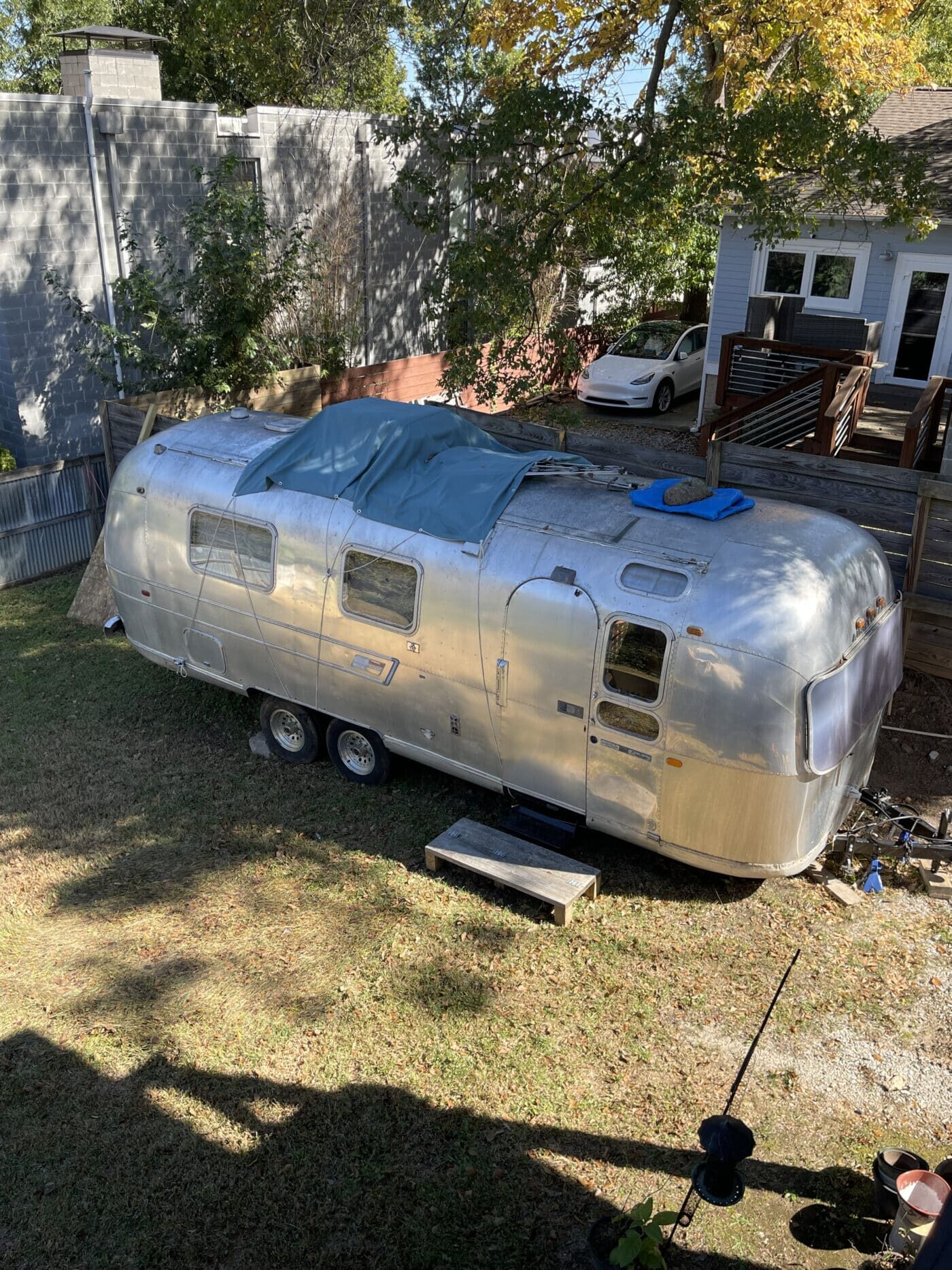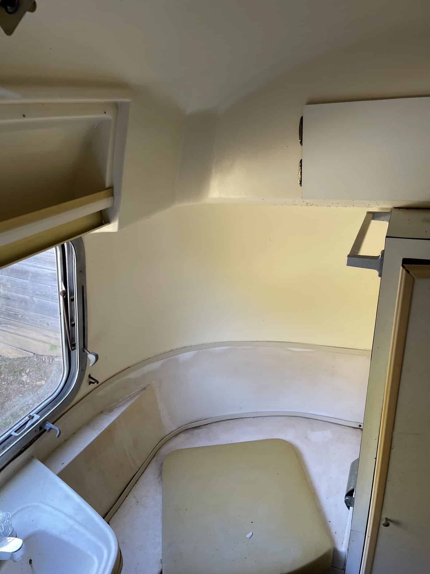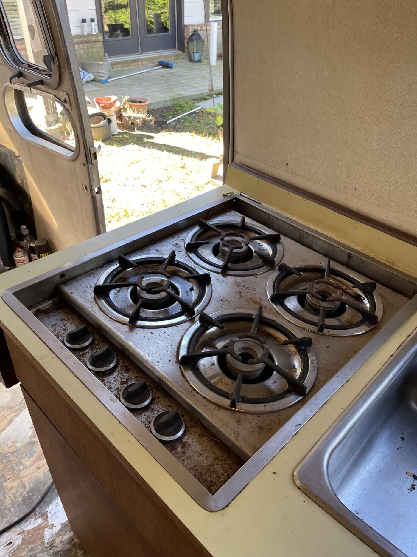 1970 rear bathroom and shower Overlander. I bought it about a year and a half ago with the idea of doing a restoration myself, but given that I do not have a garage, and the farm I was storing it at is no longer available, I need to pass it on to someone better equipped and motivated. I started by doing a 2.5″ new suspension lift kit and two new Torsion axles with brakes; wired and working. They’re upgraded in load bearing from the original, though same original brand and type. I have started inside by removing the skins in the front of the trailer and the old flooring, and sat the convertible couch/ bed to the side while working. She has the original gas range, oven, sink and refrigerator. The Fridge needs replacing however. the cover on the roof mounted AC has at some point been broken and was not water-tight, therefore the tarp. I’m not certain if it is functional beyond that. One of the roof vent covers was also broken, therefore covered as well. Windows are all intact, but will need new hardware on some and seals on most. Front rock guard intact, though hazy and no longer transparent. She pulls straight and true with my load levelling hitch and brake controller. I’m uncertain of the plumbing, but the toilet was set loosely in place, and I would presume that will need work, though toilet itself and sink/ shower are intact. I can deliver within 100 miles. I’m hoping someone can pick up where I left off and restore this beauty.