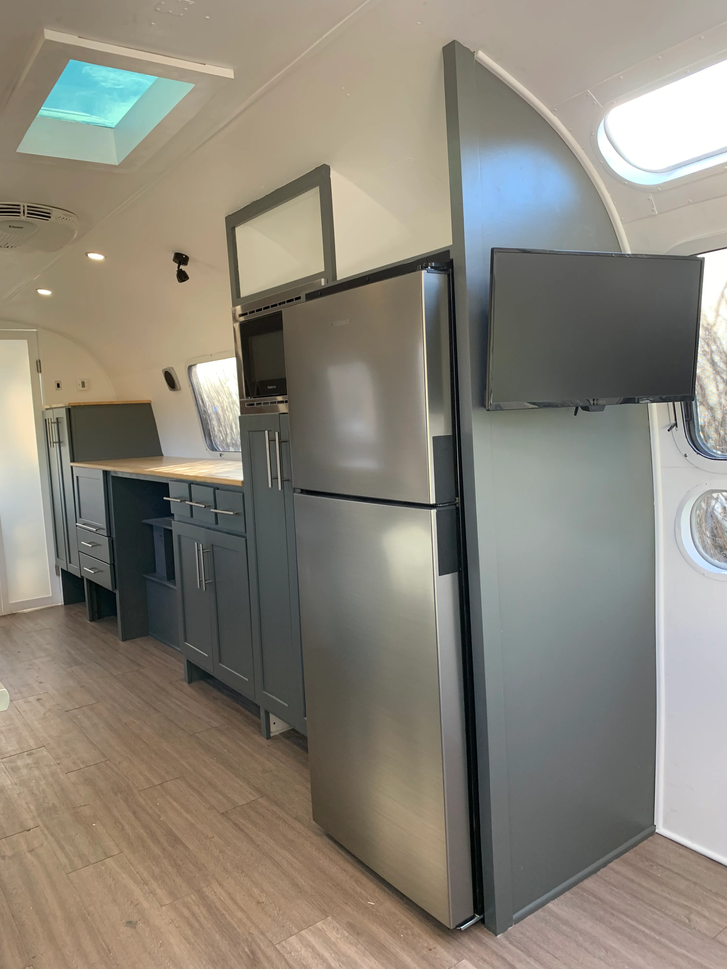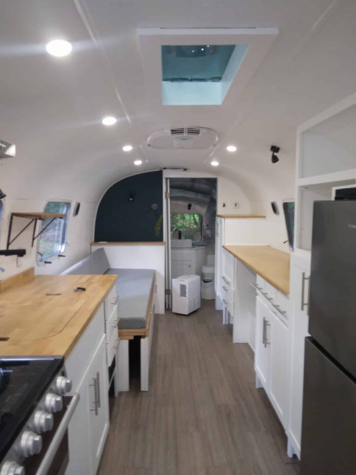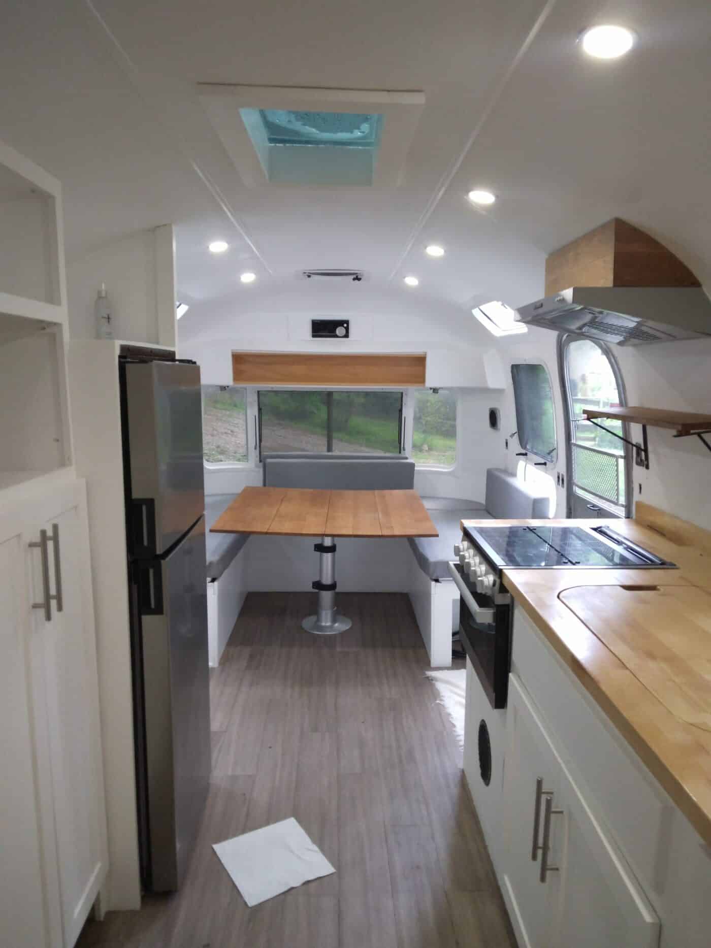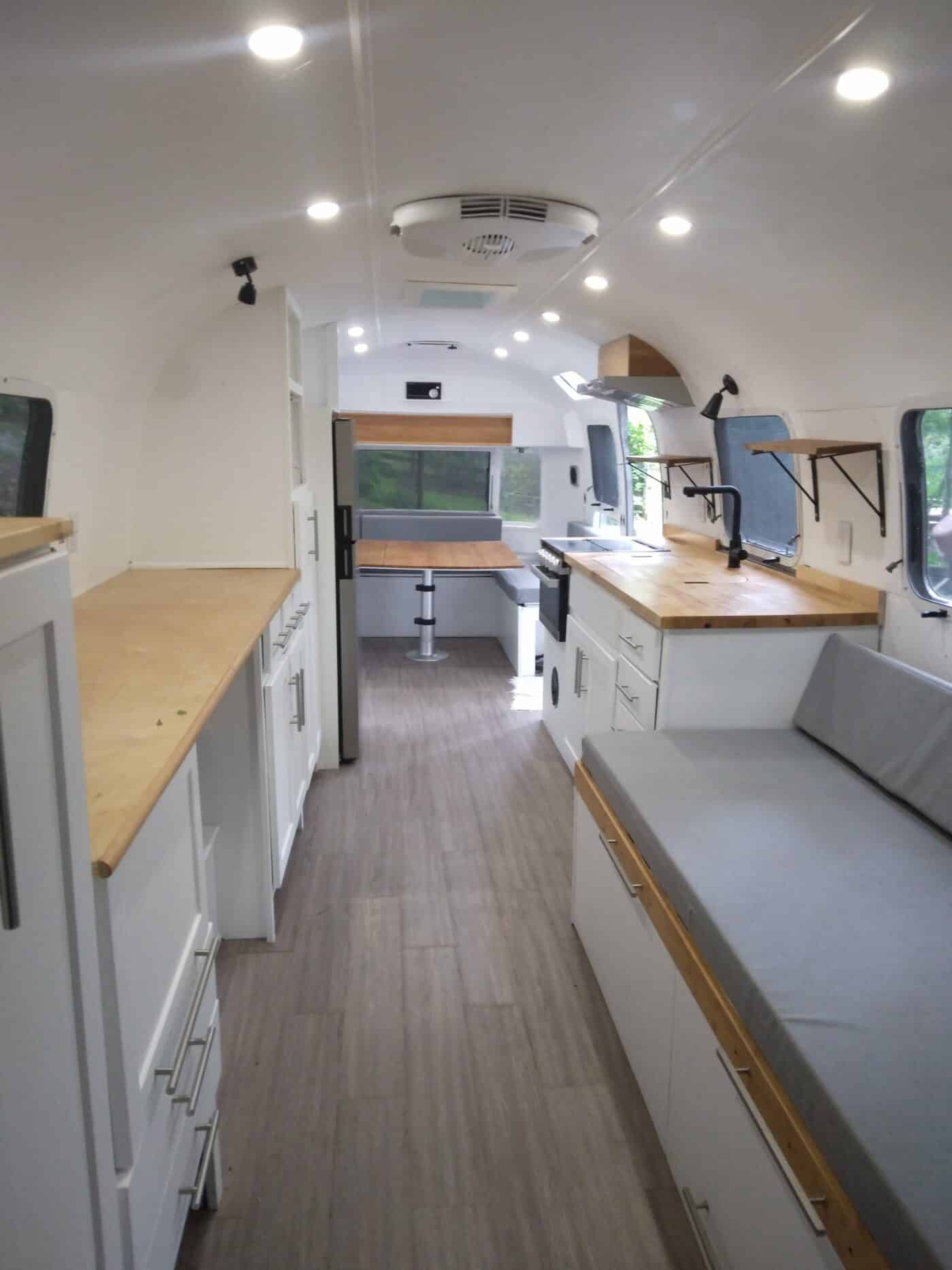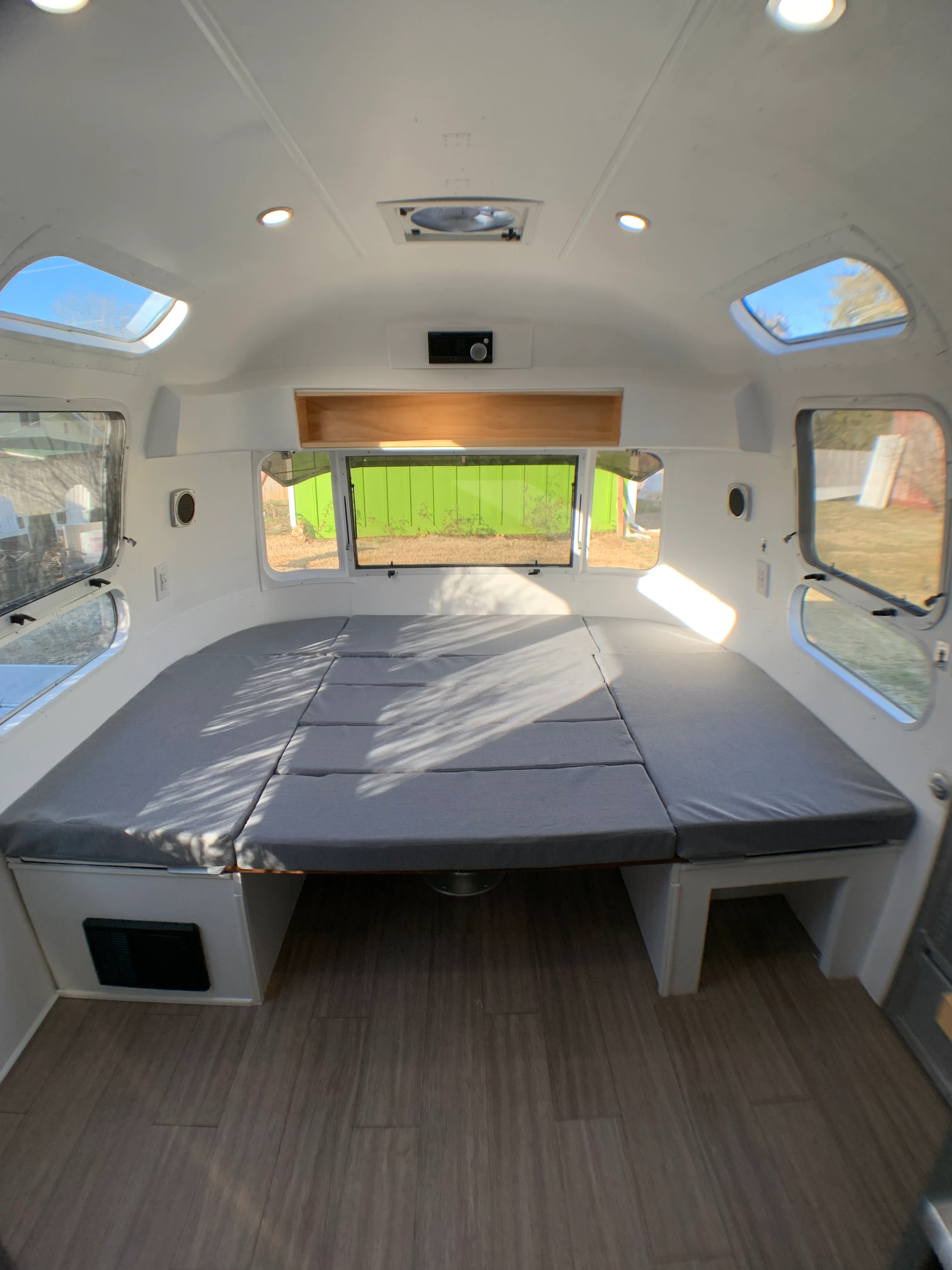 Completely gutted and built out (electrical, plumbing, etc) by the previous owner. Welding repairs were made when gutted and entire frame coated with rust preventative. Every seam and rivet sealed behind walls (interior sealing). All new subfloors were installed. Trailer fully polished. I had previous owner install brand new Renogy 2000w Off-grid Converter at time of purchase in case of need.