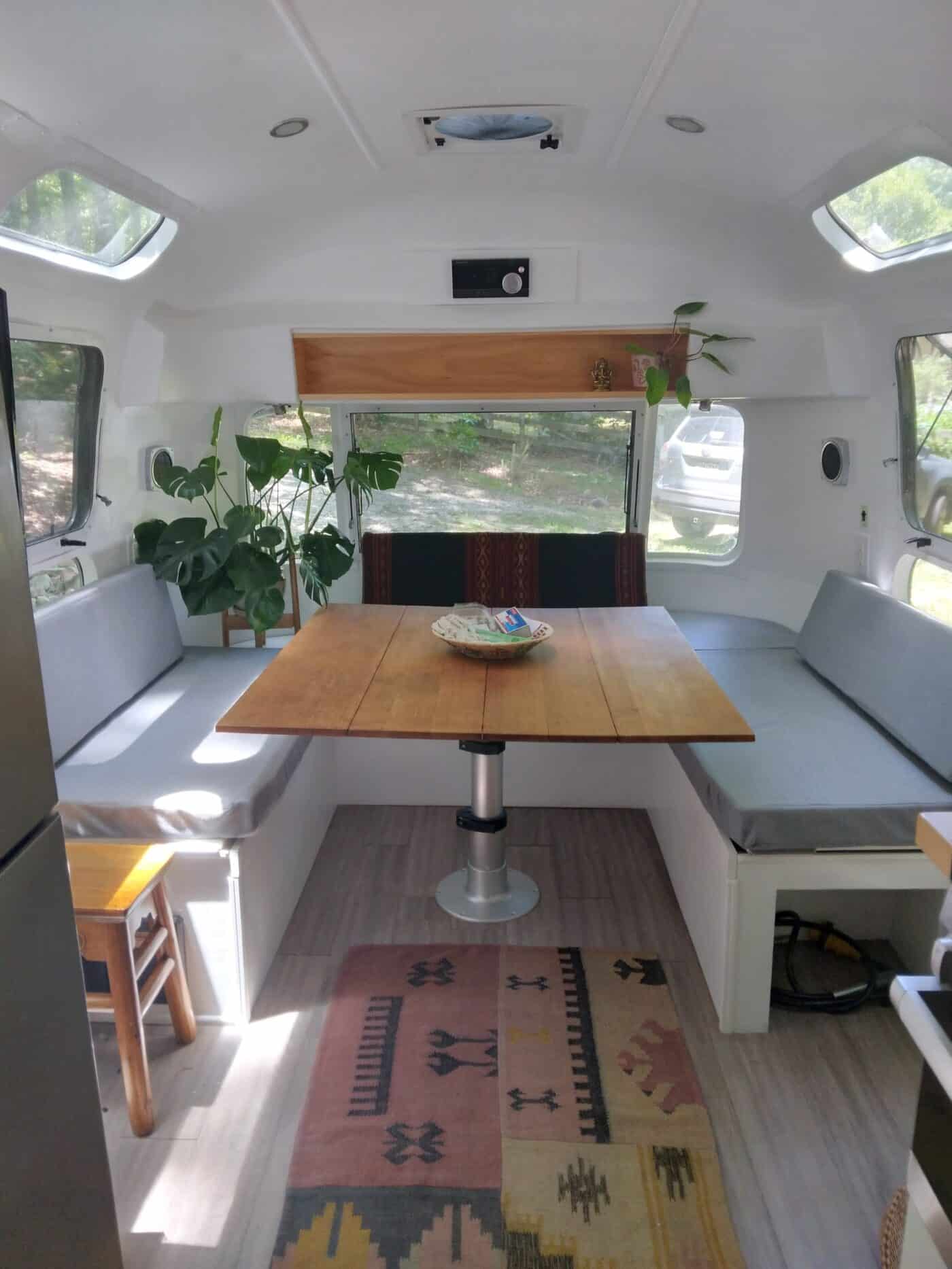 Large front dinette with quarter sawn oak table that lowers to create large sleeping platform.
