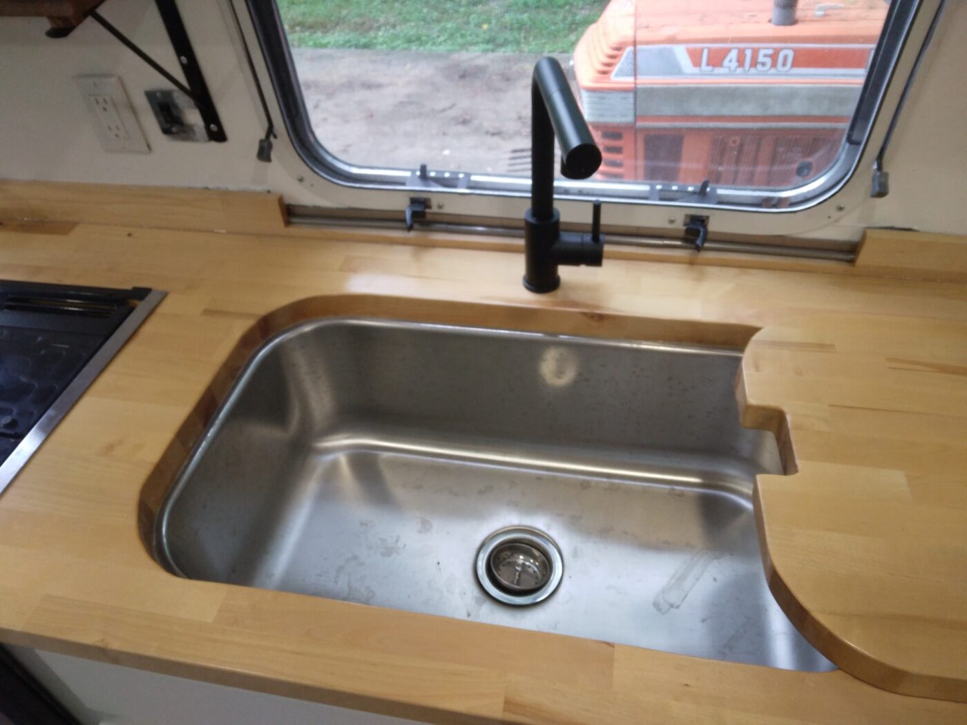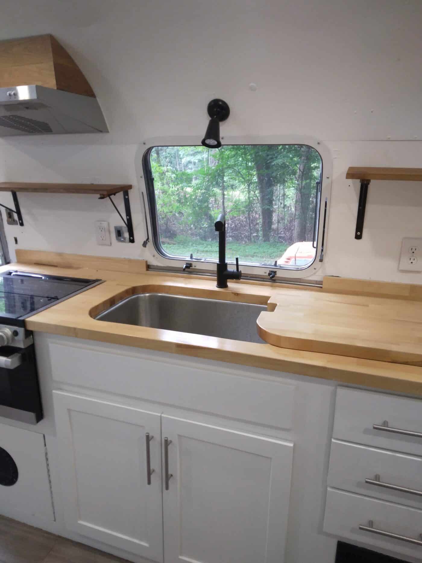 Butcher block countertops with removable cutting board sink cover. Stainless steel sink with black faucet with extending spray nozzle.