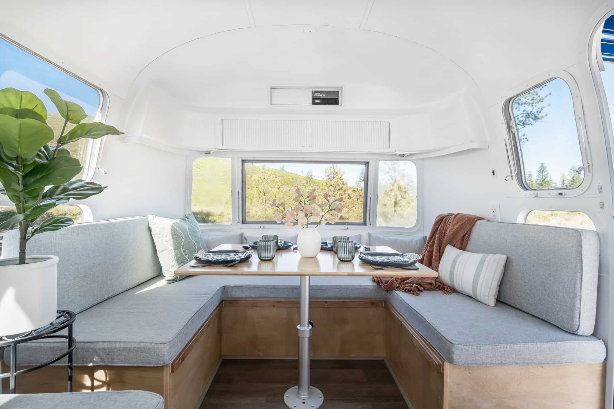 Front living area with custom built dinette that converts to a full sized bed