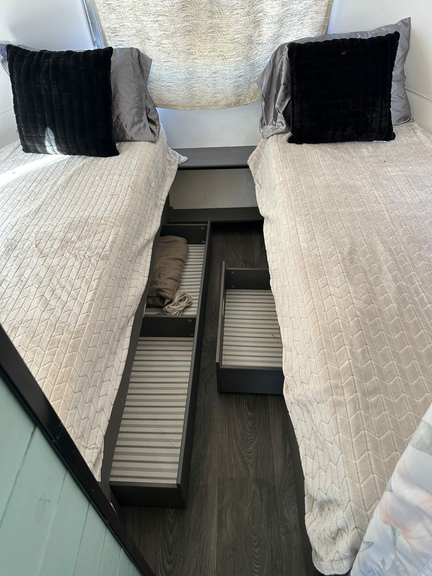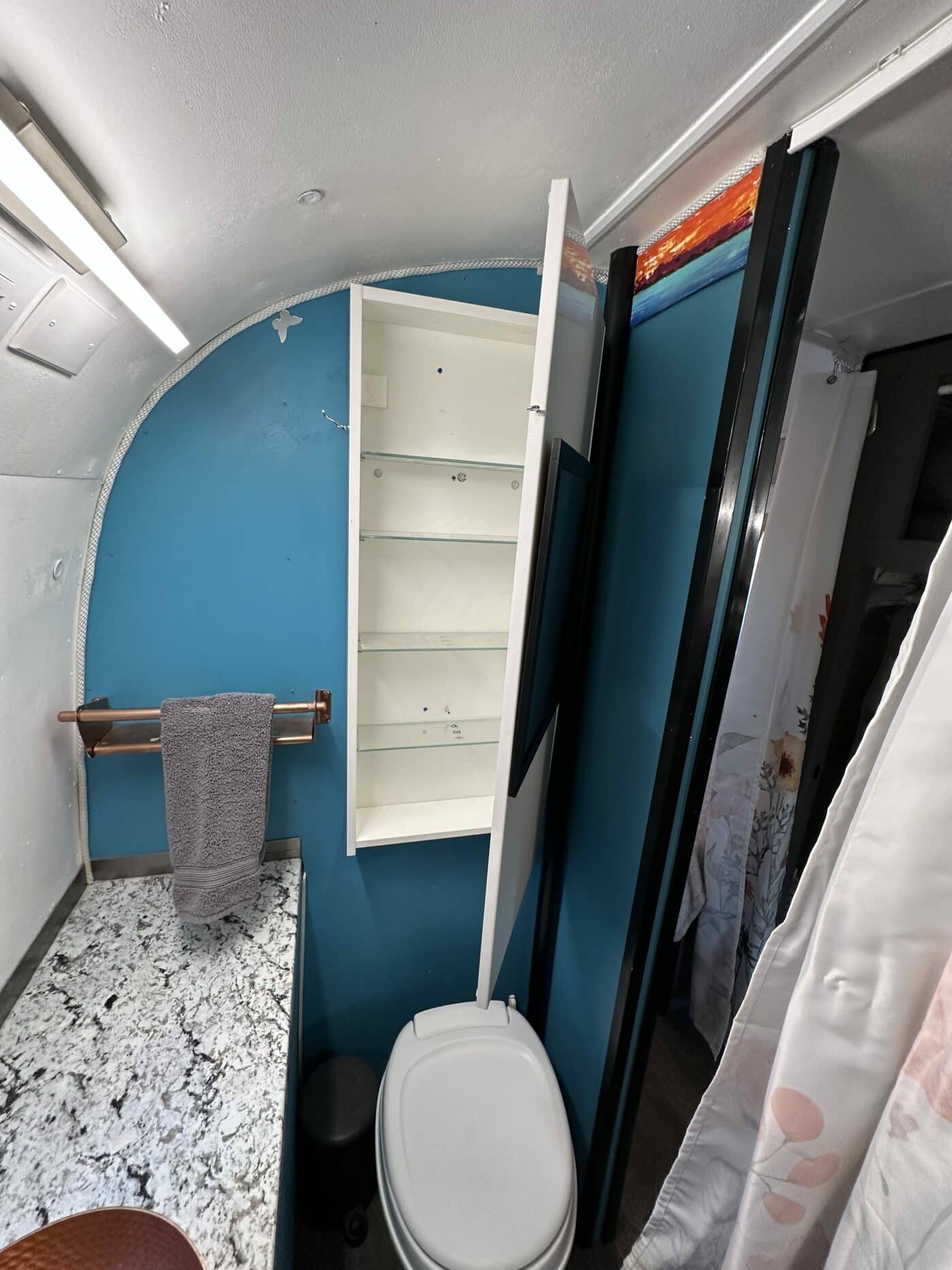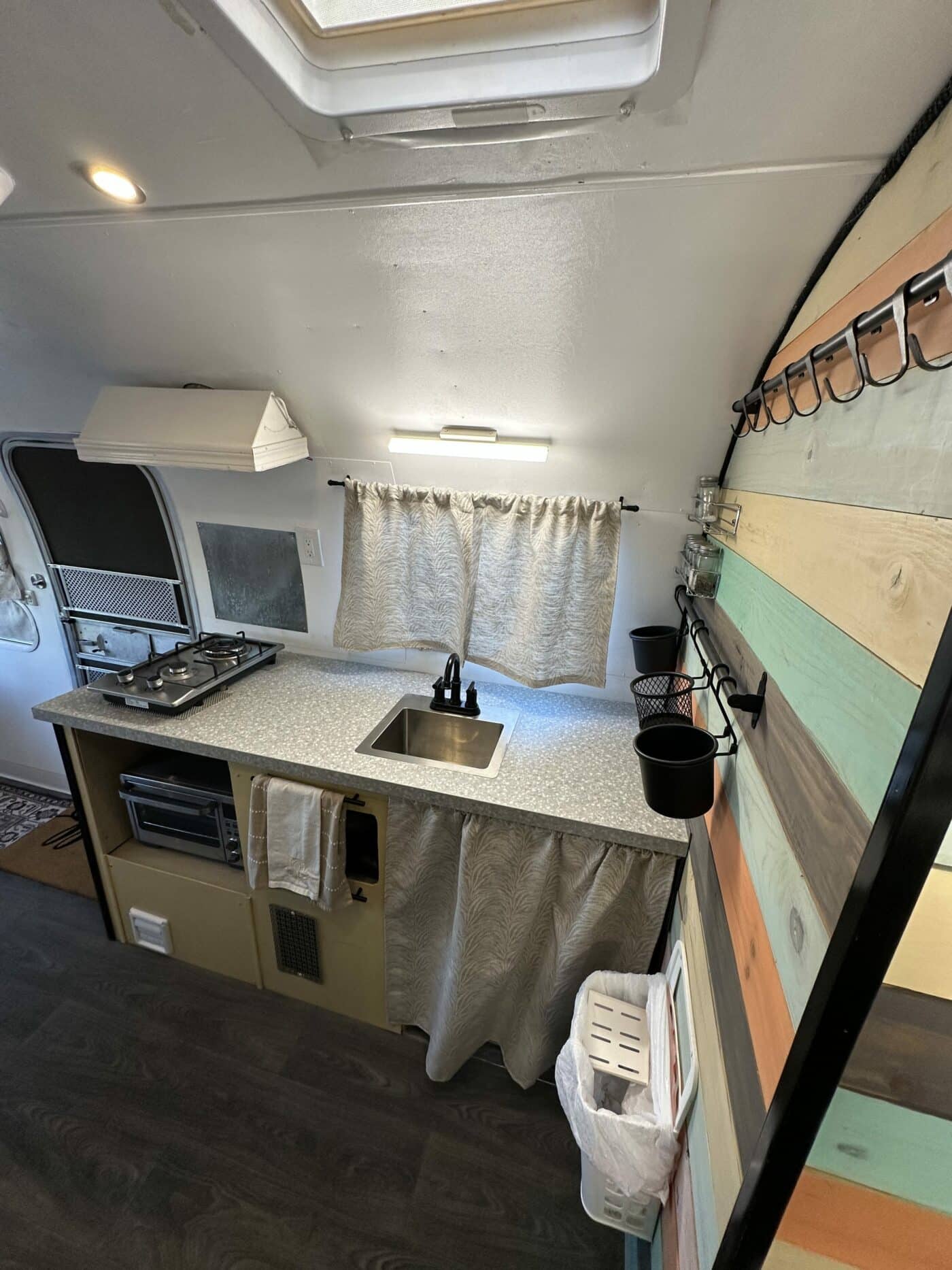 Unique travel trailer with spacious layout redesign, including a customizable living area. This remodel was built with comfort in mind! Separate bedroom and living room spacing, keep the two arm chairs in the front living room or build out to however fits you best. The updated kitchen has a Bravo combination oven/air fryer, two burner propane stove top, beautiful countertops and plenty of storage, including a pull out panty cabinet and a full wall of storage drawers. Also an updated Galanz, vintage style refrigerator and microwave. The bathroom boasts a full size 32” shower with a tiled bench, to make showers easy and comfortable. New Thetford pedal flush toilet and extra large medicine cabinet. No tight long hallways and still has a closet with plenty of storage. The rear bedroom has the original bed layout but with newly built frames and plenty of under bed storage, as well as recently purchased custom made memory foam mattresses.