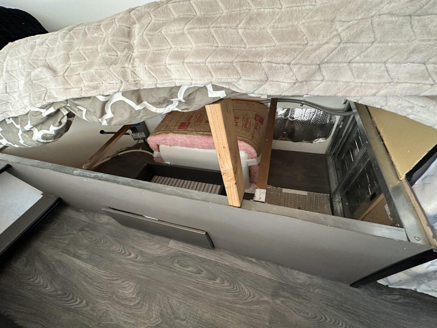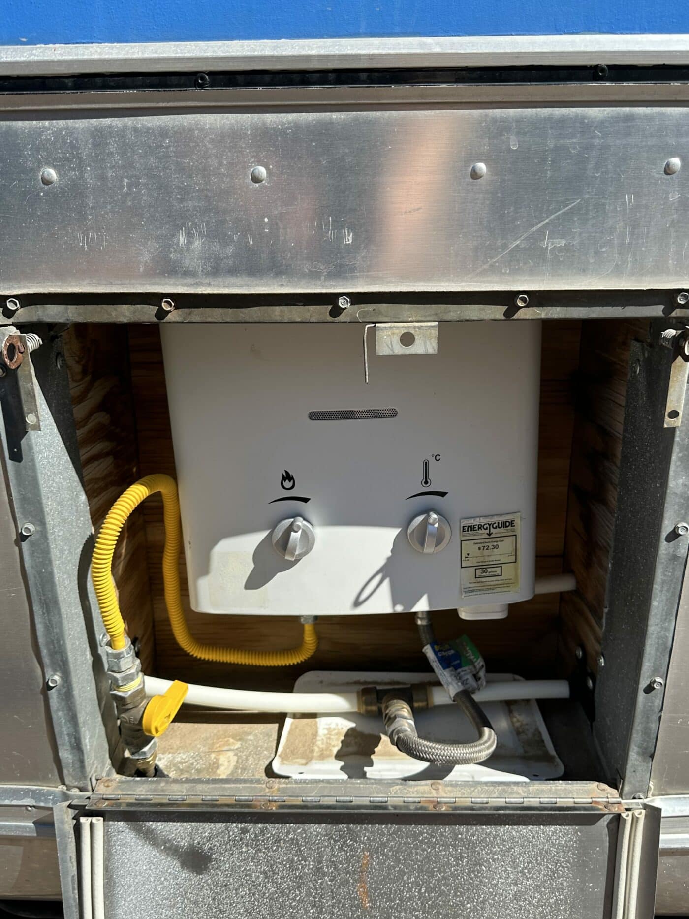 Two new Furion Chill 14.5 K BTU roof mounted air conditioning units for separate bedroom and living room controls. Heating is from original suburban propane powered furnace with new ducting to living, bath, & bedroom. Hot water is provided by Excel tankless on demand 1.6 gpm 38,000 btu system. All three (potable, gray, and black) tanks are original, sound and solid although none have active float/fill sensors. Interior lighting is switched 12 volt LED throughout, with new recessed puck lights. New electrical panel located under bed, and new Ac/Dc distribution power center with built in smart charger.