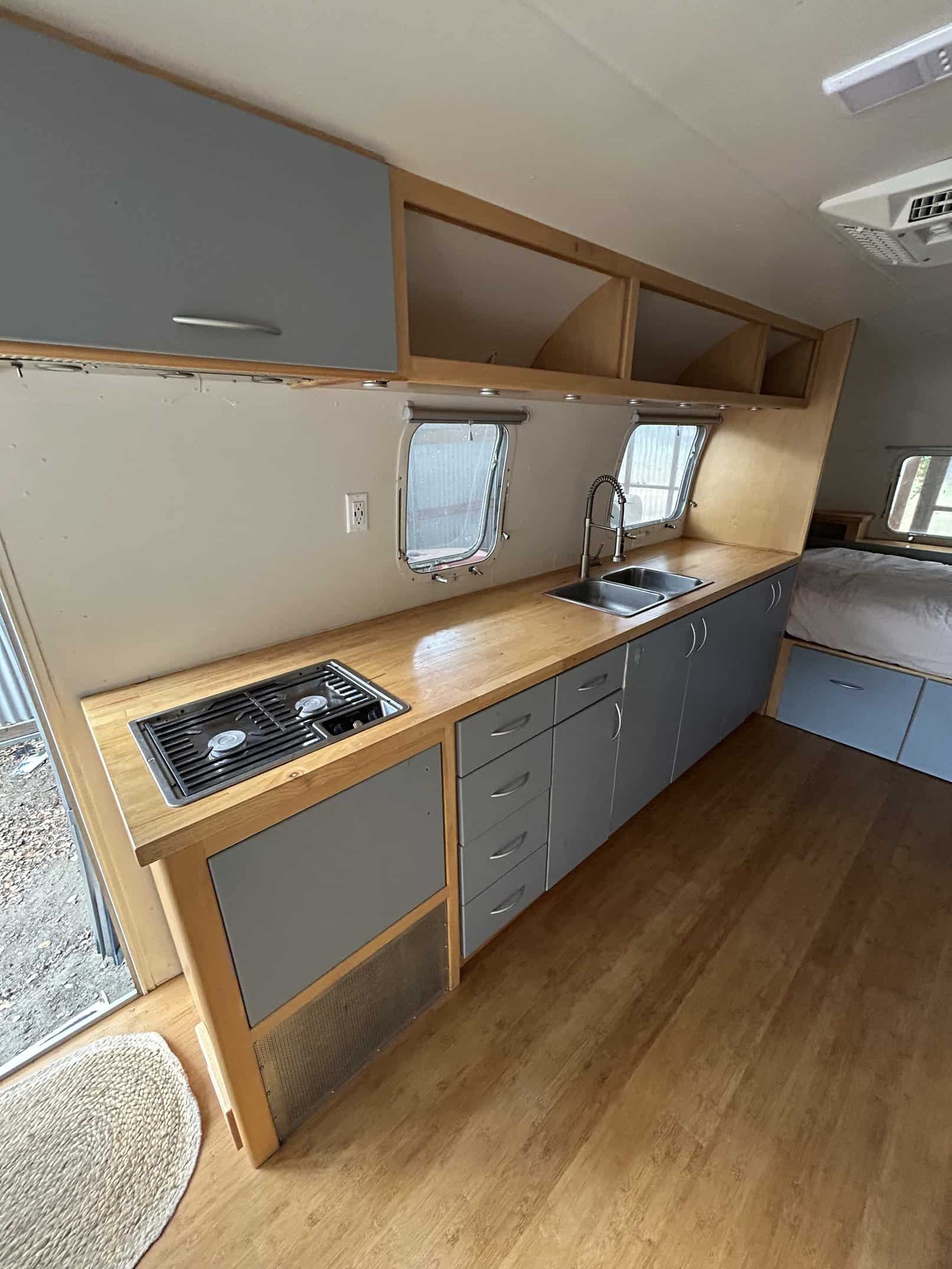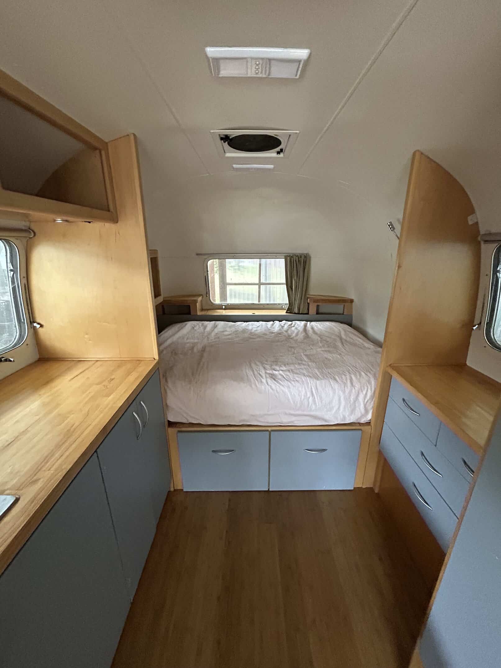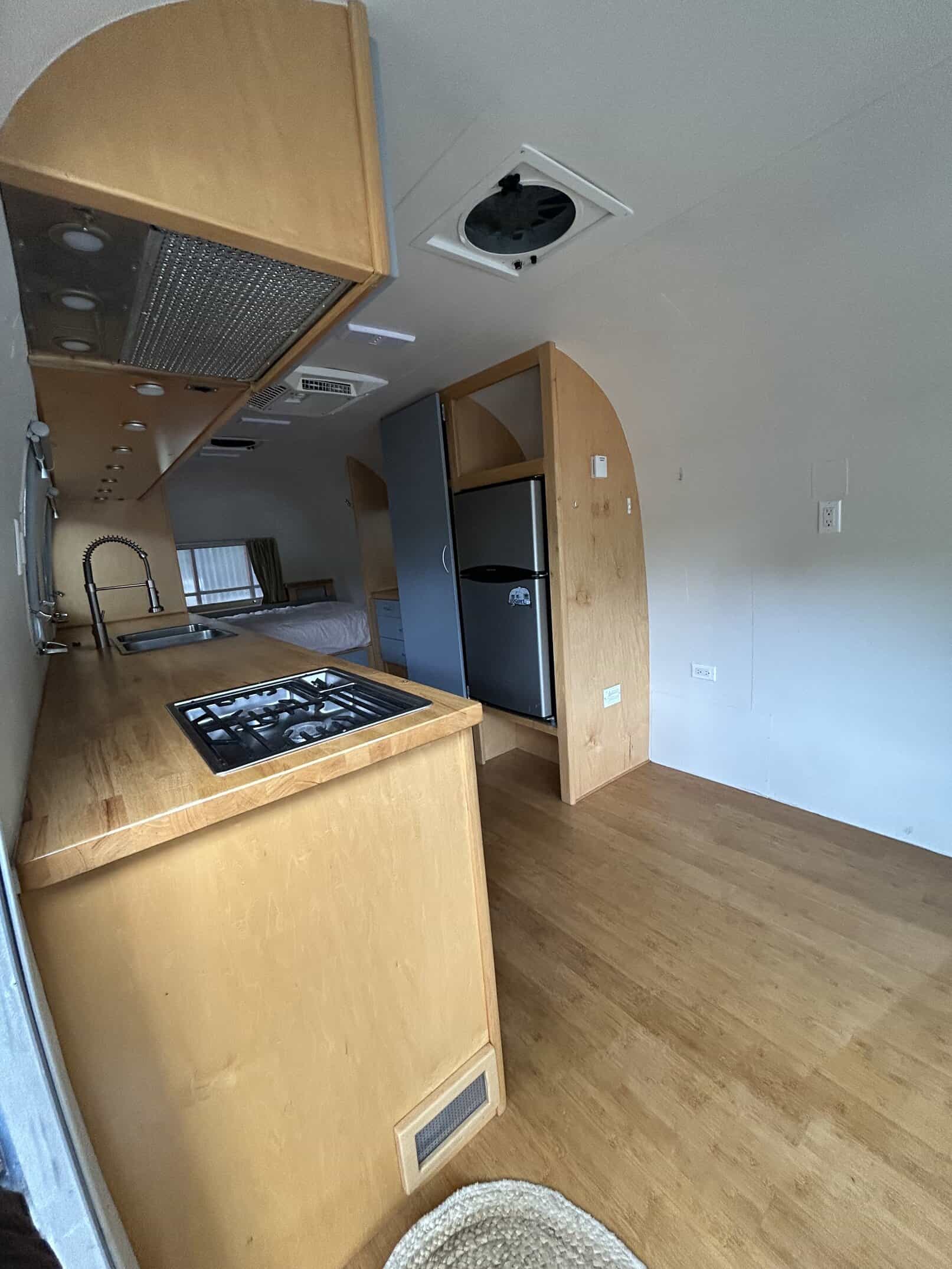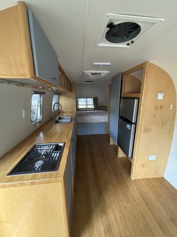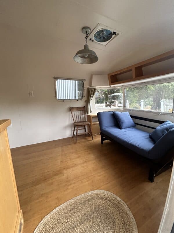 Beautifully remodeled airstream perfect for a parked ADU, tiny home or guest room (more spacious interior with no bathroom inside). With nicely done wood interior, butcher block counter top, bamboo floors, lots of lighting with lights above counter, overhead lighting, reading lights, sea green curtains, and lots of built-in storage. Cute paint job with blue and white exterior.