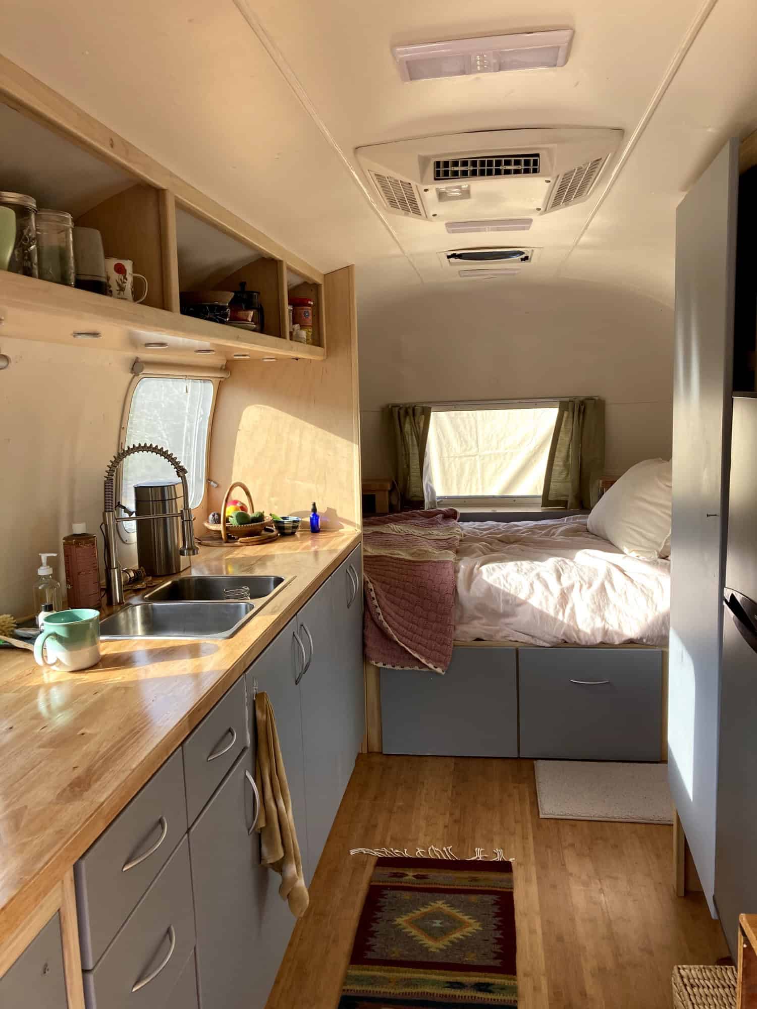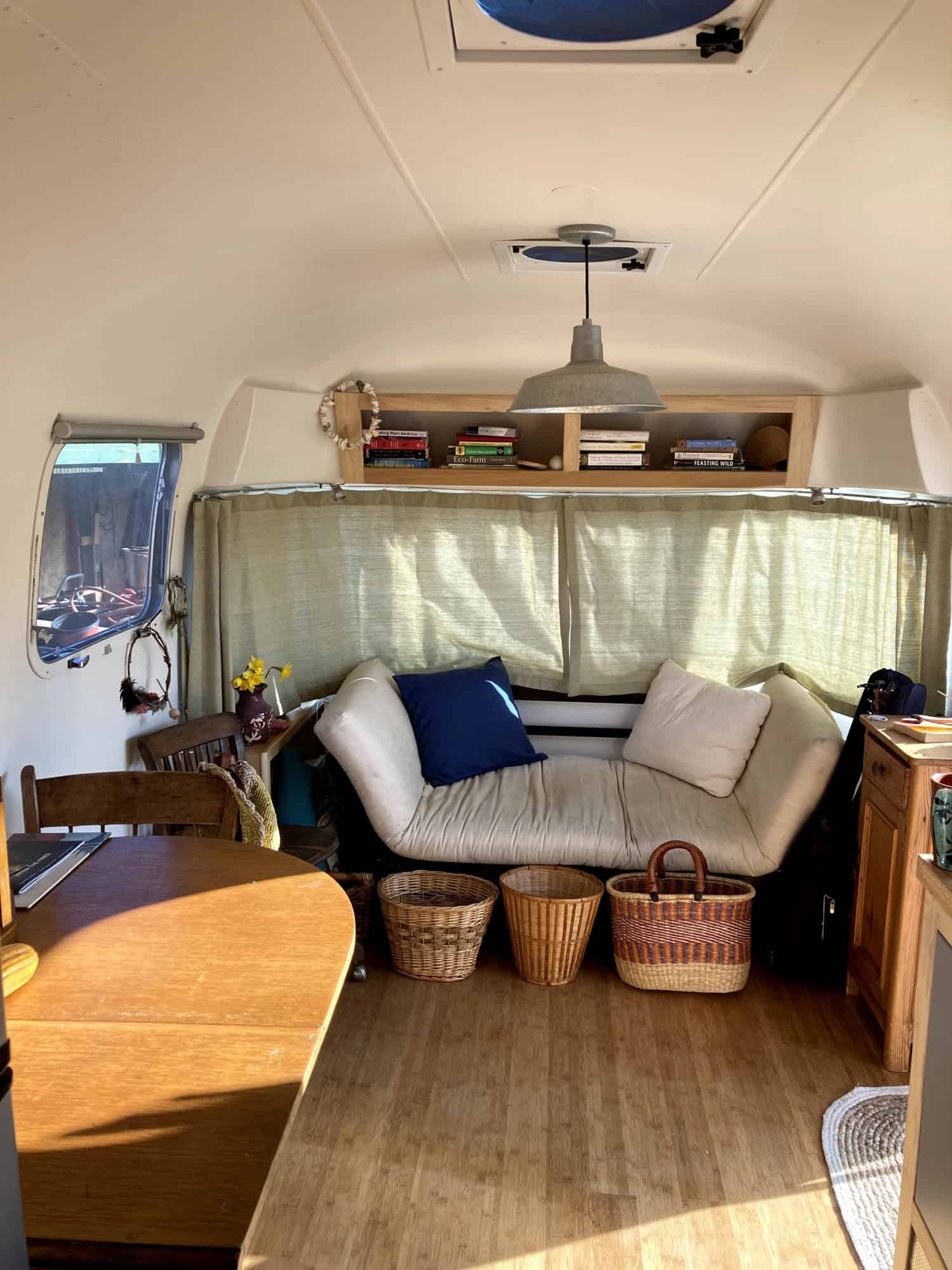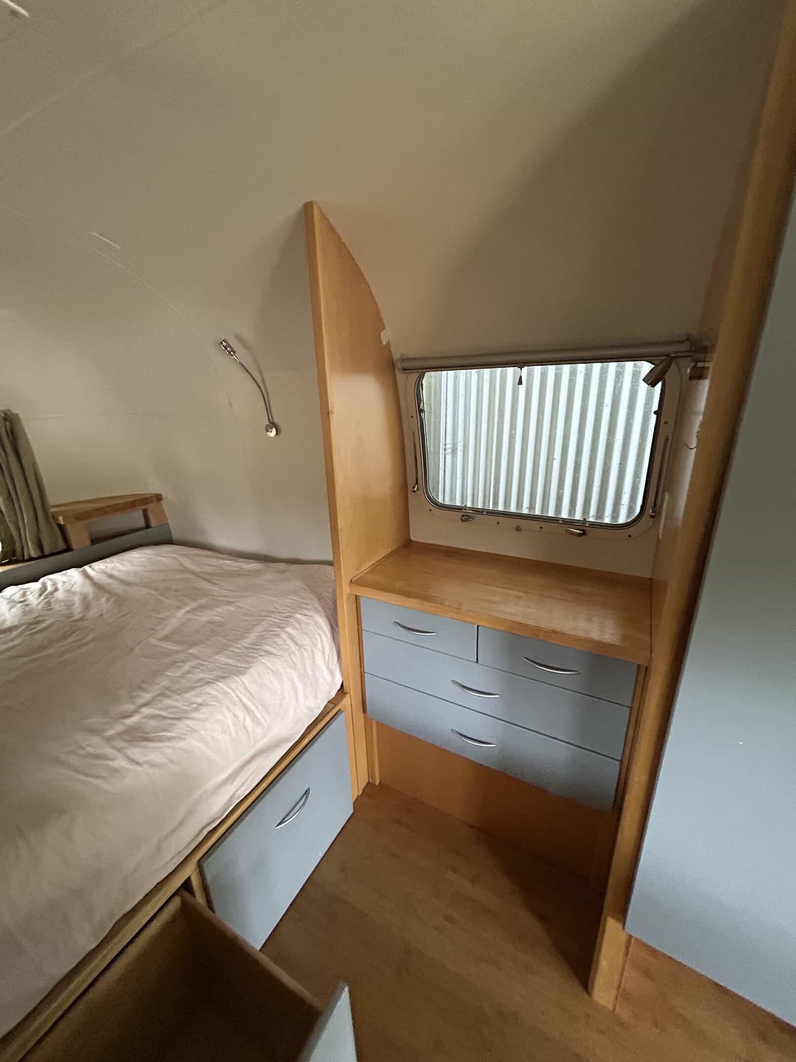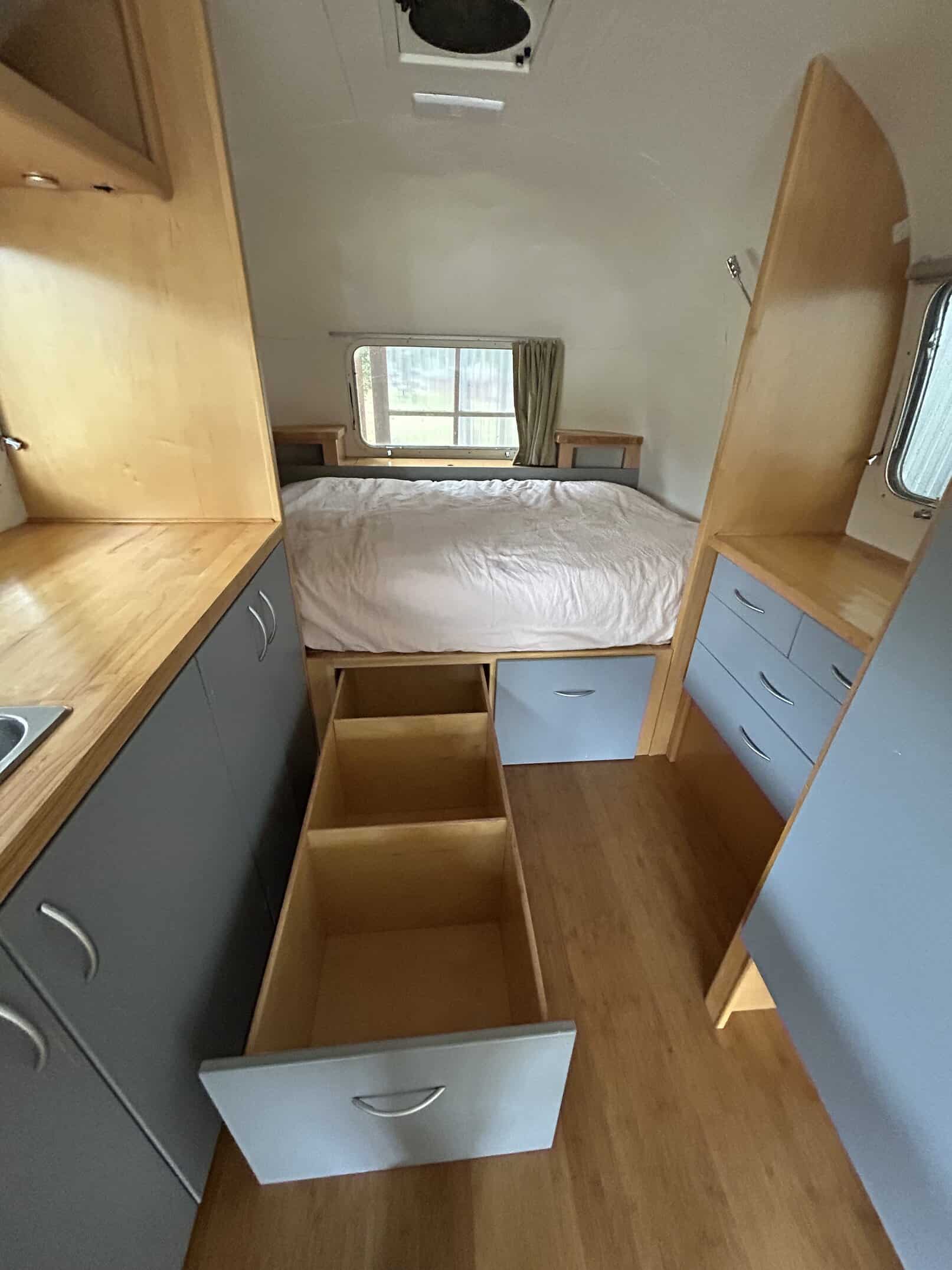 Beautifully remodeled airstream perfect for a parked ADU, tiny home or guest room (more spacious interior with no bathroom inside). With nicely done wood interior, butcher block counter top, bamboo floors, lots of lighting with lights above counter, overhead lighting, reading lights, sea green curtains, and lots of built-in storage. Cute paint job with blue and white exterior.