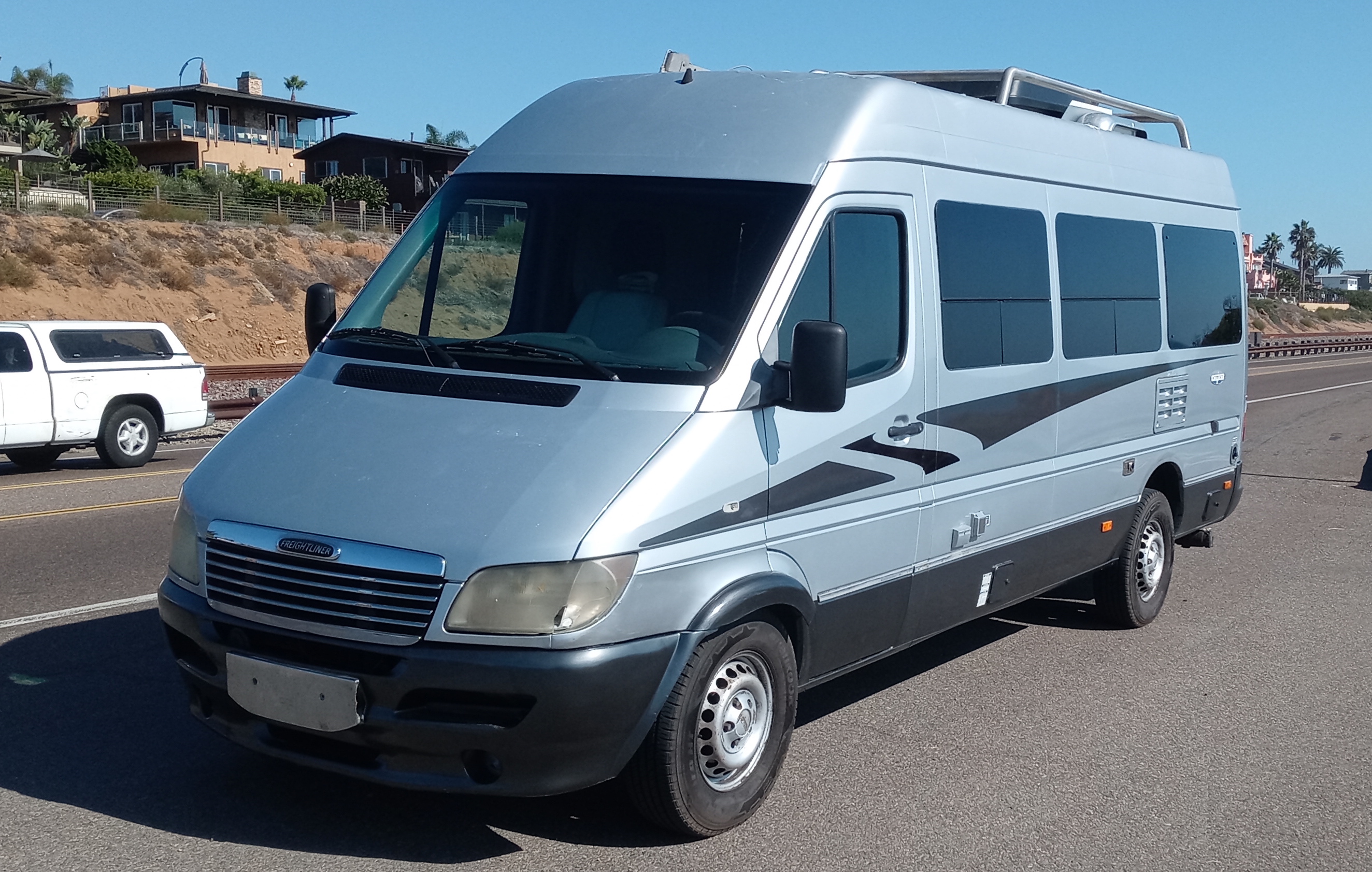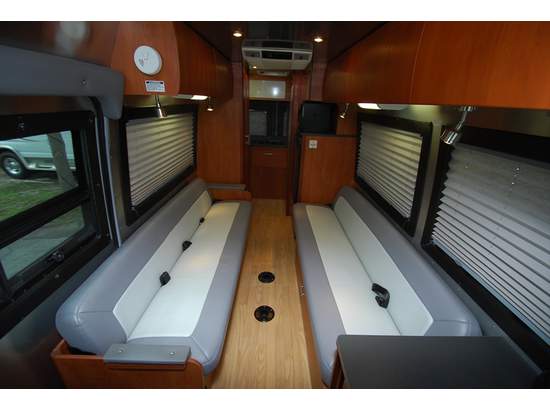 This model has the rare forward bed, which creates a MUCH more spacious living environment than the rear bed model. It has aluminum paneling on the walls and ceiling, throwing back to the iconic Airstream trailers. The cherrywood cabinetry is beautiful- curved and contoured, not “boxy” like many of the DIY vans. It is a beautiful machine.