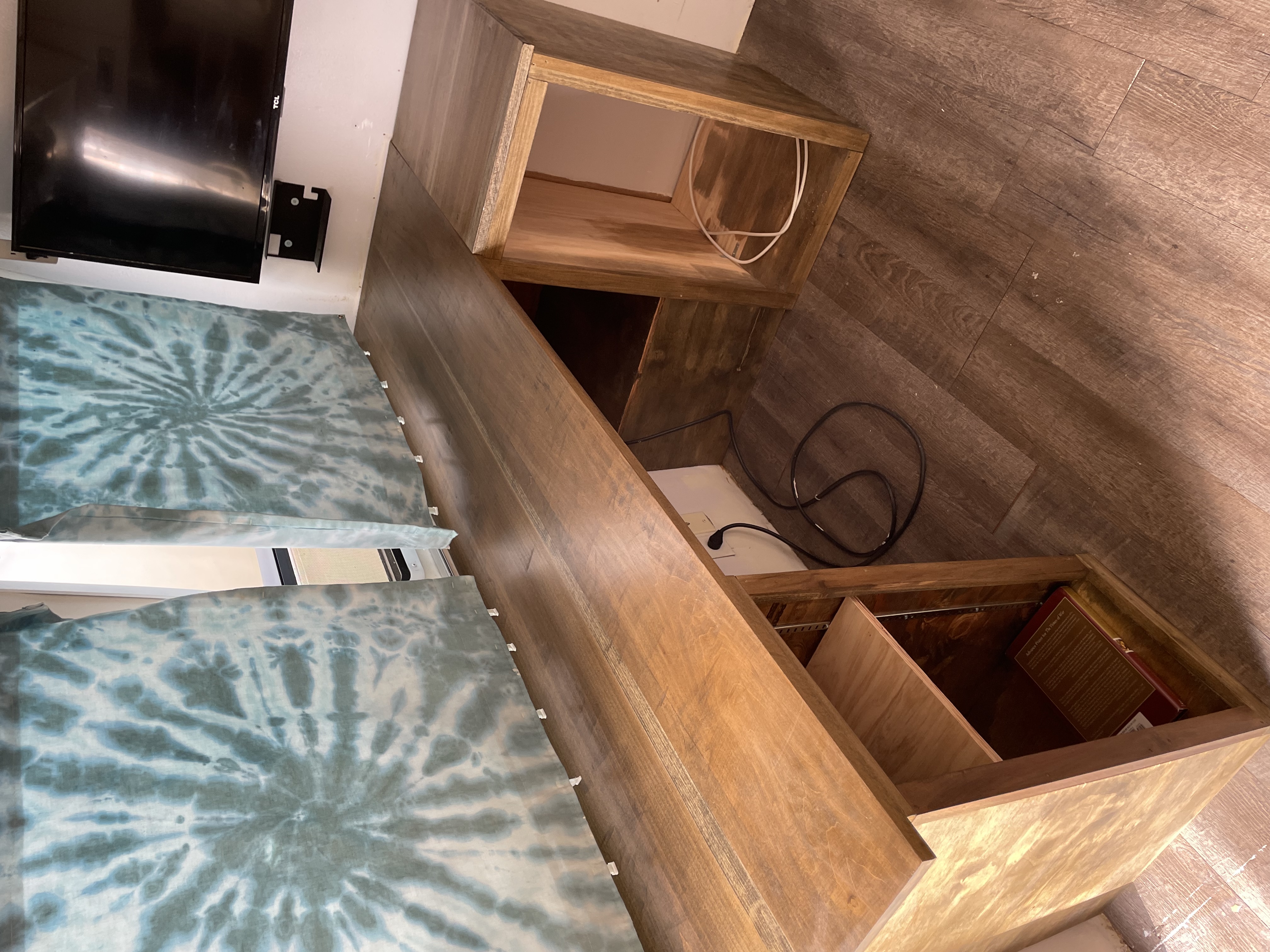 • Desk Workspace: Custom-built desk replaced the dinette. It’s functional, unfinished at the sides for shelving/drawer customization.