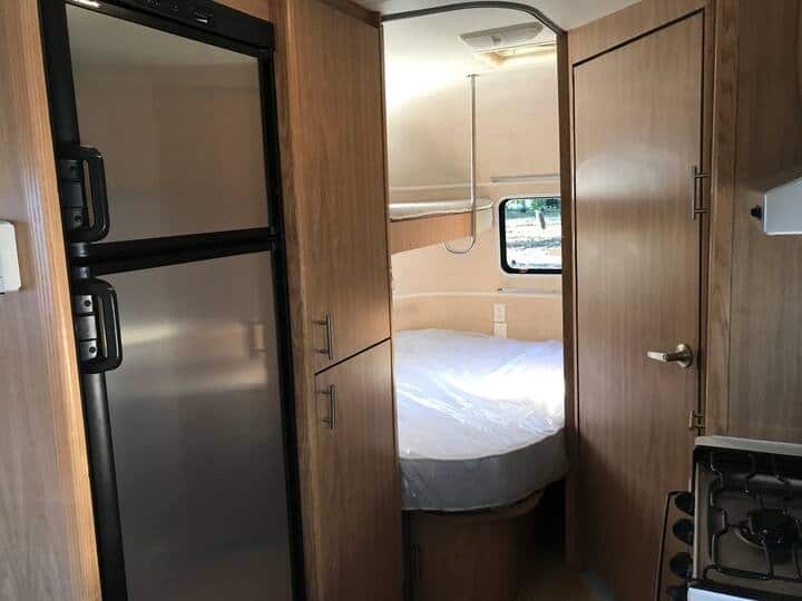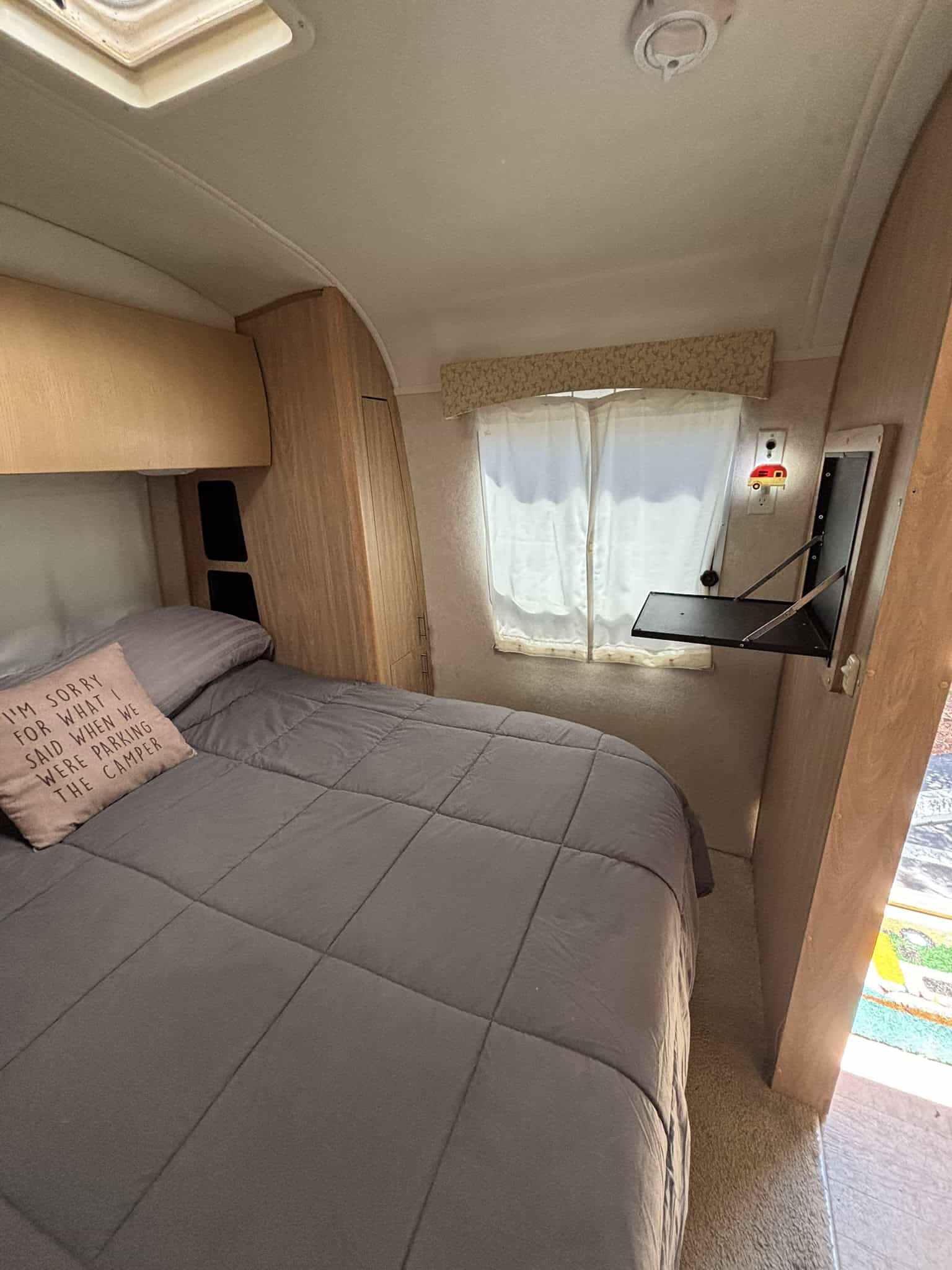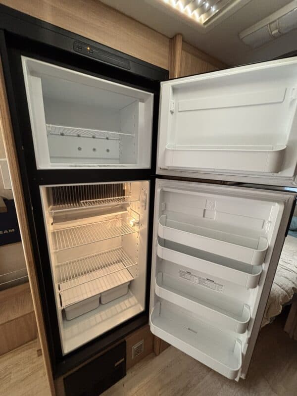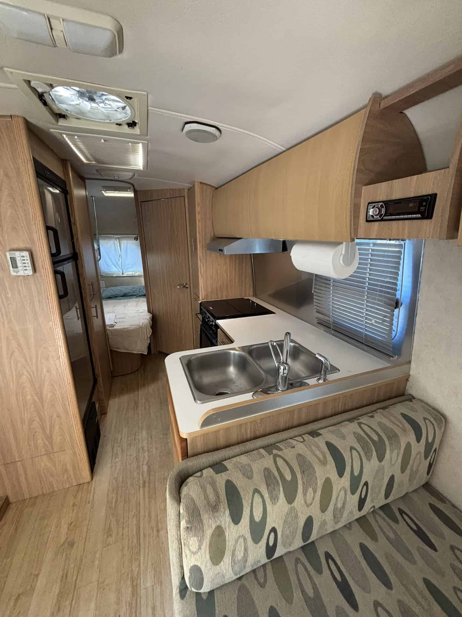 The kids are grown and it’s time to say farewell to the family camper which has served us well in trips all along the West Coast. This luxurious space has a roomy kitchen, bathroom, and main bedroom (queen) as well as a bunk bed (twin bed over double bed). The kitchen has a 3 burner stove, microwave/induction oven, and separate freezer from the refrigerator. The four-seater dinette has whimsical upholstery that complements the tan cabinets. The dinette can be reconfigured into an additional sleeping area. Across from the dinette, there is a desk area which folds down and allows for transporting bikes or other camping equipment. There is plenty of storage throughout (closet, cabinets, drawers).
