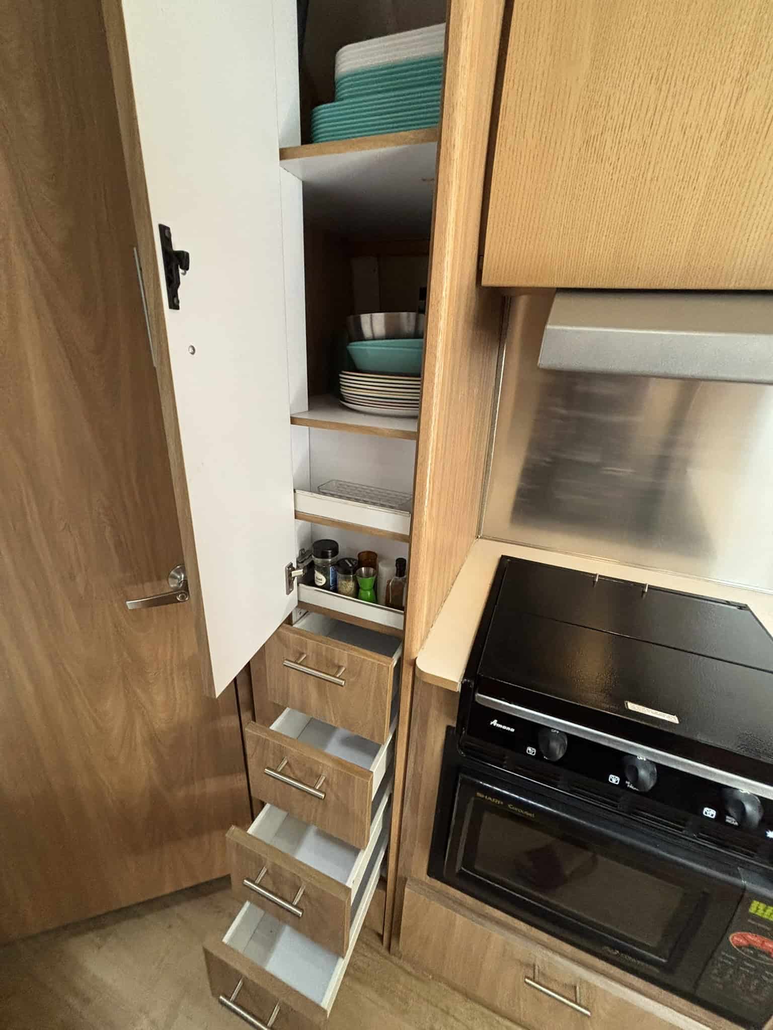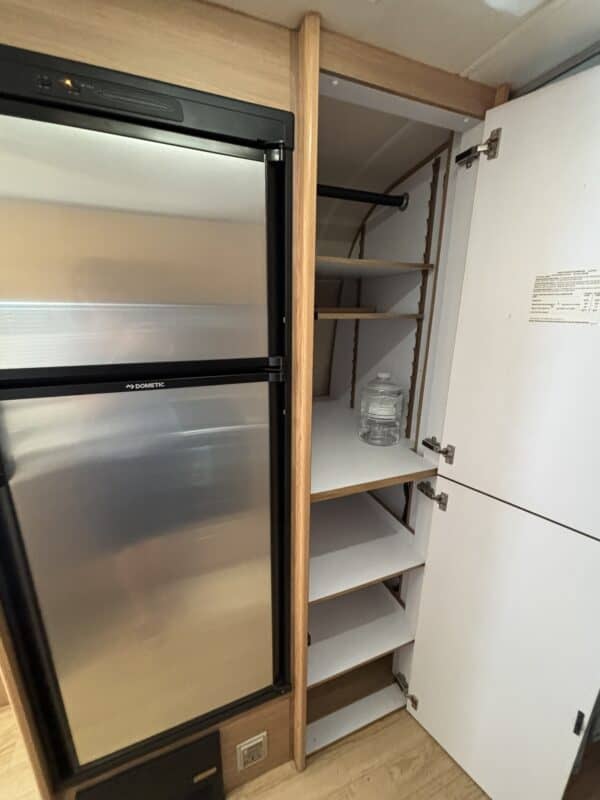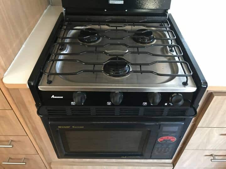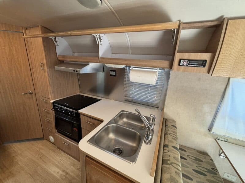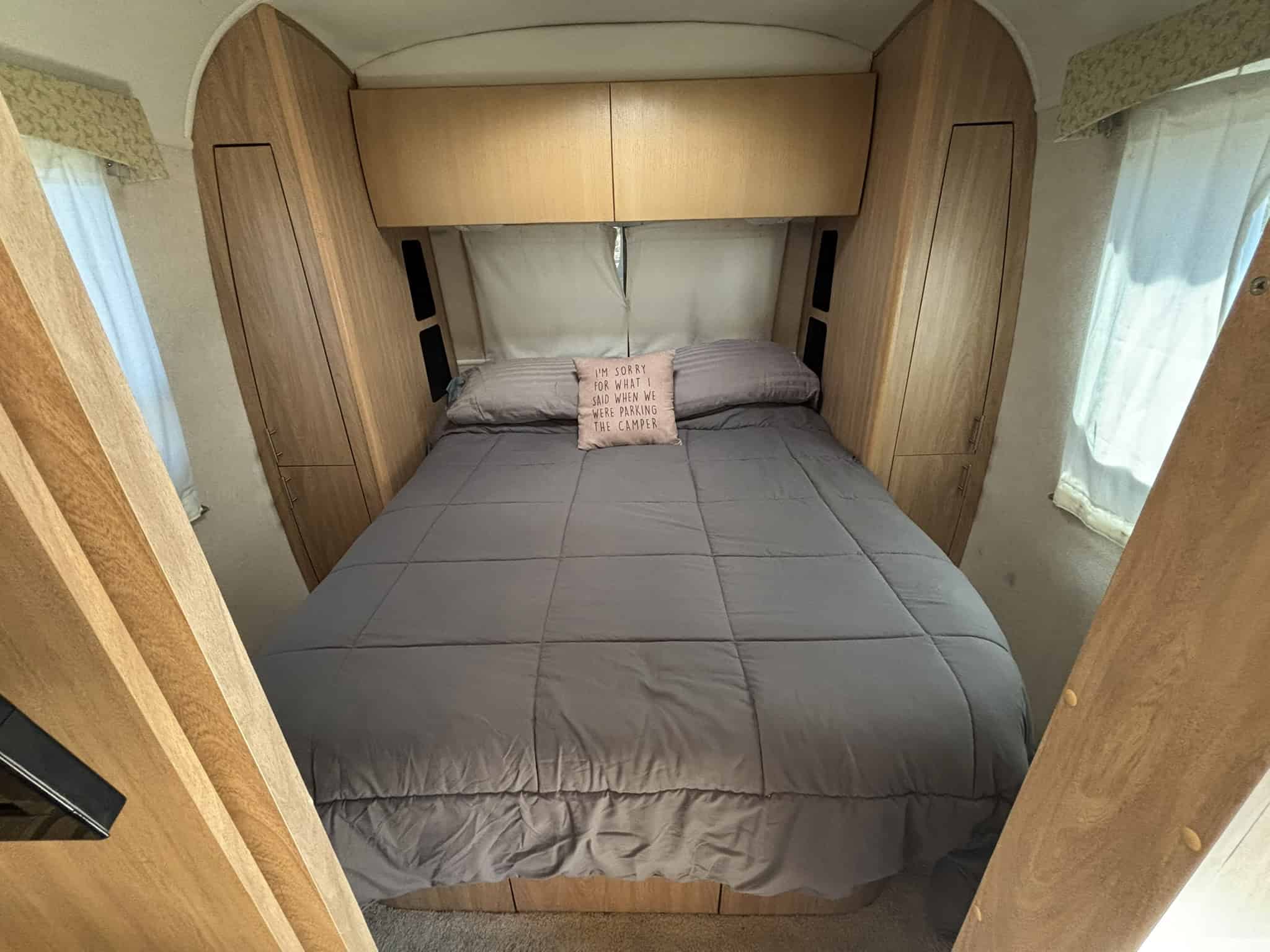 The kids are grown and it’s time to say farewell to the family camper which has served us well in trips all along the West Coast. This luxurious space has a roomy kitchen, bathroom, and main bedroom (queen) as well as a bunk bed (twin bed over double bed). The kitchen has a 3 burner stove, microwave/induction oven, and separate freezer from the refrigerator. The four-seater dinette has whimsical upholstery that complements the tan cabinets. The dinette can be reconfigured into an additional sleeping area. Across from the dinette, there is a desk area which folds down and allows for transporting bikes or other camping equipment. There is plenty of storage throughout (closet, cabinets, drawers).