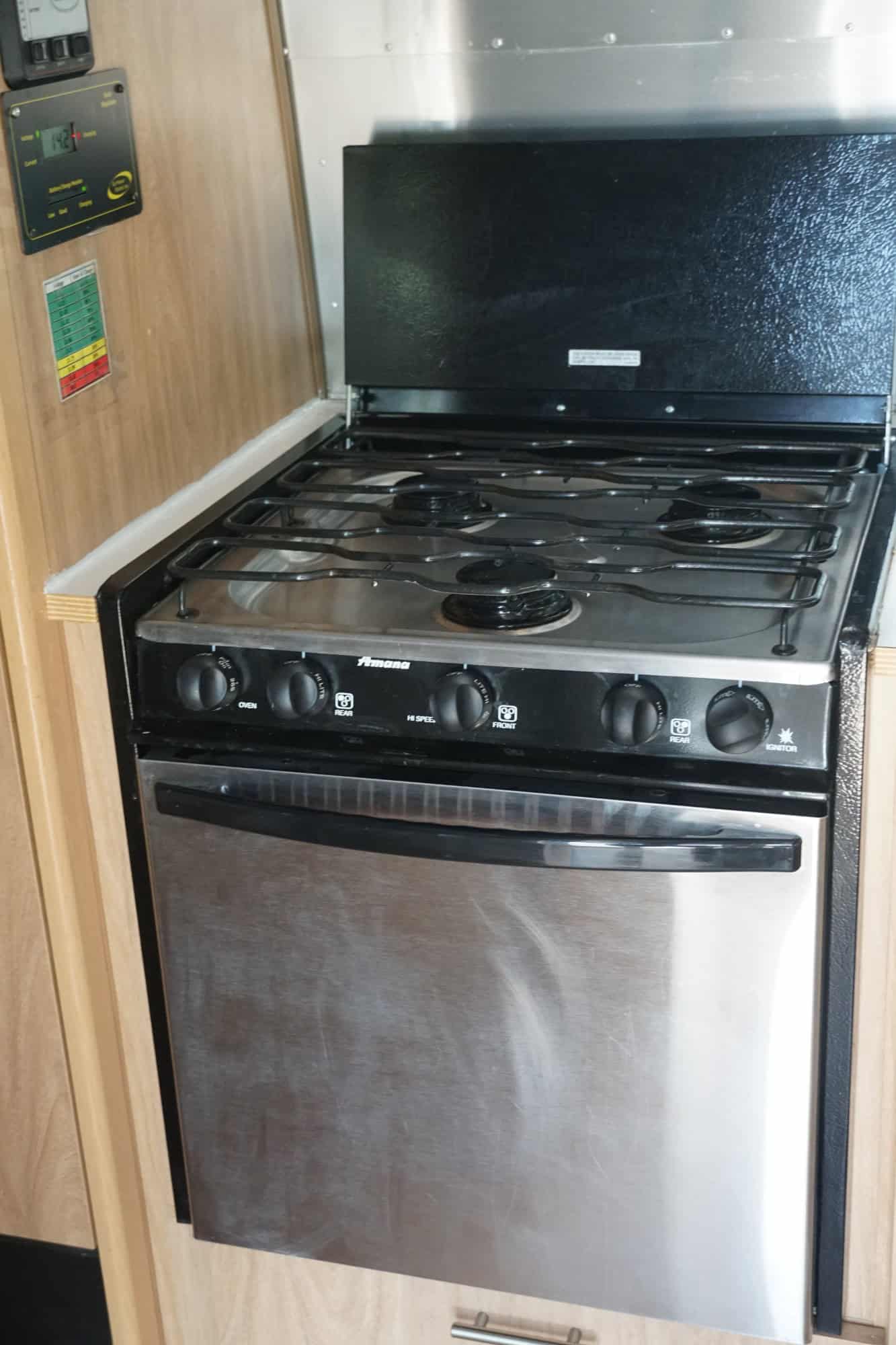 The kitchen has a four person table with panoramic windows, stainless steel sink, 3-burner propane stove and oven, a refrigerator, and ample overhead pantry and serving storage. The bedroom has LED reading lights, speakers, and an accordion privacy wall. The bathroom has a sink, mirrors, a medicine cabinet, and a separate toilet and shower. Kitchen and bedroom share flat screen TV.