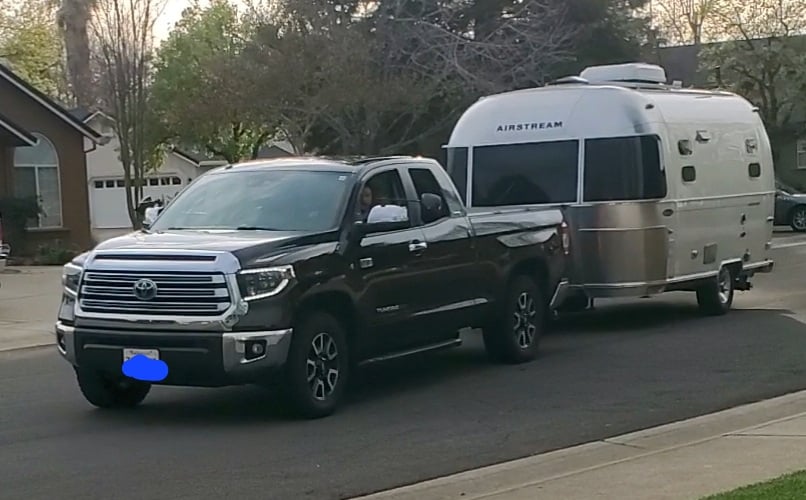This Bambi has a full-size bed in the rear corner and the front dinette table converts into a bed as well (sleeps 4). Has all the standard Flying Cloud features, including laminate flooring, 3-burner stove with oven, 2-way fridge, kitchen sink water filtration, AC, furnace (also ducted to grey tank), water heater, inside dry shower & outside shower, toilet, 2 Fantastic ceiling fans with rain sensors (and small fan over toilet), LED lighting, reading lights, and a good entertainment system. The freshwater tank is 23 gallons, the grey water tank is 21gallons, and the black water tank is 18 gallons. There are two large propane tanks on the tongue, as well as two 3-year-old AGM batteries (tongue weight around 500 lbs.). Of course, there is also a manual awning that is pretty easy to use once you get the hang of it. Very easy towing with our Tundra.