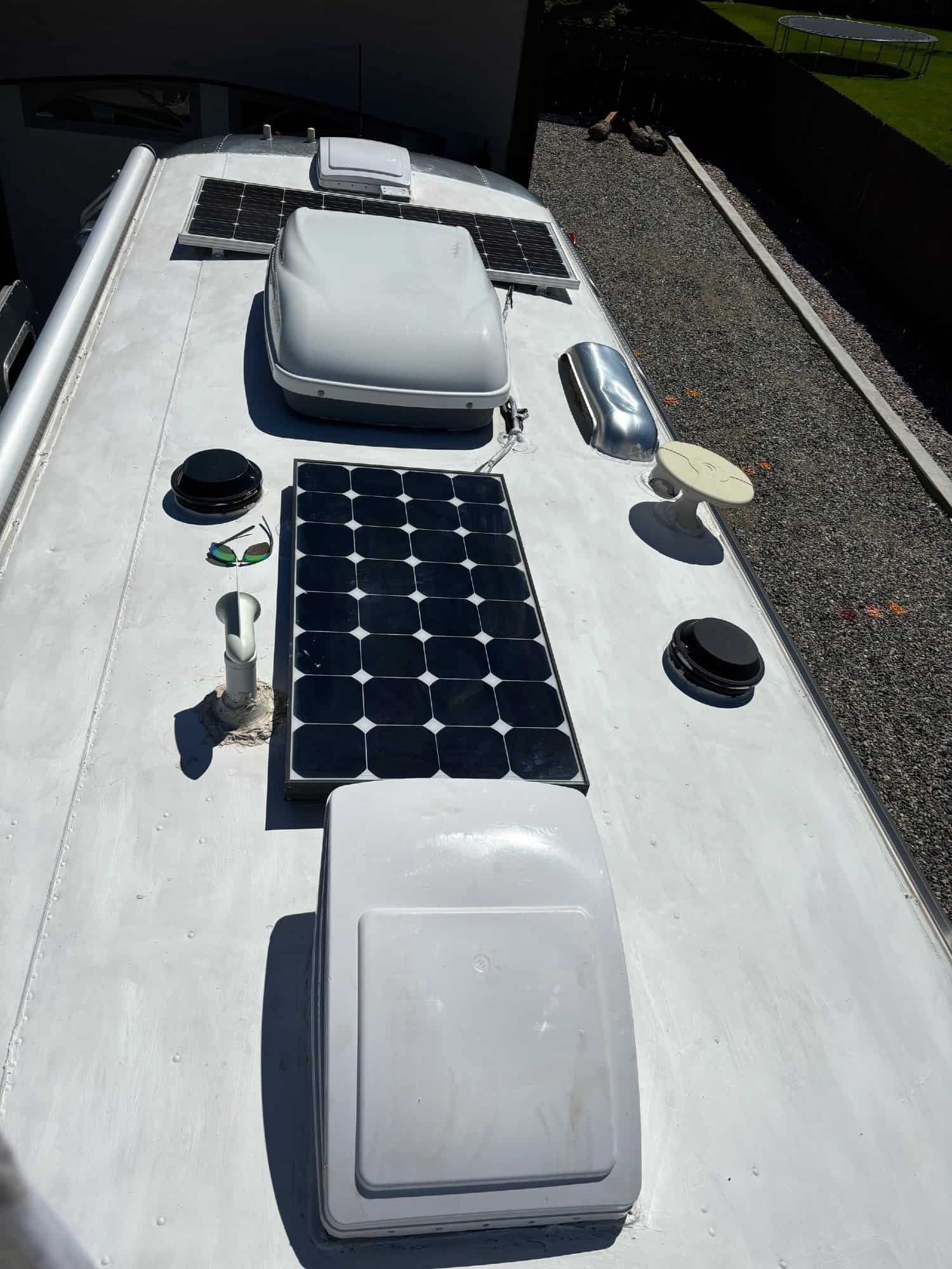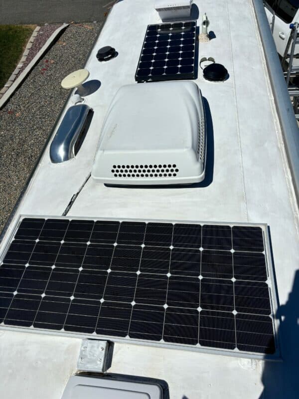 There is a Go Power Solar system with 2 solar panels for a total of 240 watts. The under the bed compartment has been completely lined with 1” foam to protect video equipment, and the area does have a separate lock.