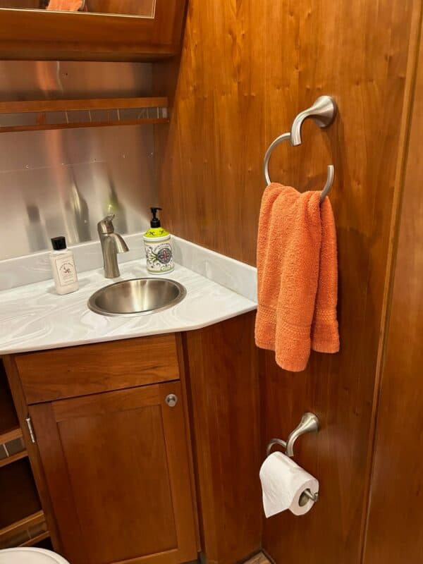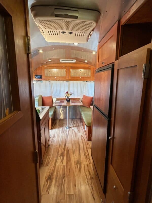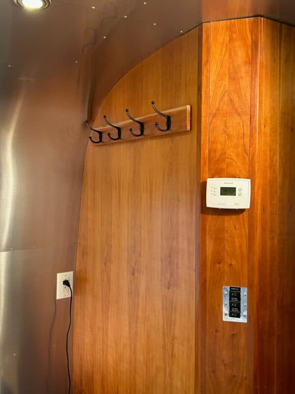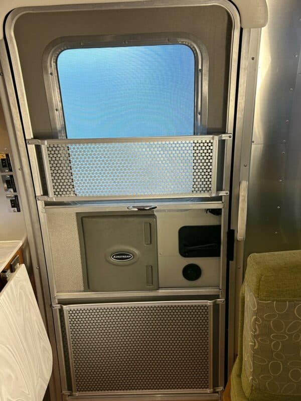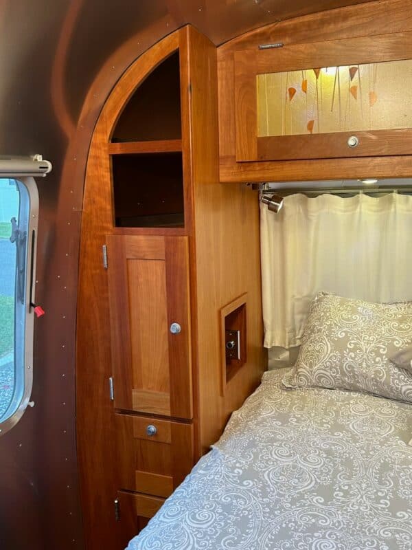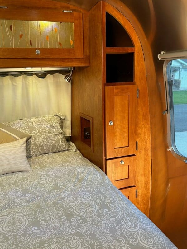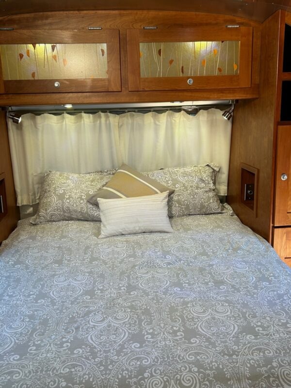 One of the things we like most about this trailer is the walk-around queen bed with shelf storage on both sides. This is not normally seen in a 25’ Airstream which usually has a “crawl-over” queen bed or twin beds.