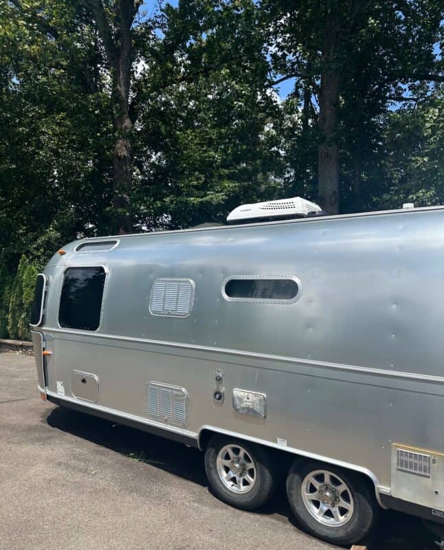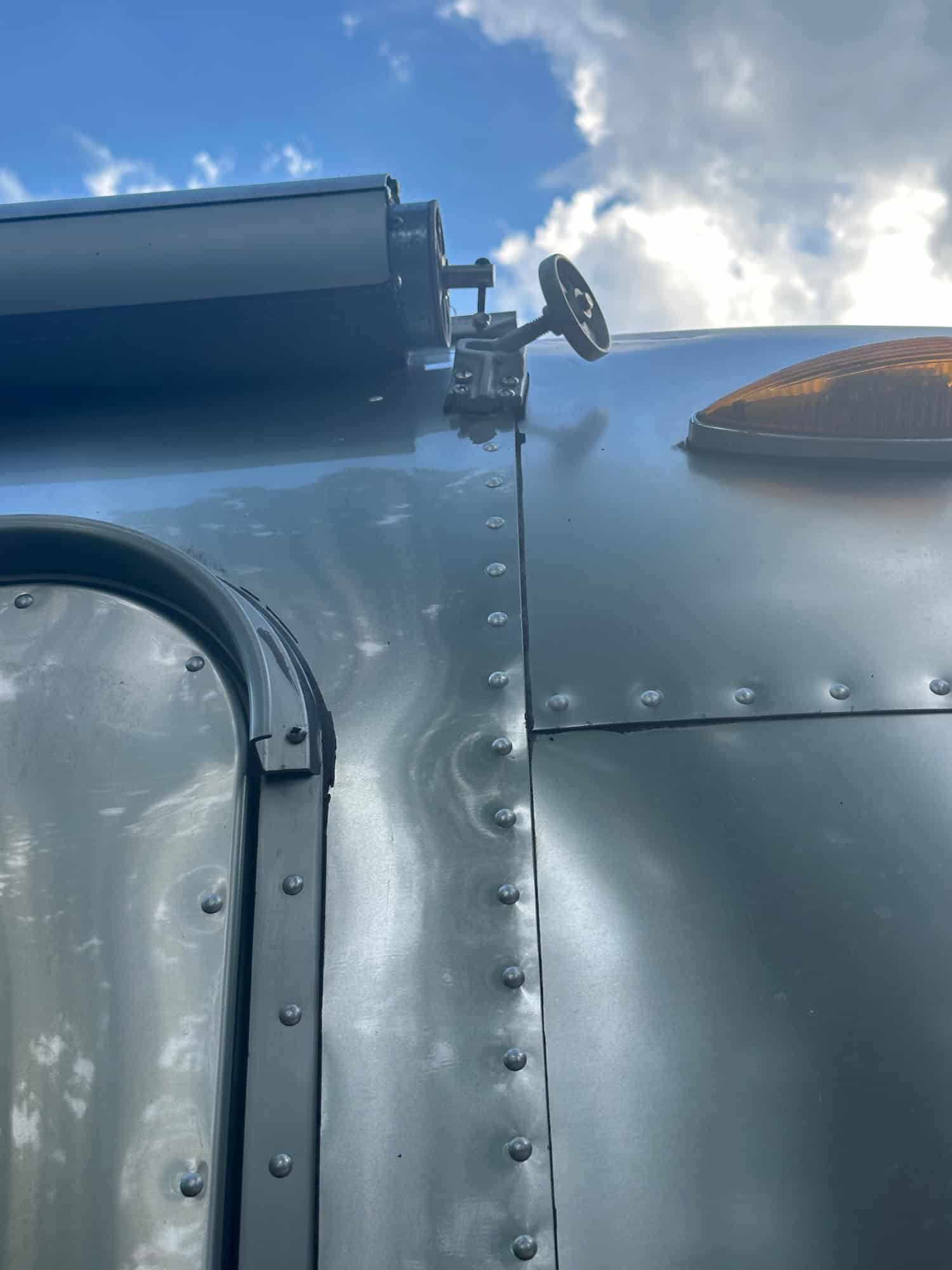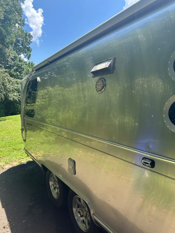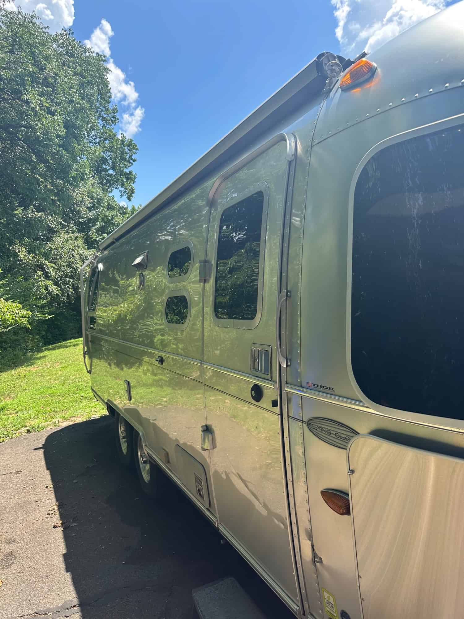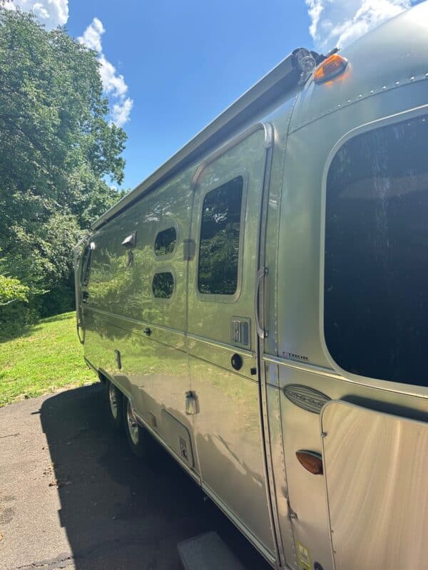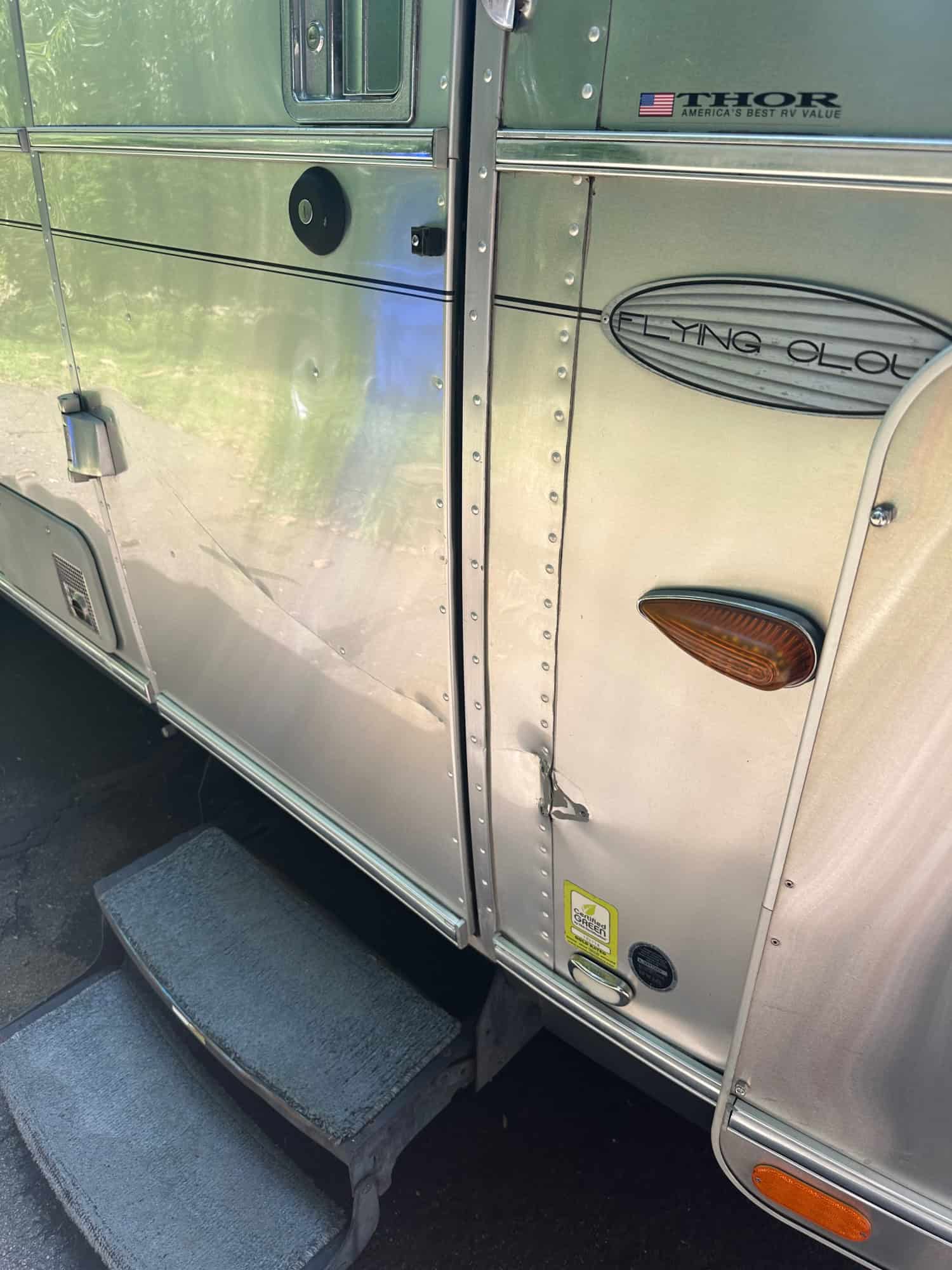 The awning still functions well, although one of the arms was removed after it broke. There is a light scratch on the side and a small dent near the exterior door handle, but these are cosmetic and do not affect use.