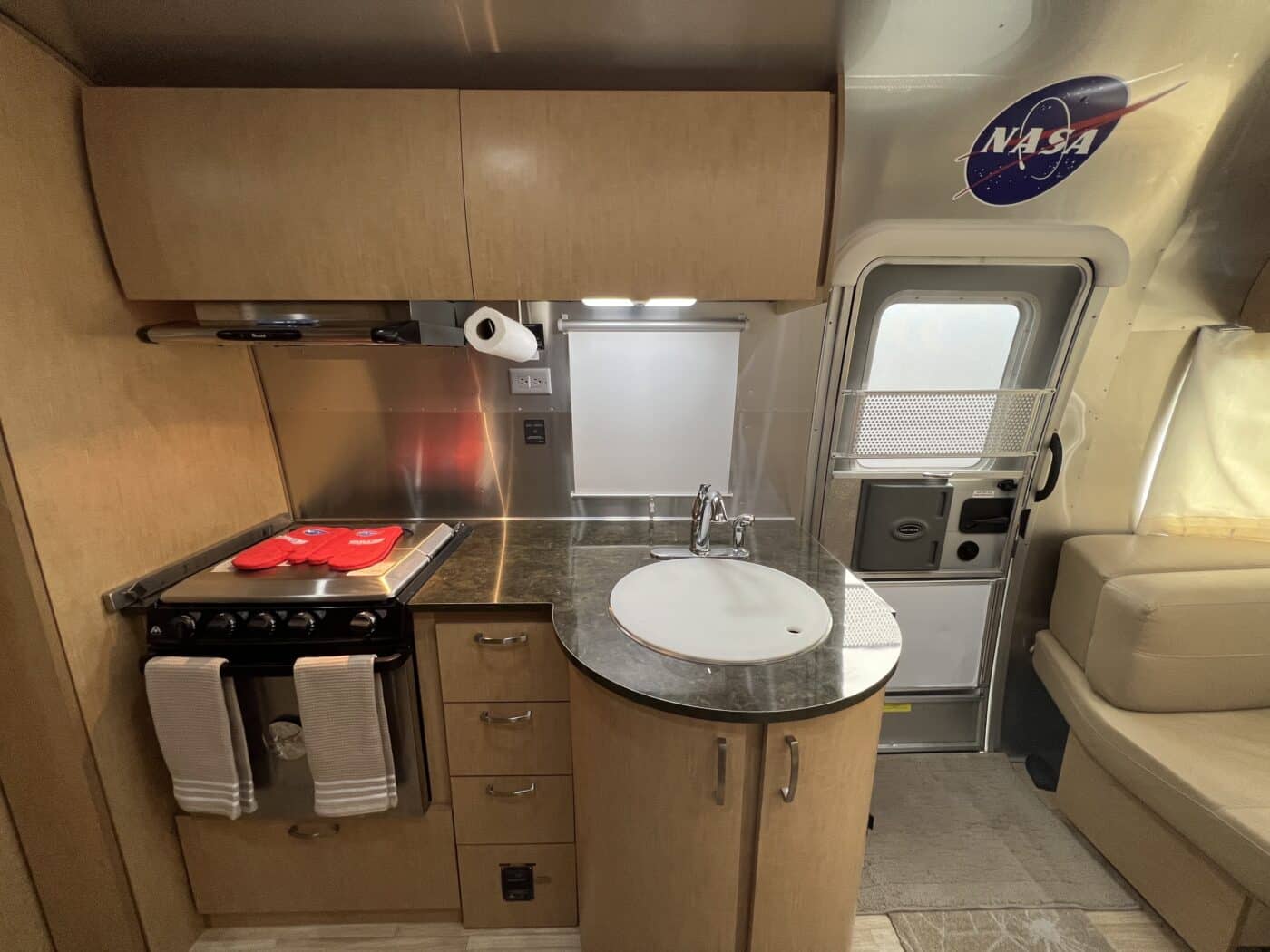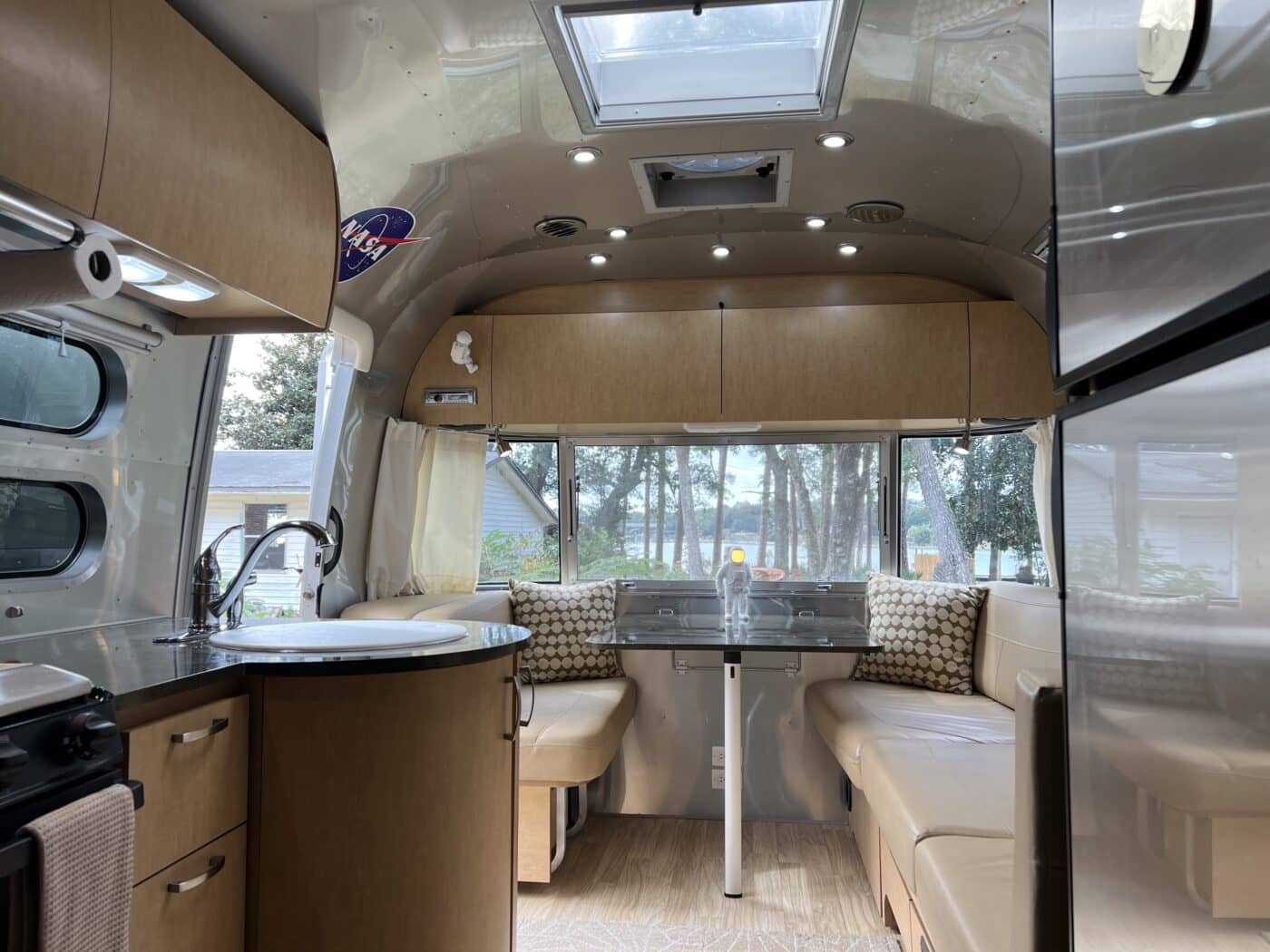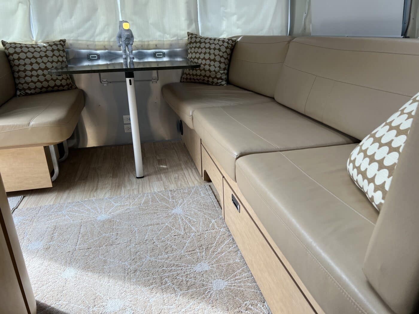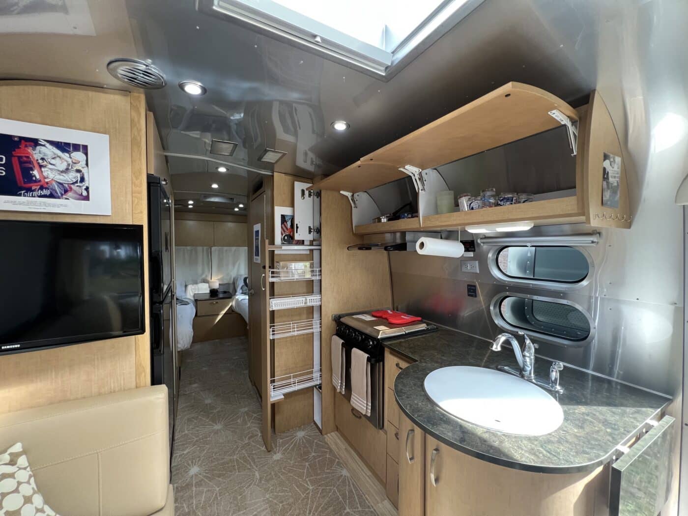 Twelve Airstream windows wrap around the front and rear of the unit, plus a skylight, allows you to enjoy 360 degree vistas. 2 Fans in ceiling 3 speeds with thermostat control; skylights with shades. The dinette and extended couch are upholstered in buttery soft cashew gold leather that is in perfect condition and very comfortable to watch movies or play games. Twin beds and the dinette and lounge sofa convert into bed space for 2 adults or three children. The spacious kitchen with fridge/freezer (propane/electric) 3 burner stovetop/oven and sink is perfect for serving family meals and has two pantries, loads of storage. The stereo Bluetooth/Blue Ray player with surround sound and first tv are perfectly located in living area. All LED lighting with dimmers throughout. All cabinets and floors are gold alchemy, the lightest and cleanest look Airstream produces. (Never smoked in.)