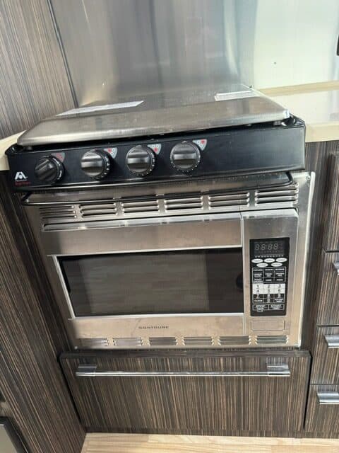 • Full kitchen with 3-burner gas stove, Contoure microwave/convection oven, and refrigerator/freezer