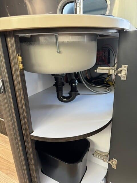 Thoughtful custom touches include a custom walnut sink cover with a half-circle prep area, adding both style and extra counter space, and a custom-fit dog mat that tucks neatly under the dinette table — ideal for travelers with pets.