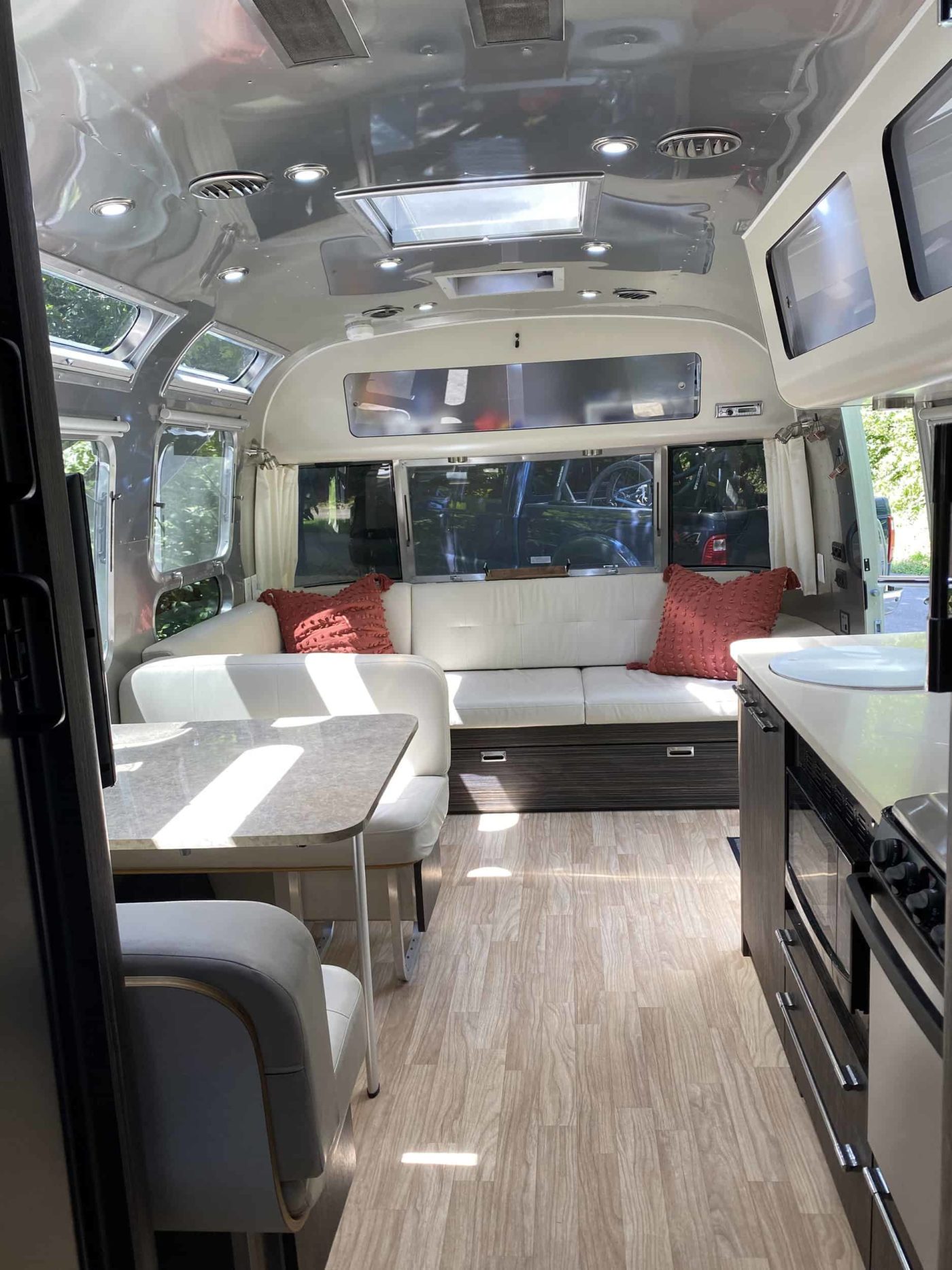 Why we love this Airstream: This is arguably one of the most comfortable layouts, with an amazing lounge area, great leather and tons of windows. It can sleep 6 adults total. Plus ton of storage!