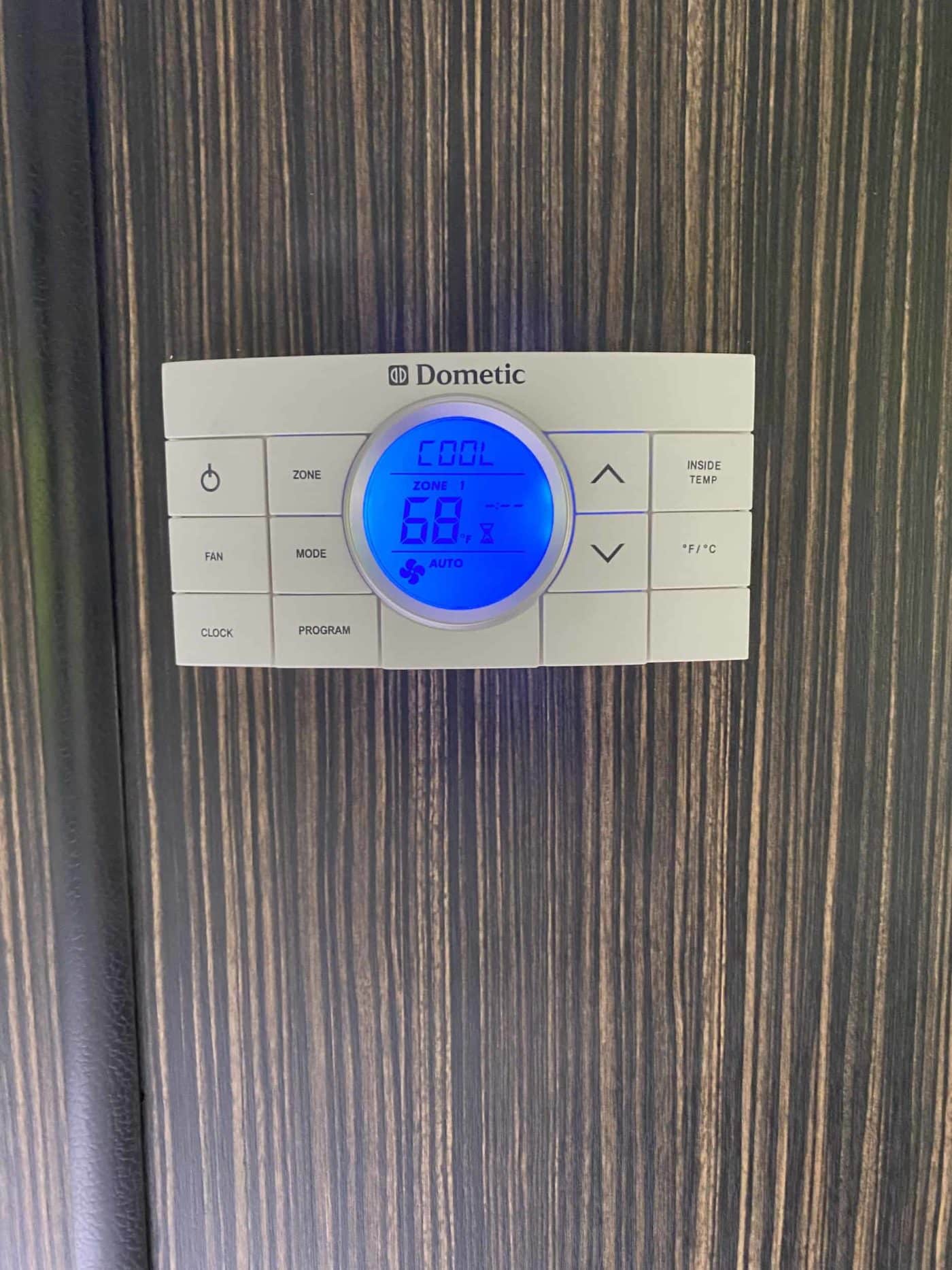 This unit has two ducted AC units with duel zone climate control, microwave, three burner stove, and a separate gas oven, three-way 8 cubic foot fridge, 1,000 watt inverter, fantastic fan, and a 6 gallon water heater, and electric jack.