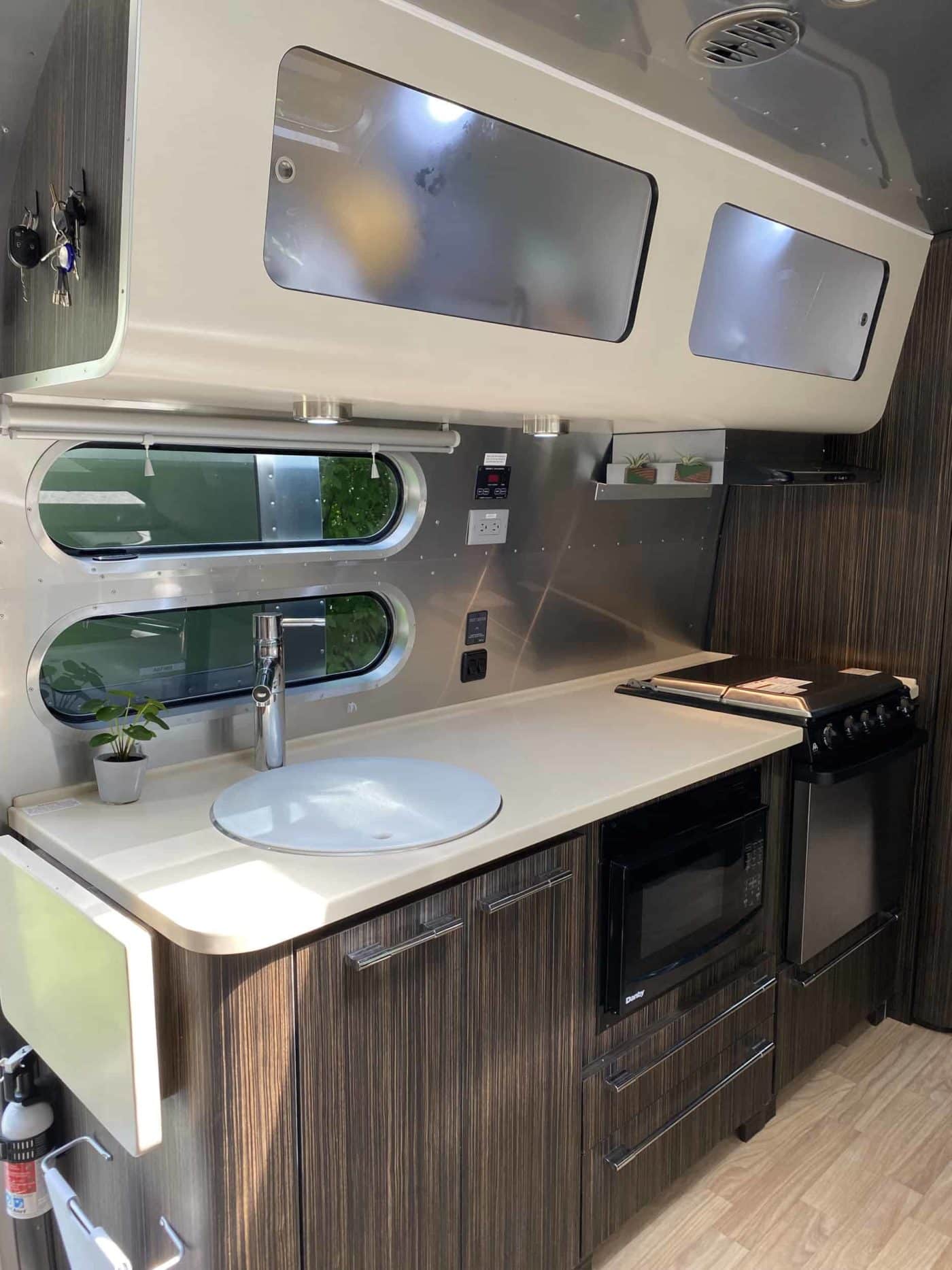 This Airstream looks and feels brand new, we only use natural cleaning products and Happy Camper natural treatment in our tanks. We also filter all water with a ClearSource Ultra (3 filters) before it goes into our tank. The only two hiccups we’ve seen are: (1) the faceplate of one of the ceiling vents in the bedroom falls out after a bumpy ride and just needs to be pushed back in; and (2) there is a 1-2 inch piece of the dinette table trim (on the side) that is peeling off. We were planning on replacing the table anyway, but it should be an easy fix if you want to do it.