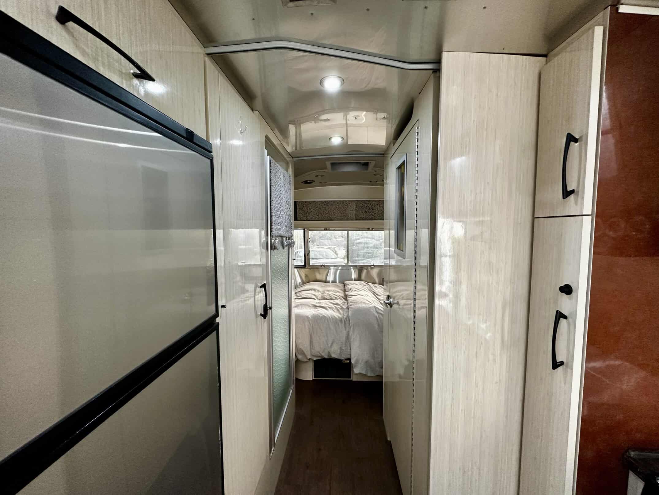 Lovely 25′ front bed International Serenity. For those not familiar with Airstream makes, the International is a step up in quality from the entry level models such as Bambi and Flying Cloud. This model features light and bright cabinetry and upholstery, solid surface countertops, upgraded lighting and fixtures, as well as the signature Airstream windows that let in all of the sunshine. At 25′, it’s nimble, relatively lightweight and tows like a dream. It’s also under the size limit for nearly all National Parks.