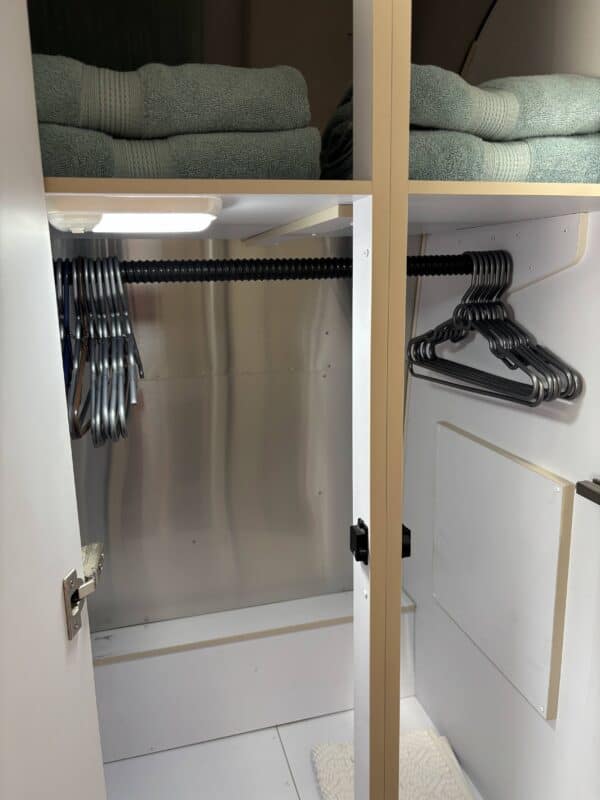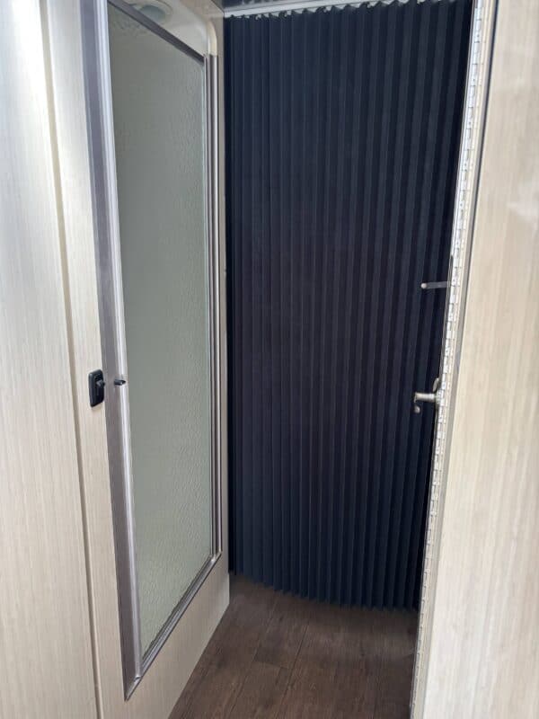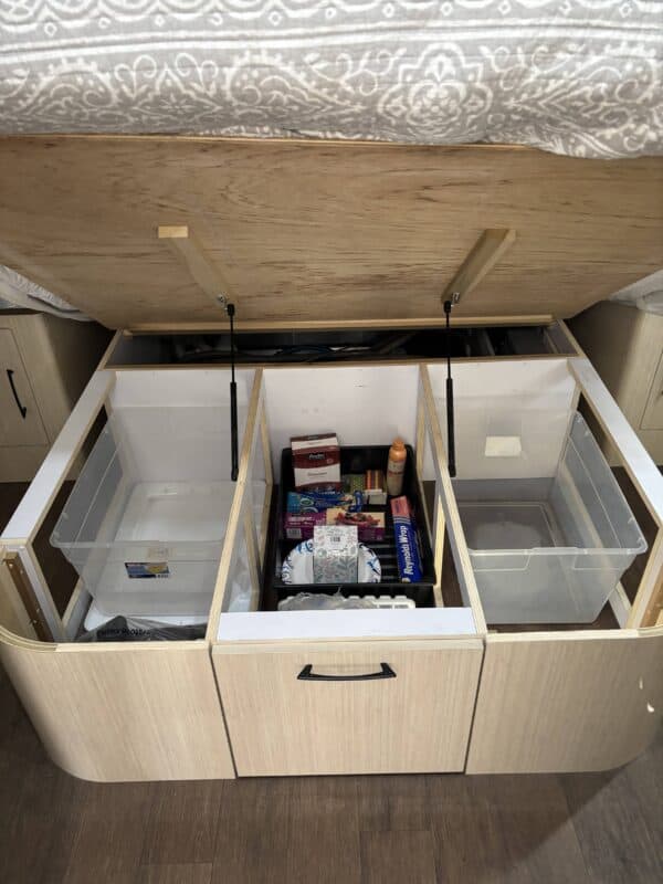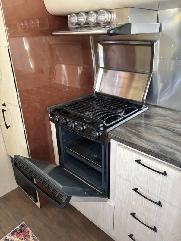 This Serenity is equipped with a 6-gallon water heater (electric and propane), a three-burner propane stove, propane oven, microwave, and a Dometic refrigerator that runs on propane or electricity. Heating and cooling are handled with ease via a forced-air furnace and two factory-installed A/C units (can run on 30 or 50 AMP).