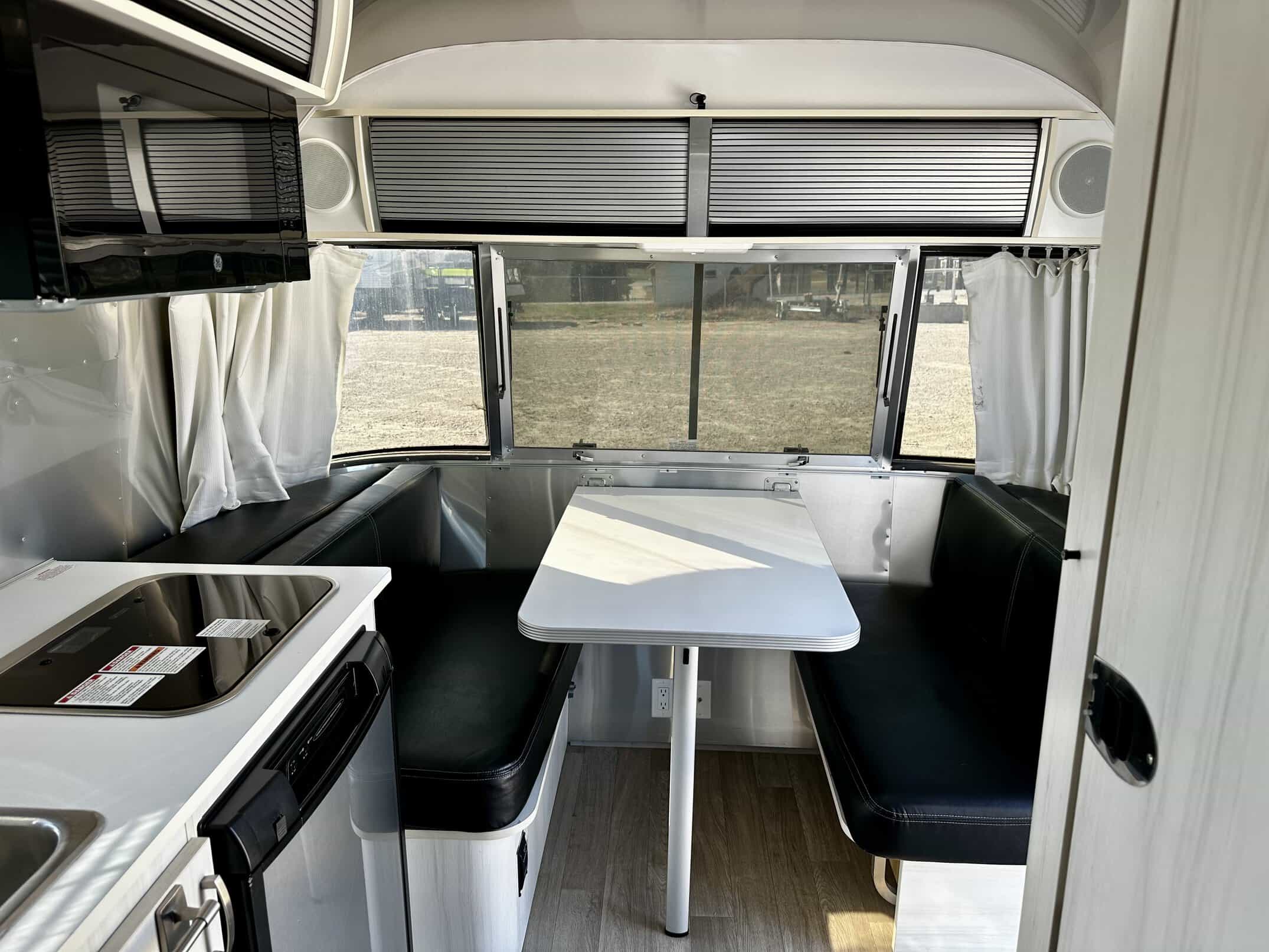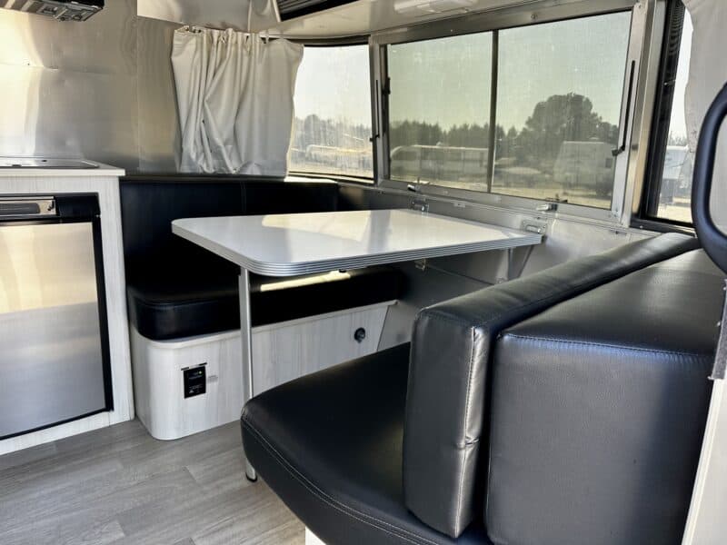 This charming Airstream features a beautiful White Cypress and Black Ultra Leather Interior Decor, perfect for cozy getaways. Enjoy the breathtaking views through the Front Panoramic Windows, and easily convert the dinette into a comfortable bed.