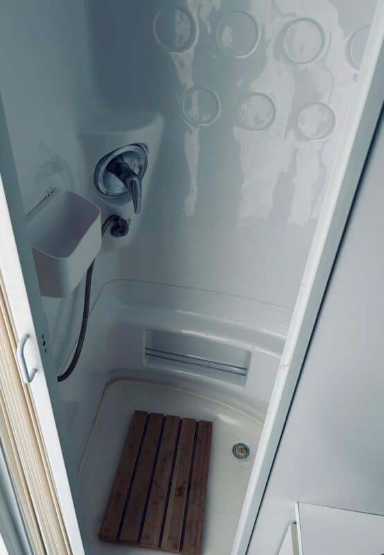 Large shower with bench seat and shower door (comfortable even for tall people)