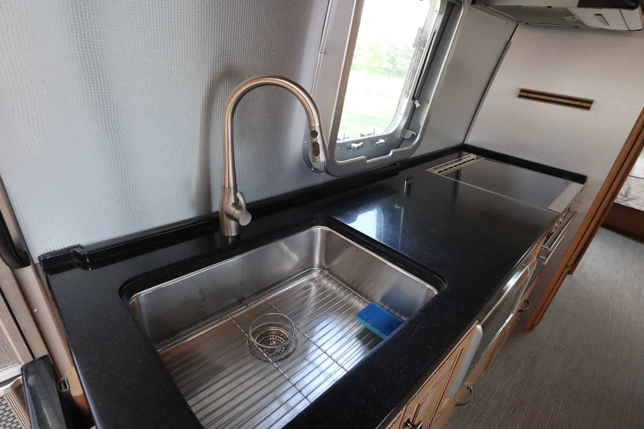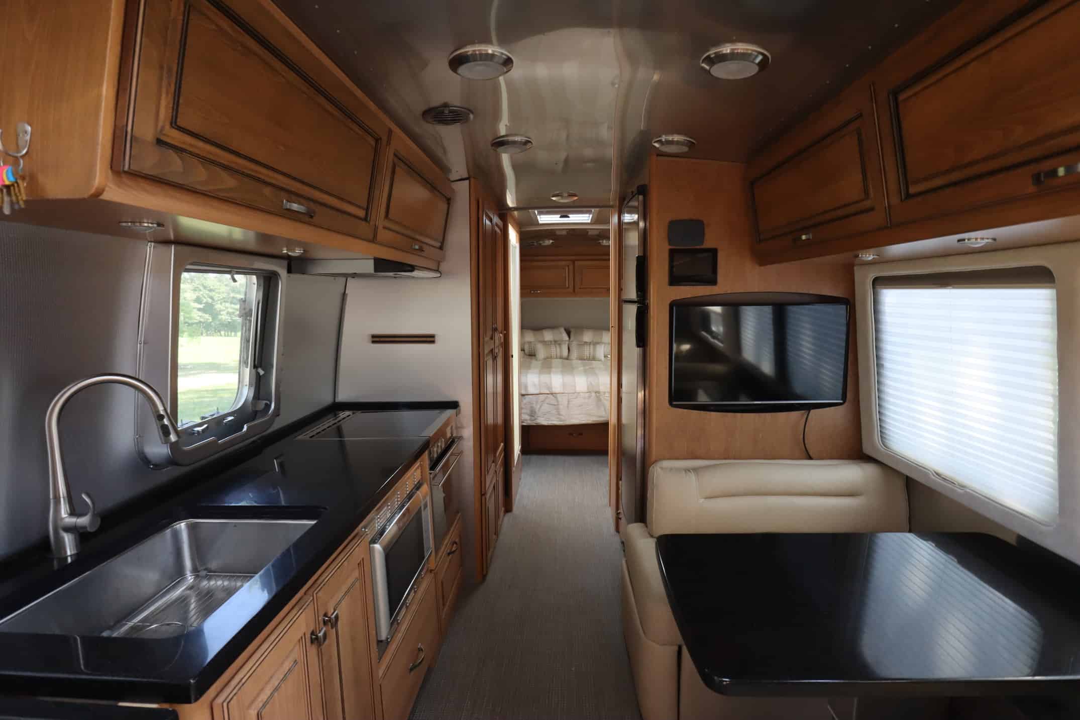 The rear queen bed comes with a comfortable memory foam mattress that ensures restful nights, while the dinette and lounge area easily convert into extra sleeping space for guests. Whether you’re cooking up a feast in the well-equipped kitchen or catching up on your favorite shows in the living area, every inch of this Airstream is designed for comfort.