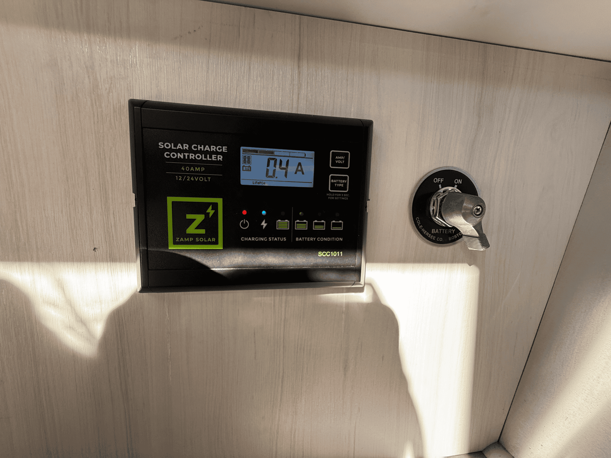 Zamp Solar Charger panel installed for constant charging of batteries even when battery switch is off position