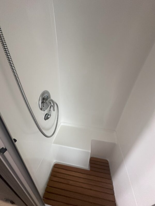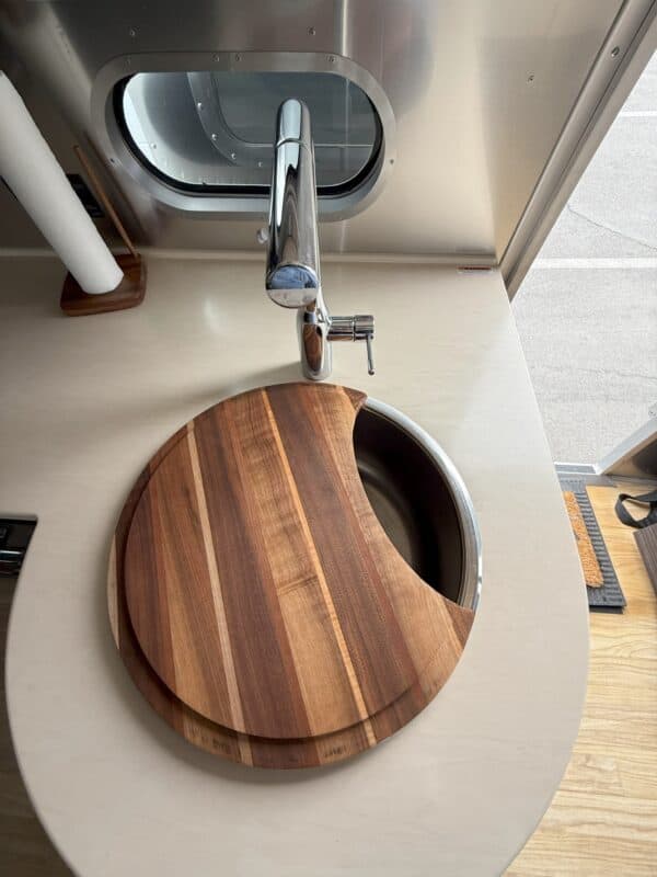 Extras: Backup camera, 400 watts of built in rooftop solar with upgraded Lithium batteries, removable teak wood mat in shower, solid walnut sink cover/cutting board & dining table, organic bamboo bedding included.