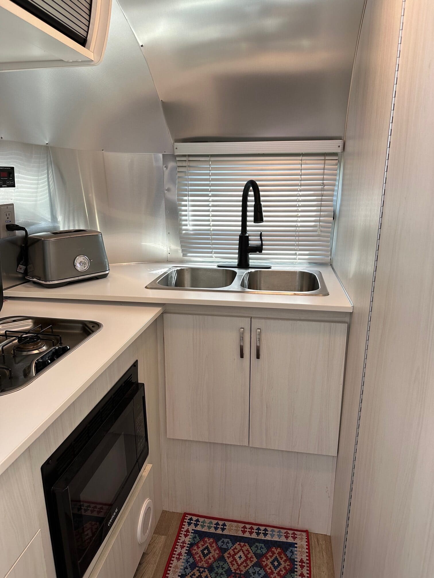 Step inside and you’re greeted by Airstream’s smart design and attention to detail. The front sleeping area features the original mattress and a spacious feel, while the convertible dinette across from the entry offers extra sleeping space or a comfortable dining setup. The kitchenette, running along the street side, includes a gas stove, NovaCool R4500 refrigerator, microwave, and upgraded black Moen faucets for a touch of style. Across the aisle, the rear wet bath is complete with a separate toilet and shower, sink with cabinet storage, and everything in perfect working order.