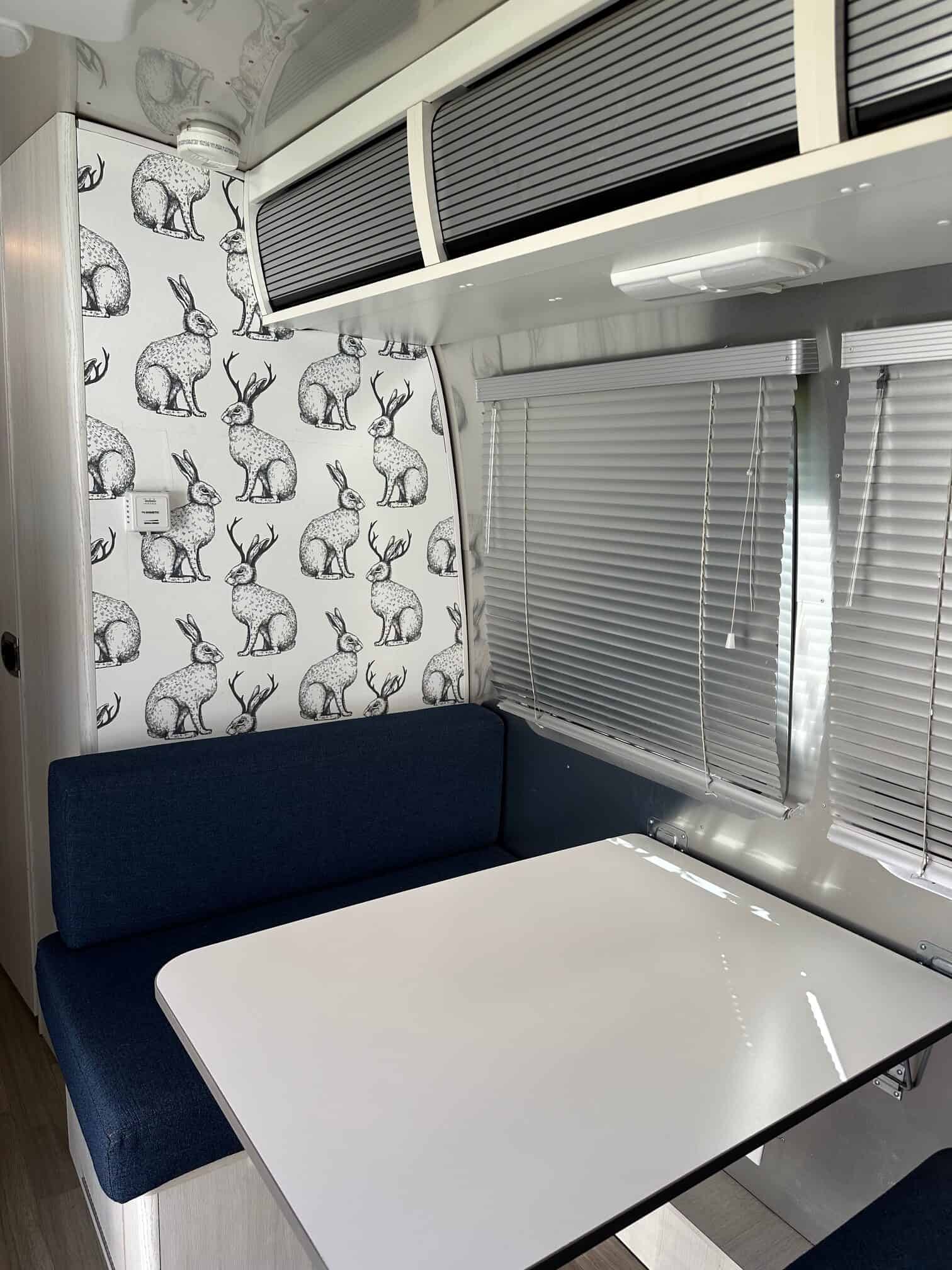 The original flooring, cabinetry, and soft surfaces show only light use. Cushions, blinds, and upholstery are all in excellent condition. One wall sports a quirky jackalope wallpaper—an unexpected and fun design detail that’s sure to stand out. Climate control is handled by a centrally located AC unit and a ducted furnace, so you’re road trip ready in any season.