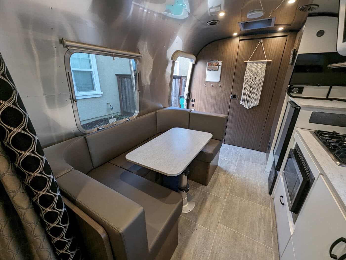 Interior: Modern and sleek design with panoramic windows. Includes a convertible dinette, comfortable sleeping area, and ample storage.