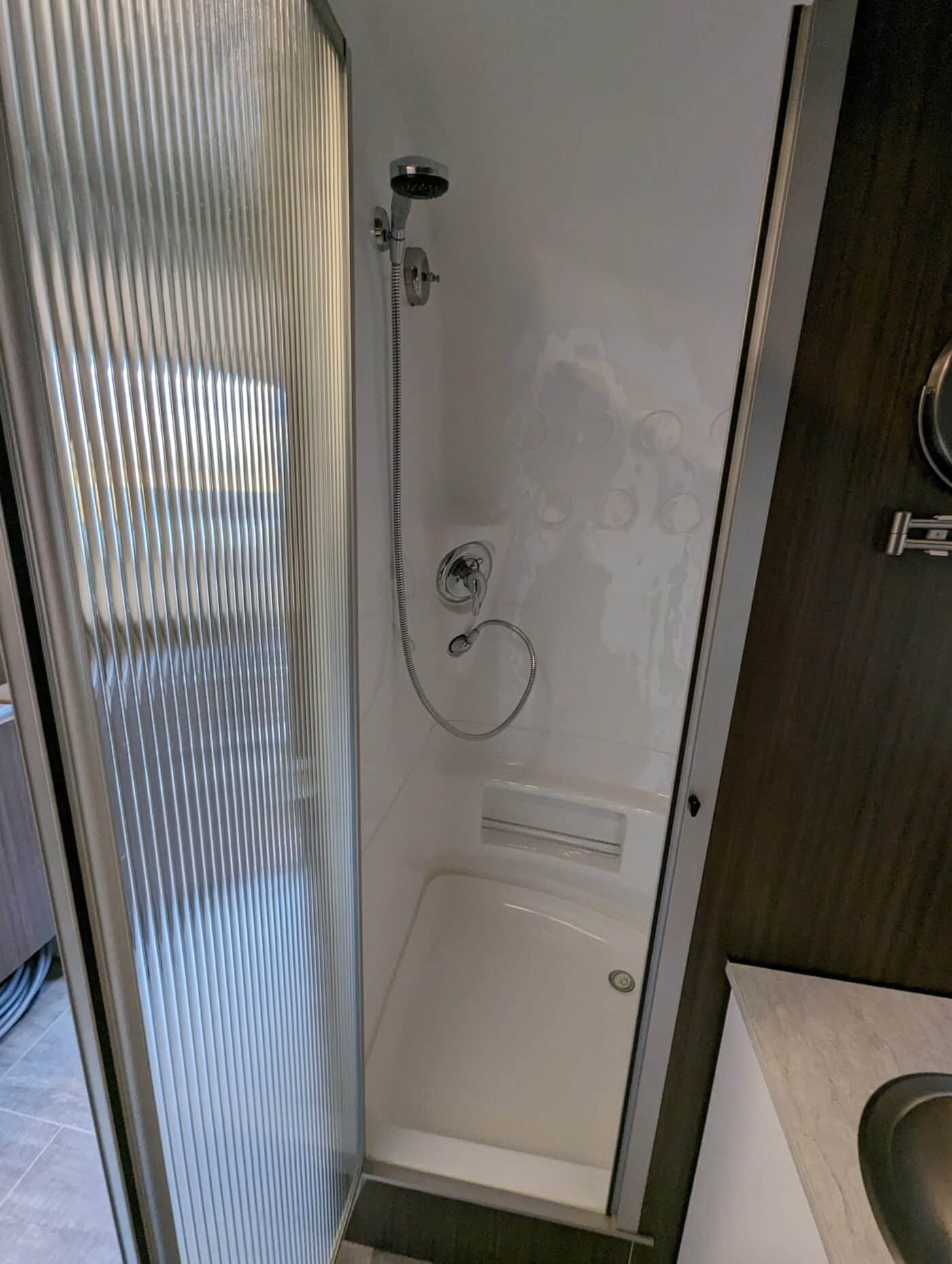Bathroom: Spacious rear bathroom with a walk-in shower, toilet, and vanity.