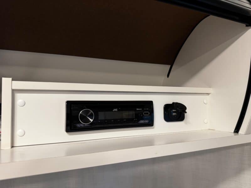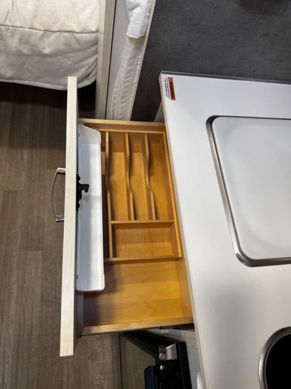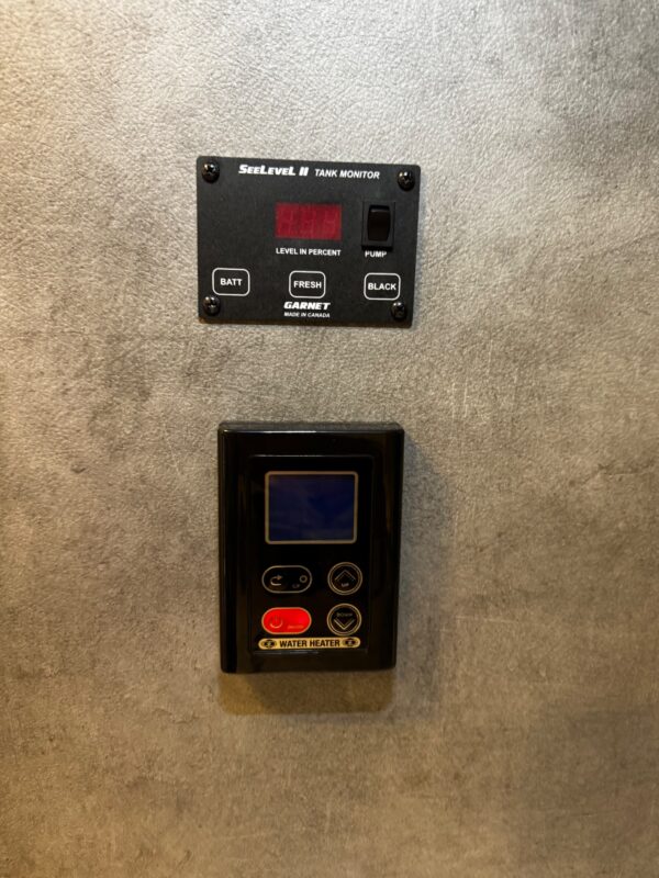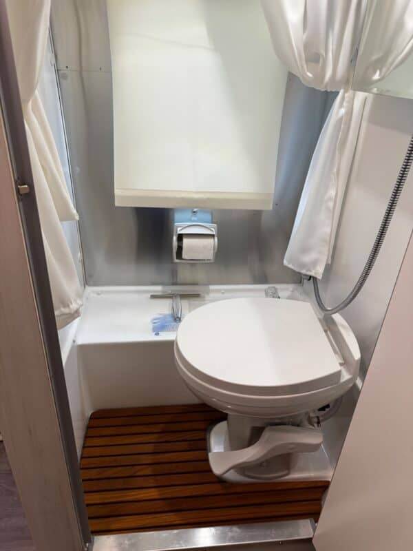 The rear bed, with a memory foam mattress, is very comfortable and includes a TV with HDMI connections. The wet bath has a teak shower mat, mirror, medicine cabinet, and laundry line. Additional features include satellite, solar panels, heating, air conditioning, dual propane, USB chargers, an outdoor shower, a retractable awning, a fully winterized undercarriage, and a backup camera. Stored and meticulously maintained in Southern California. Very user-friendly travel trailer.