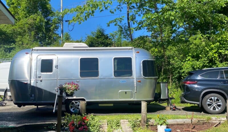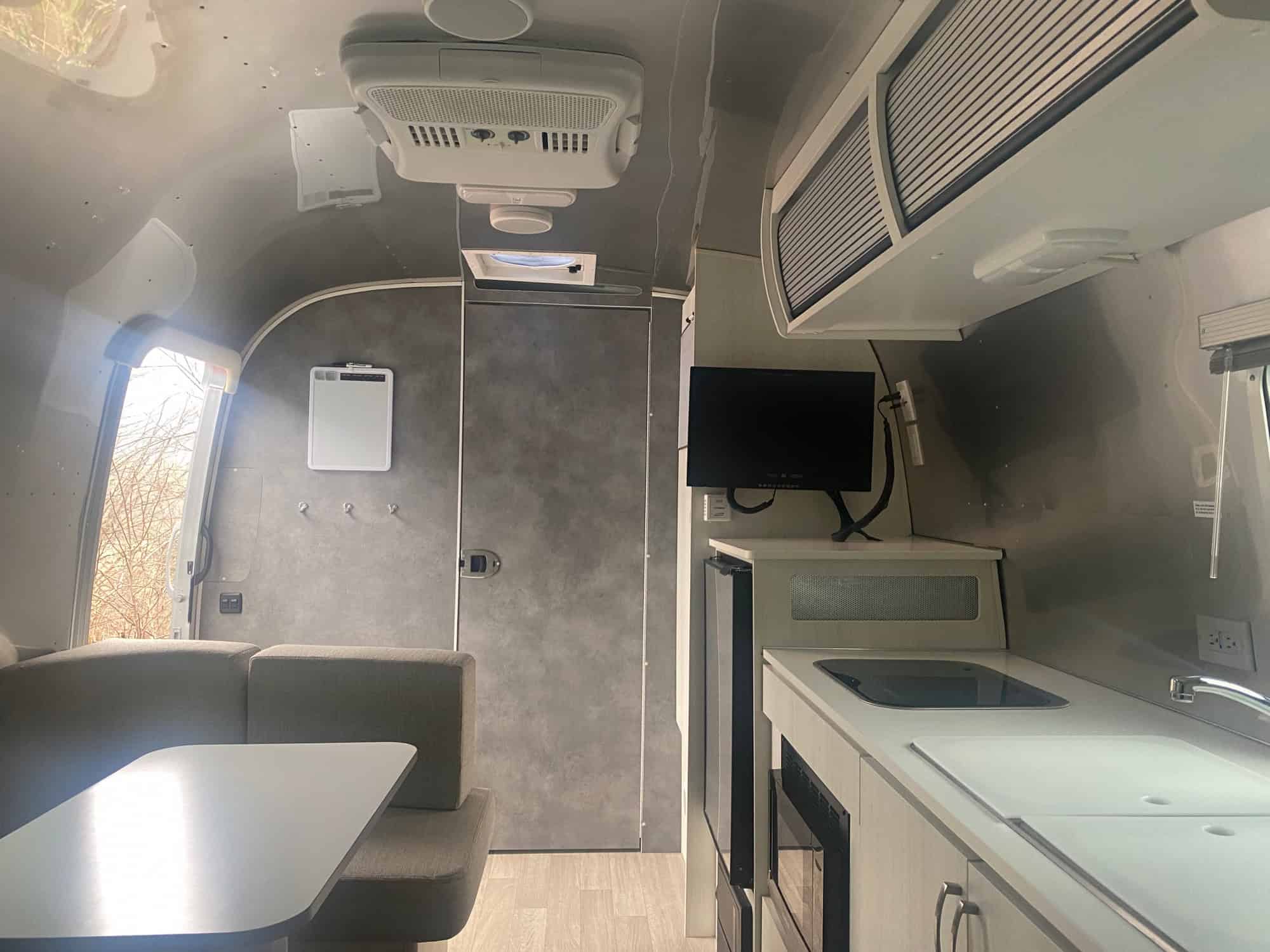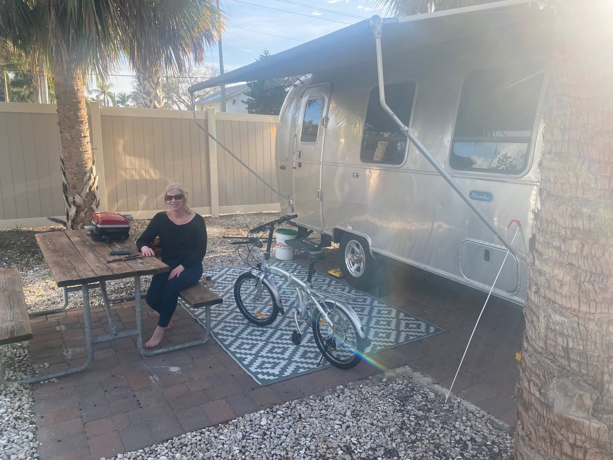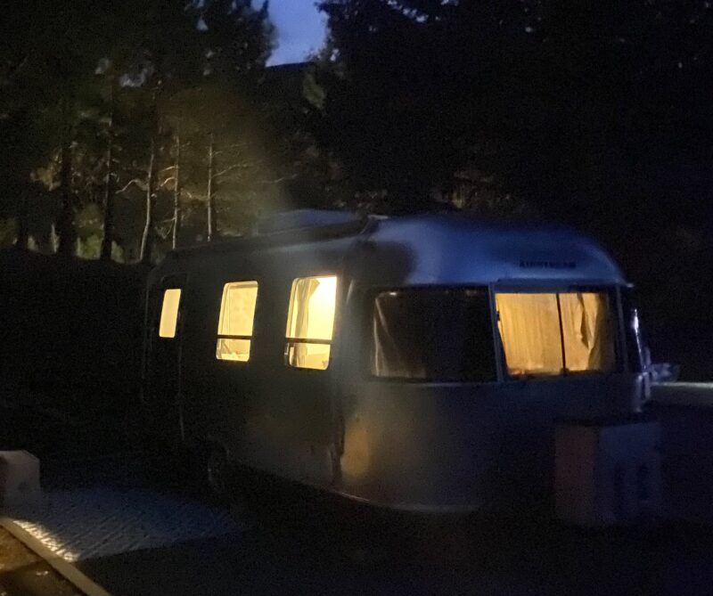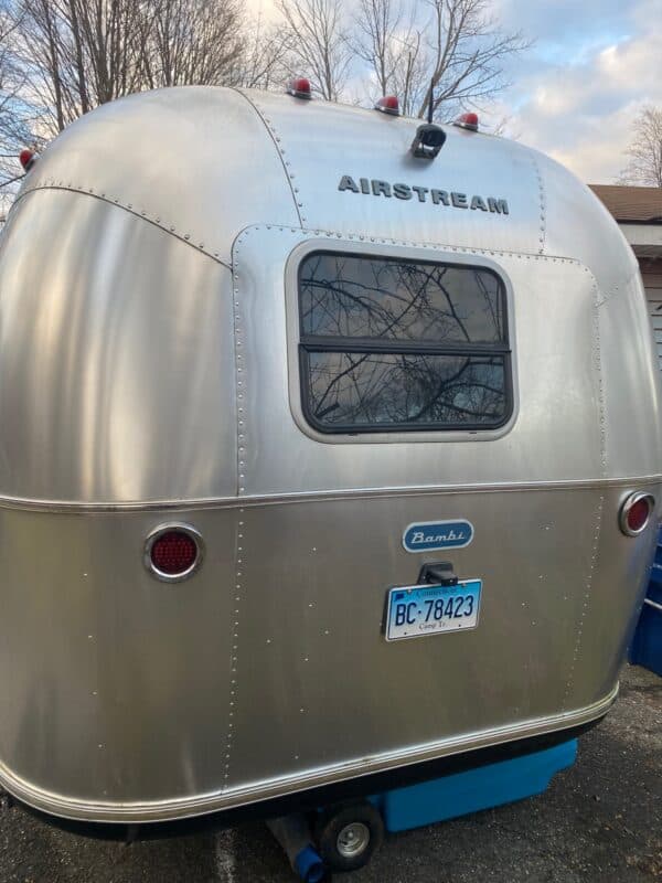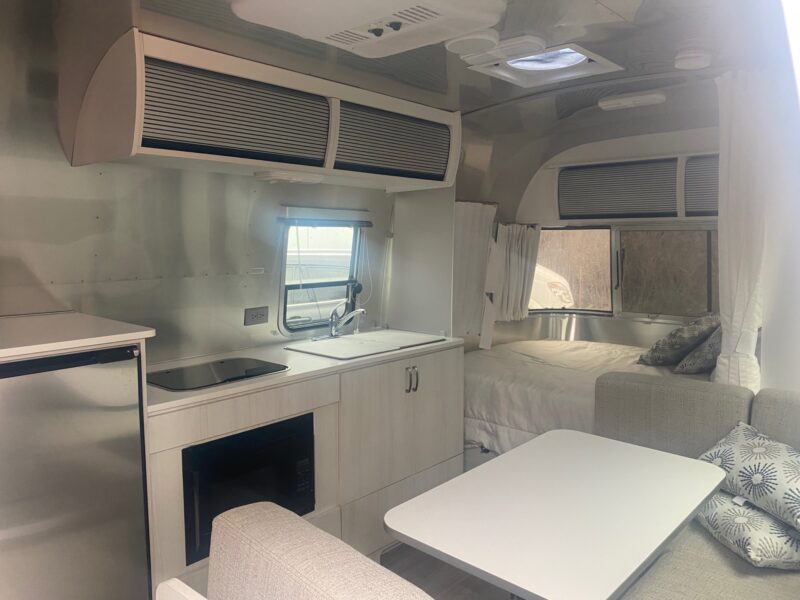 Silvergirl for sale. 22′ Bambi with spacious interior. Comfy bed and dining table that can adjust for guests. Stovetop, microwave, refrigerator, sink. Full bath with shower and hot water on demand plus outdoor faucet hookup. Crank windows and awning. Solar panels.