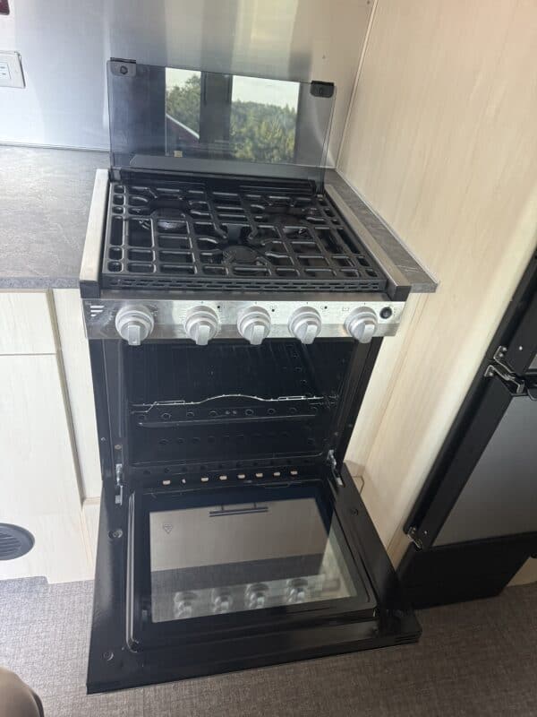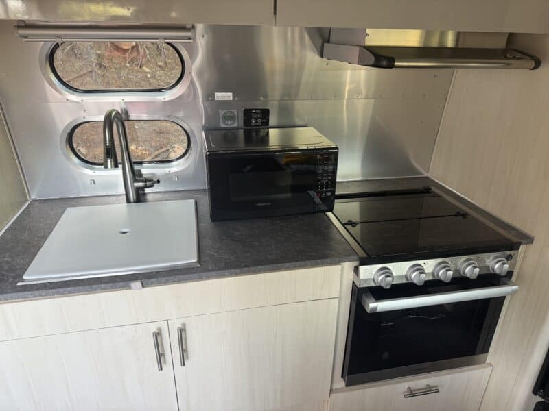 This trailer comes with an LP Oven and NOT the convection microwave oven. However I am including a microwave that can sit on the countertop and be used while plugged in to shore power.