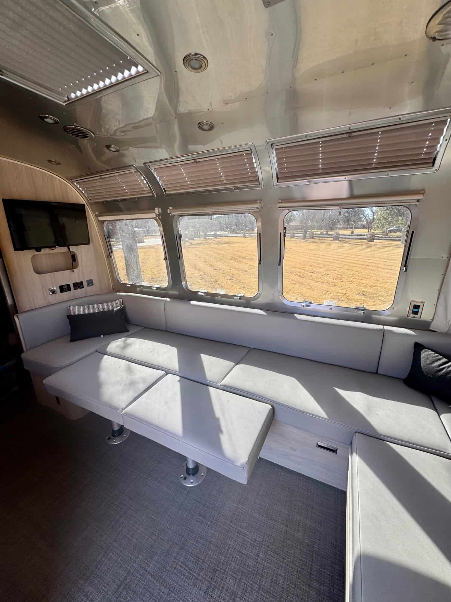This Globetrotter has every upgrade available including an upgraded solar panel option, all 3 awnings– Zip Dee Relax Automatic Awning, Stainless steel 3 burner cooktop + oven, microwave, Brandi cooling vent w/light, 10 cu ft Electric refrigerator, tankless water heater, fantastic fan (in the galley), 2 Dometic AC units (ducted throughout the Airstream).