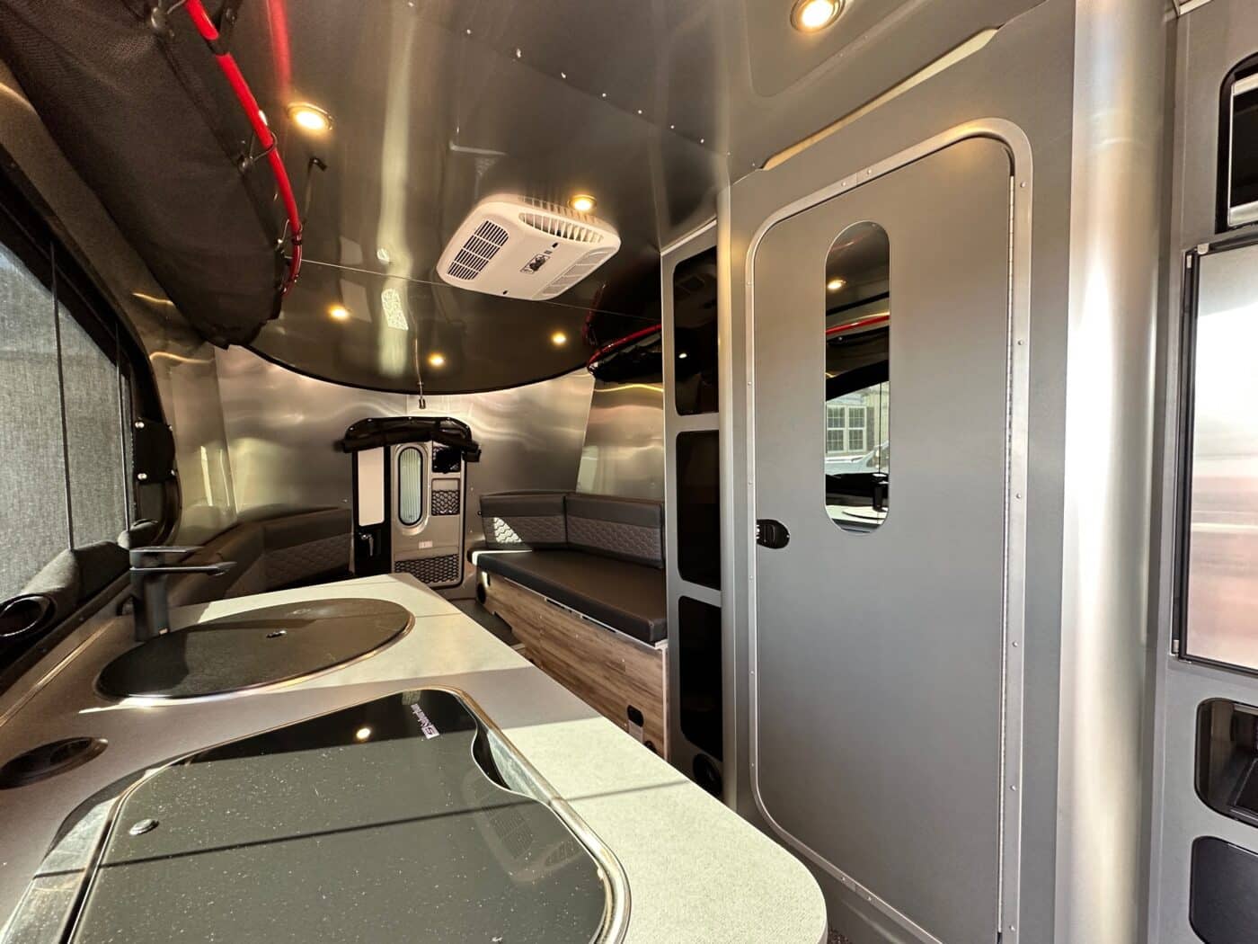 This Basecamp also offers front panoramic windows, storage above the propane tanks, solar panel input, and a steel entry step. There is also a full-size spare tire, cast aluminum LED taillight and a rear hatch allowing you to take your snowboards, skis, paddleboards and/or kayaks, plus an exterior shower and optional solar panels.