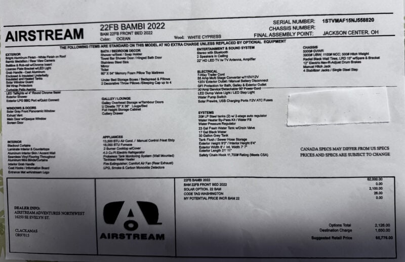 I Liked the simplicity of the Bambi, but added these important upgrades: electric hitch, 200 additional watts of solar ( came with 100) 2 Battleborn batteries installed inside under bed, snap pads for the stabilizer jacks, shelf inside the propane case for more storage. all new rhino sewer hoses. also, an airstream fitted bed pad.