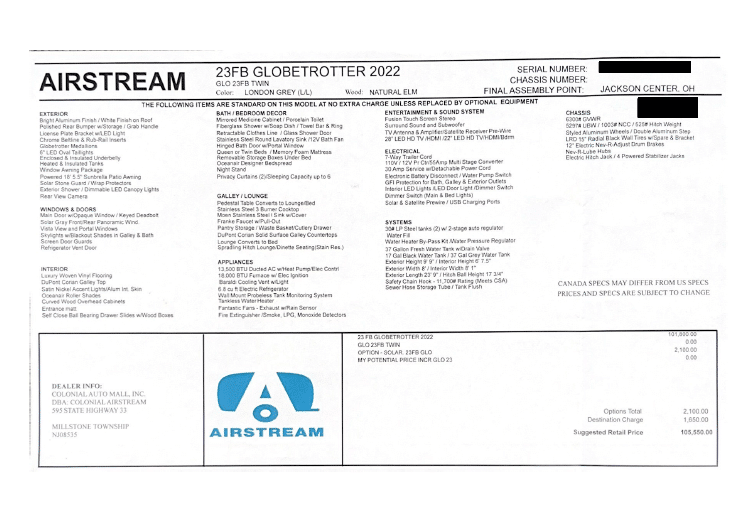 OBO. Very well maintained 2022 Airstream Globetrotter 23FBT w/ Natural Elm and London Grey Interior Décor ready for summer travel. This was the last model year for the Globetrotter 23 ft floorplan. The twin bed option creates a more spacious open floorplan and is great for taller people. Approximately 8500 miles driven. Tires rotated & inspected in January 2024. Original bedding in factory condition (bagged upon initial purchase). The extended EasyCare warranty is transferable and expires on 08/30/2027 (or can be negotiated off of the sale price if not wanted) and the 3-year Airstream Limited Transferable Warranty and 3 years of Coach Net 24/7 Roadside Assistance expire on 08/30/2024.