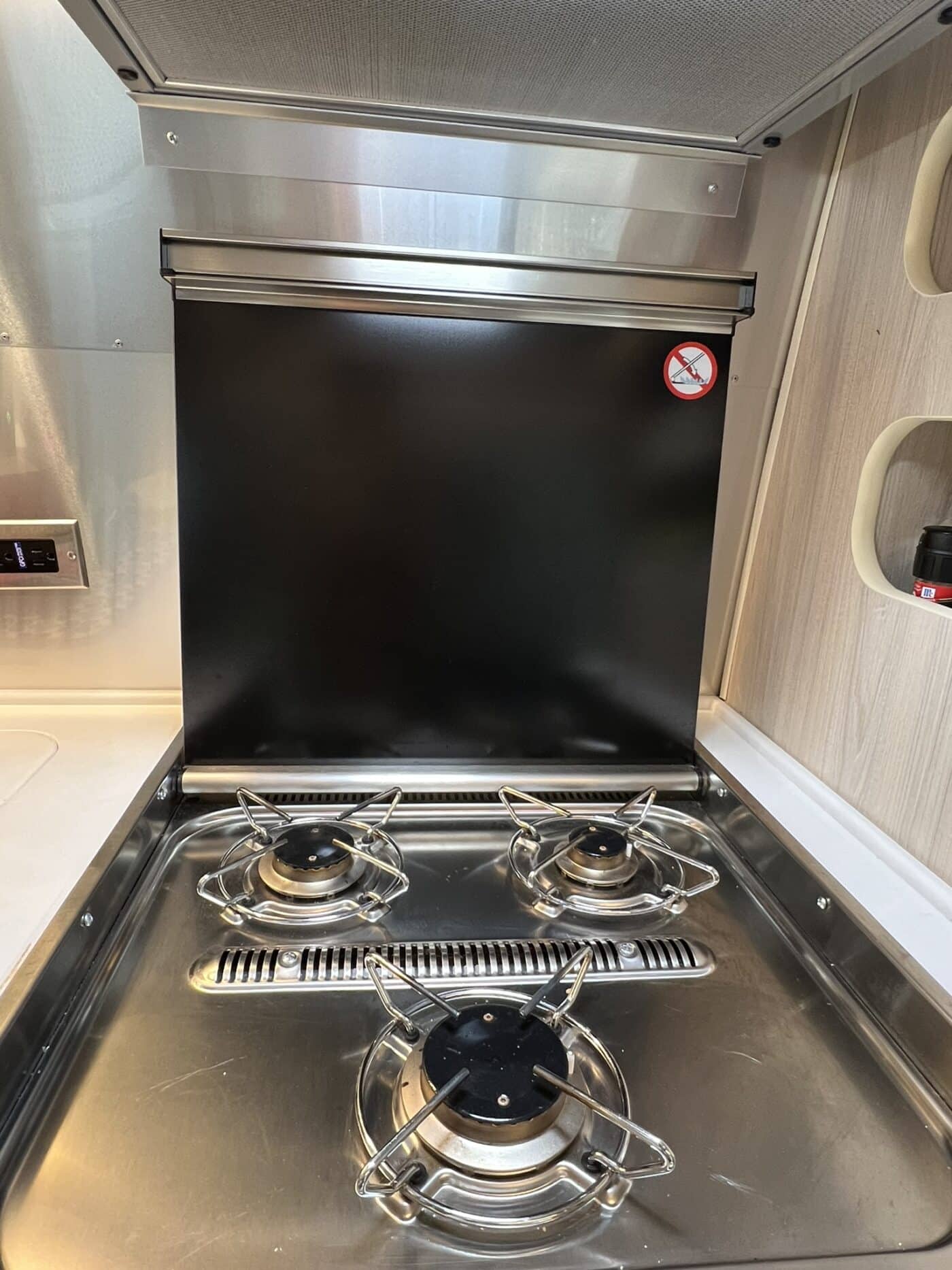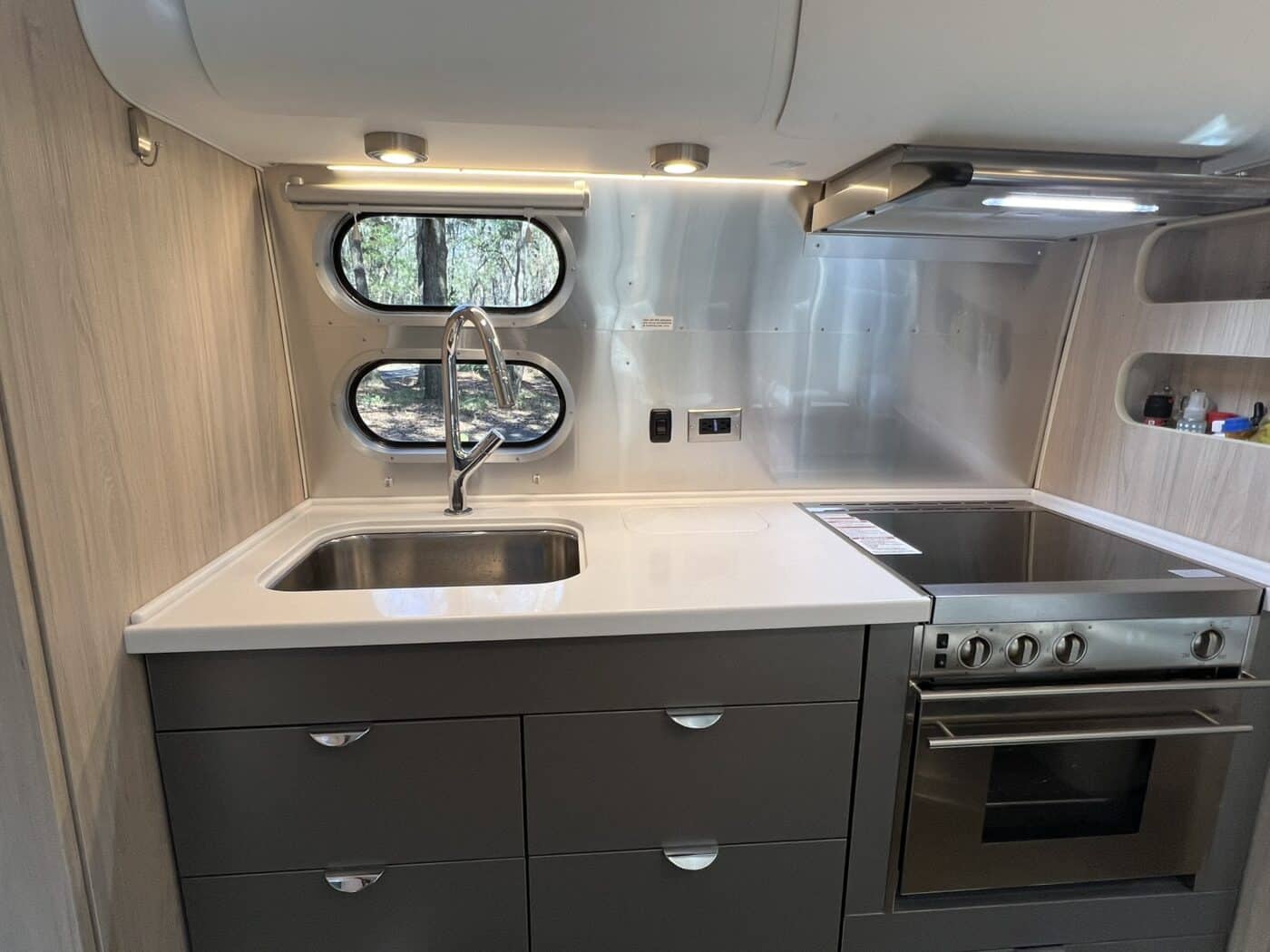 The galley contains a 3-burner gas stove, propane oven (perfect for off-grid) and kitchen sink with cover for additional counter space when needed. The large electric refrigerator/freezer has plenty of room for all essentials.