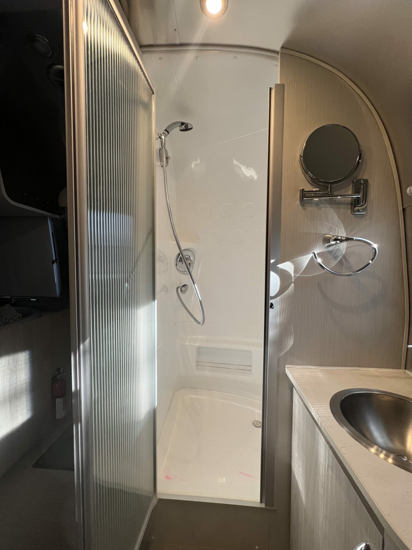 The bedroom has the twin bed configuration with storage below and cabinets above the beds, which makes the interior seem visually larger. All above cabinetry has automatic lighting and a mirror placed so you can easily see what is in each cabinet. The wall mounted TV can be turned to allow watching from the galley/dinette or from the bed area. The rear bathroom features a walk-in shower, bathroom sink with medicine cabinet and storage below the sink along with the toilet.